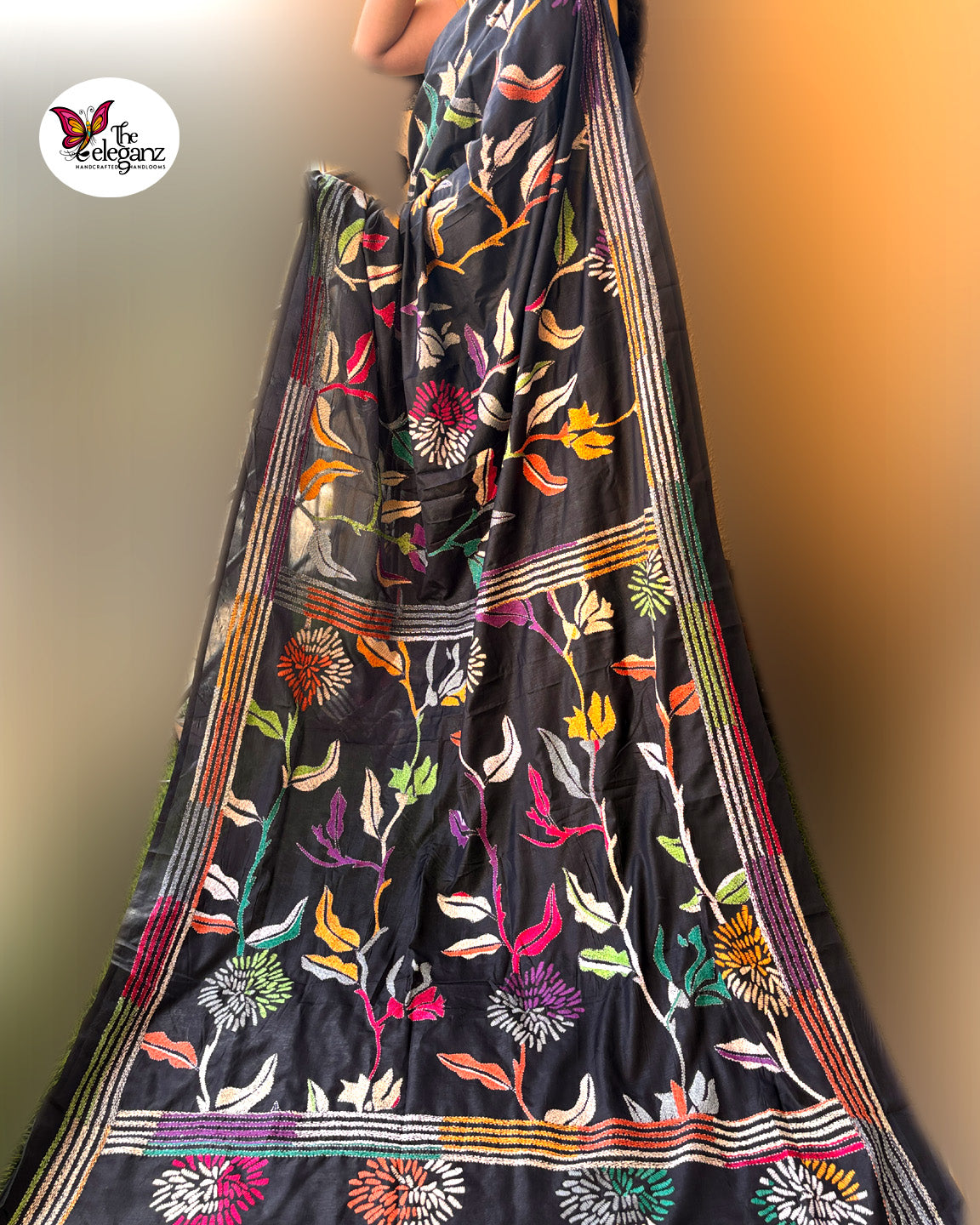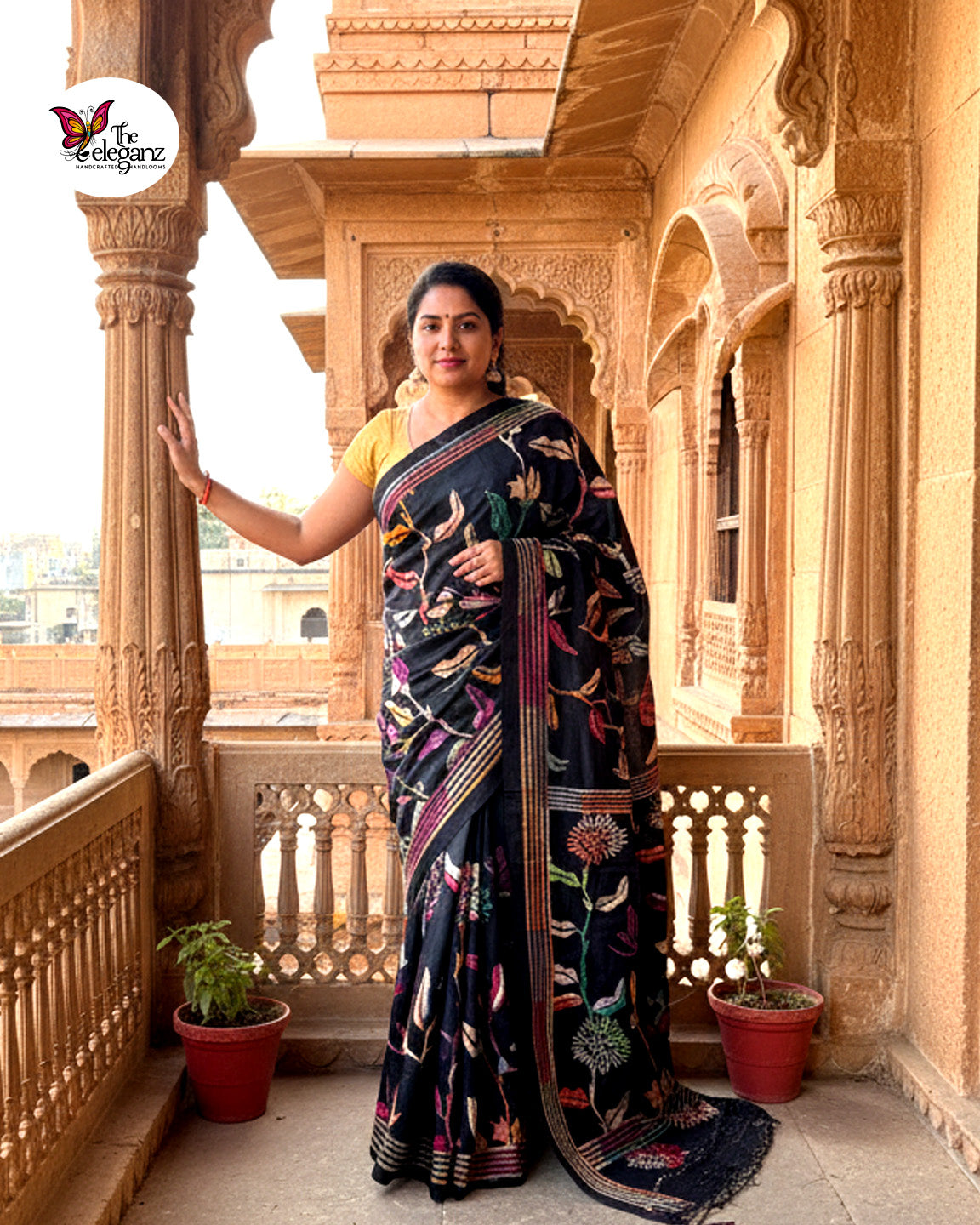 The deep black base enhances every stitch, giving the saree a striking contrast and a rich, elegant finish. Lightweight yet luxurious, Pallavi is perfect for women who love wearable art and appreciate the beauty of slow, hand-crafted textiles.