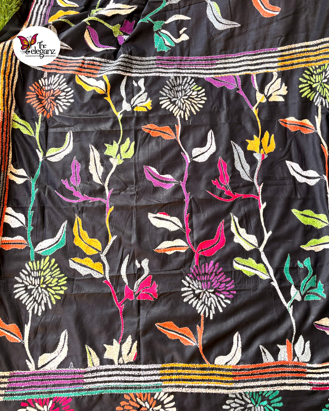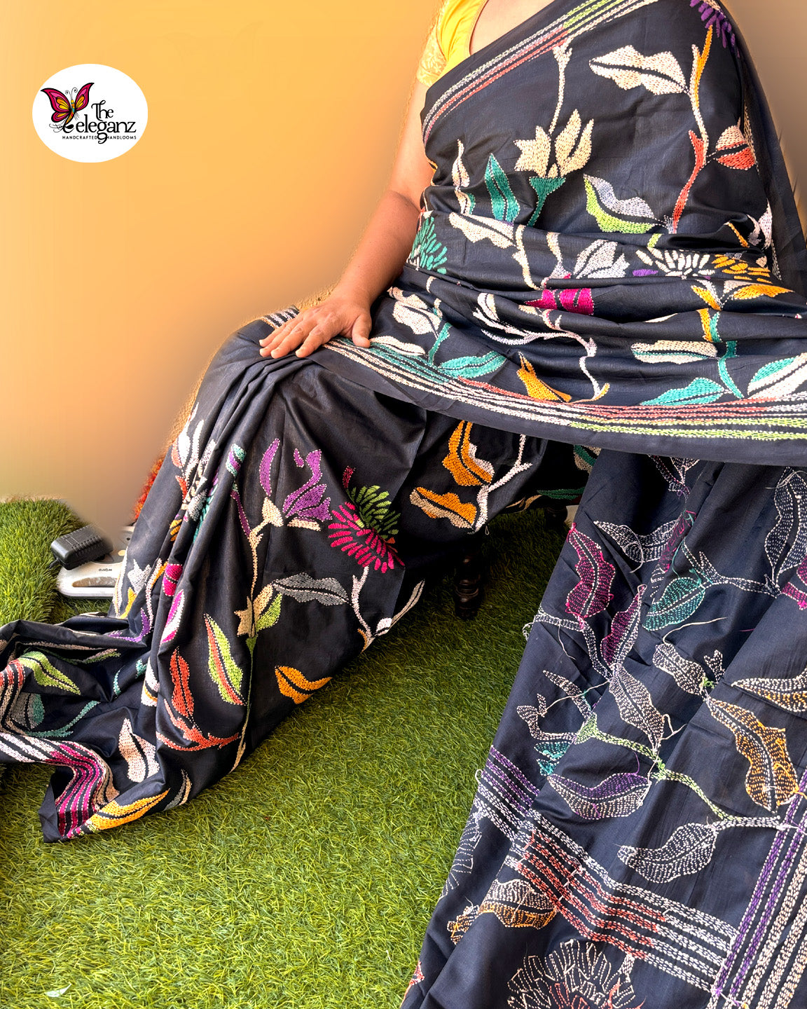 Pallavi is a vibrant ode to nature’s artistry. Crafted in premium blended Bangalore silk, this saree is adorned with exquisite hand Kantha stitch work, featuring cascading leafy vines and blooming florals in radiant multi-coloured threads.
