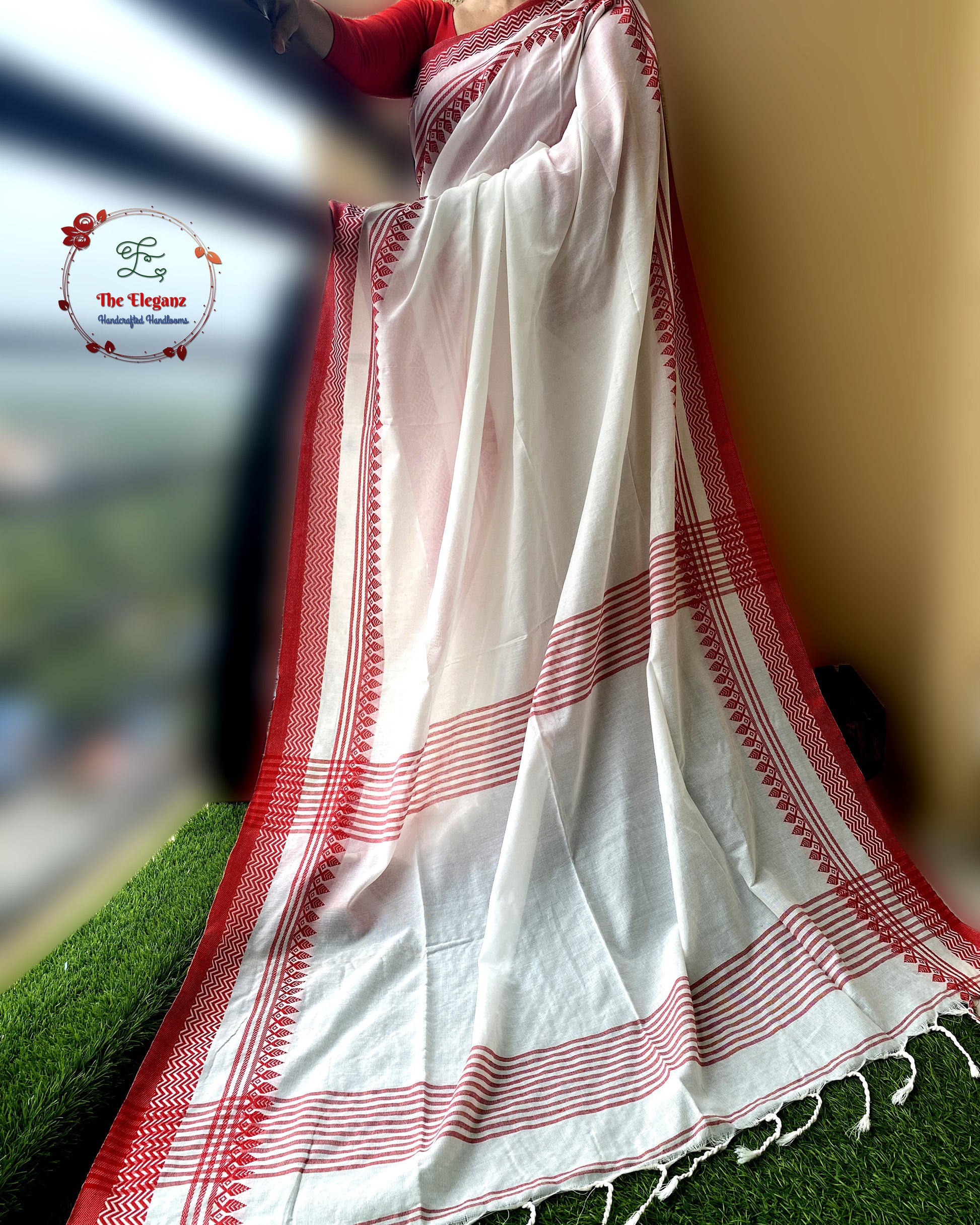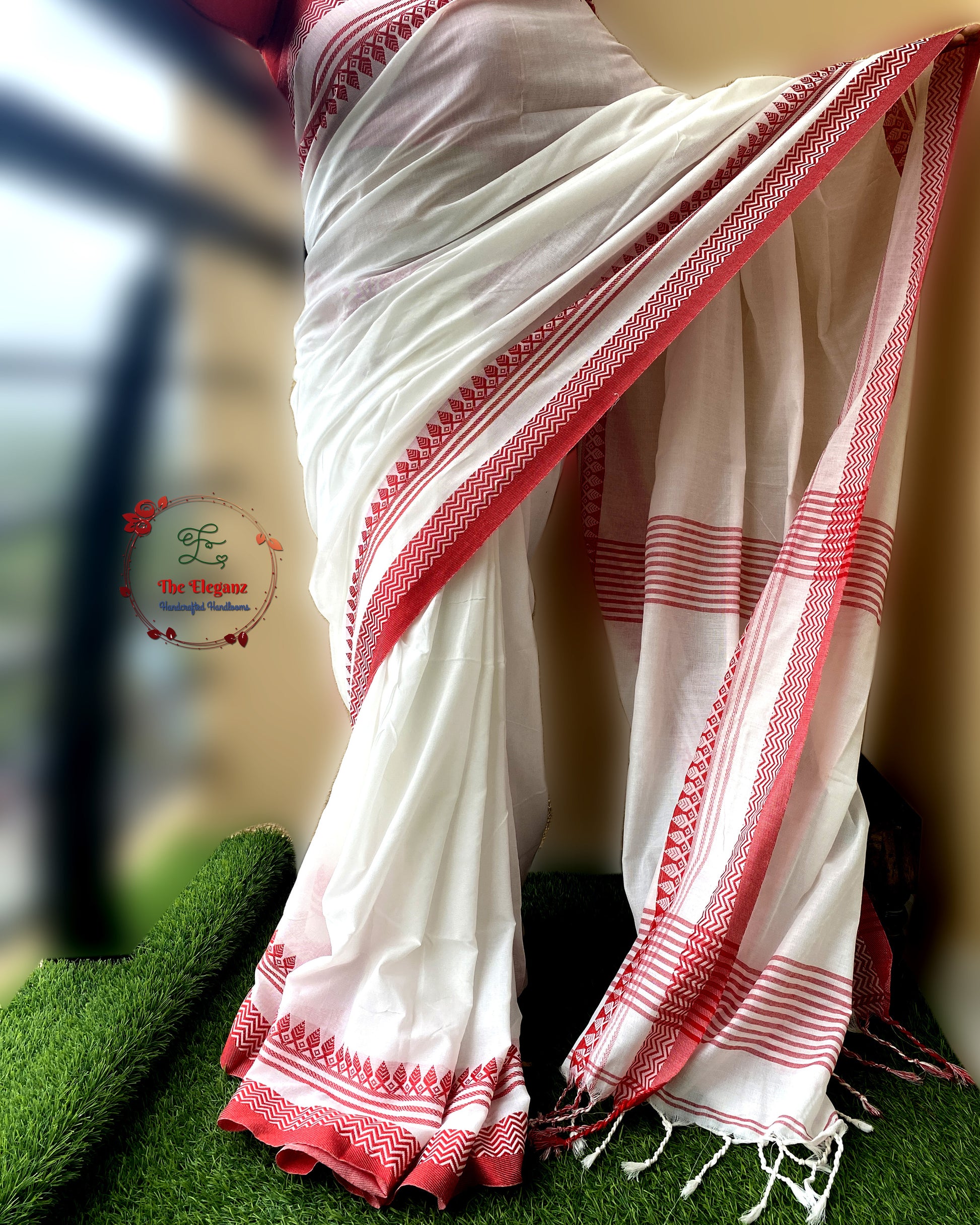 Pradeeptaa is a radiant drape of purity – where the glowing white canvas meets the vibrant red borders in rhythmic harmony. Adorned with fine woven patterns, it carries the grace of Bengal’s timeless festive attire, echoing the glow of lamps and the spirit of celebration.