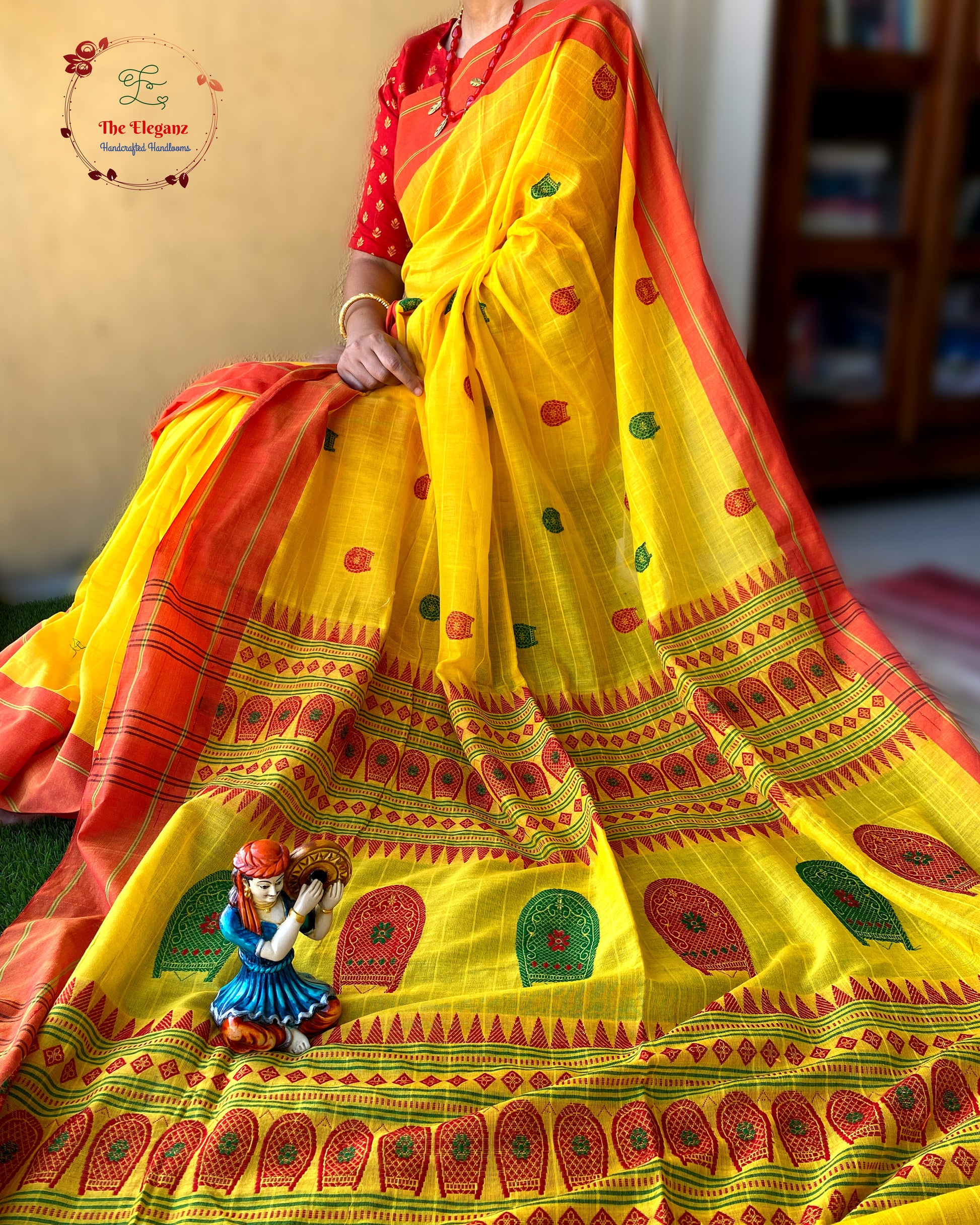 The Kulo Pushpanjali Premium Cotton Saree is a radiant handloom drape celebrating Bengal’s age-old kulo motifs, symbolic of prosperity and devotion. Woven on a golden-yellow base with red and green butis, and framed by intricate borders with an orange pallu, this saree is steeped in tradition yet glowing with festive vibrance. A perfect choice for pujas, cultural occasions, and celebrations.
