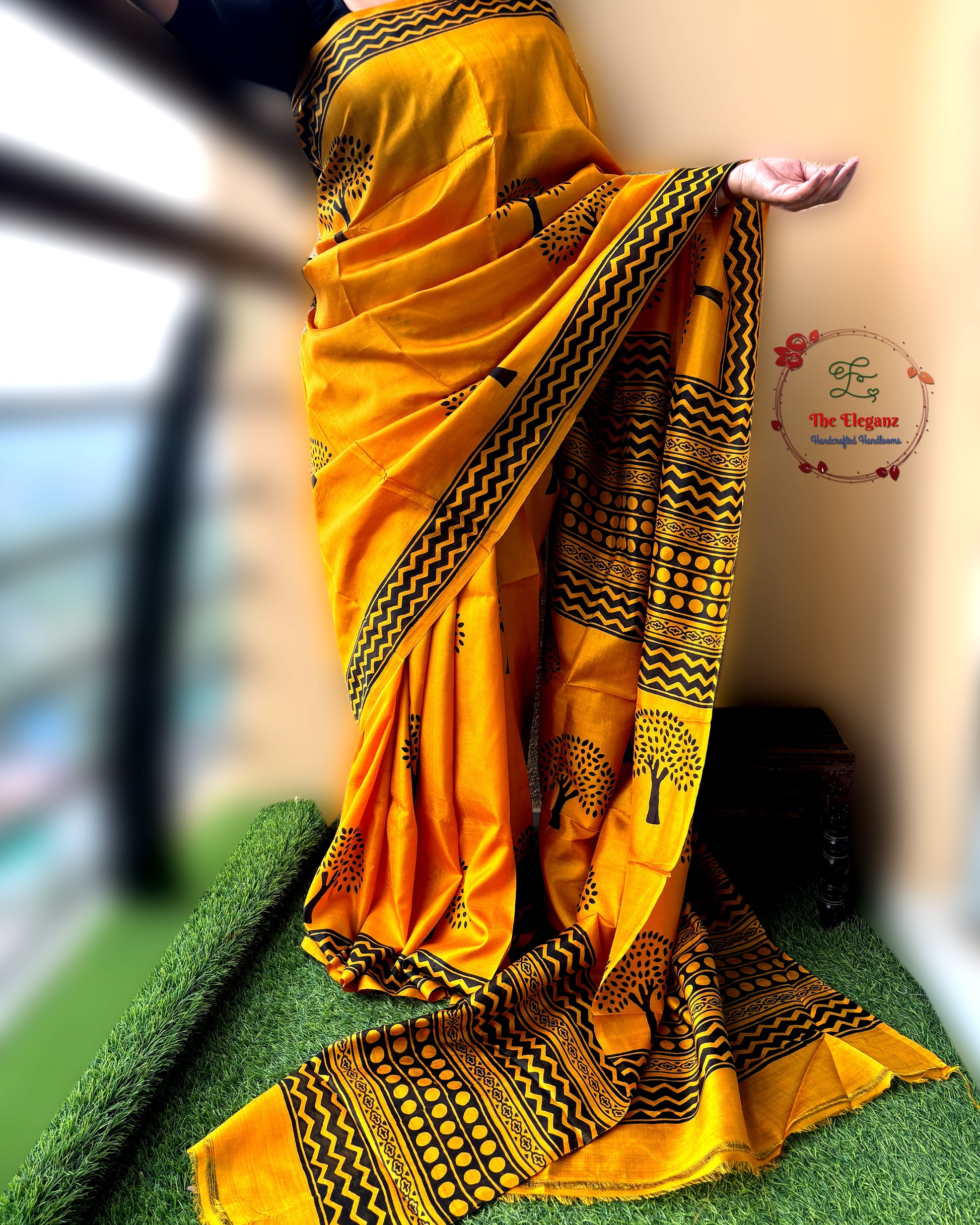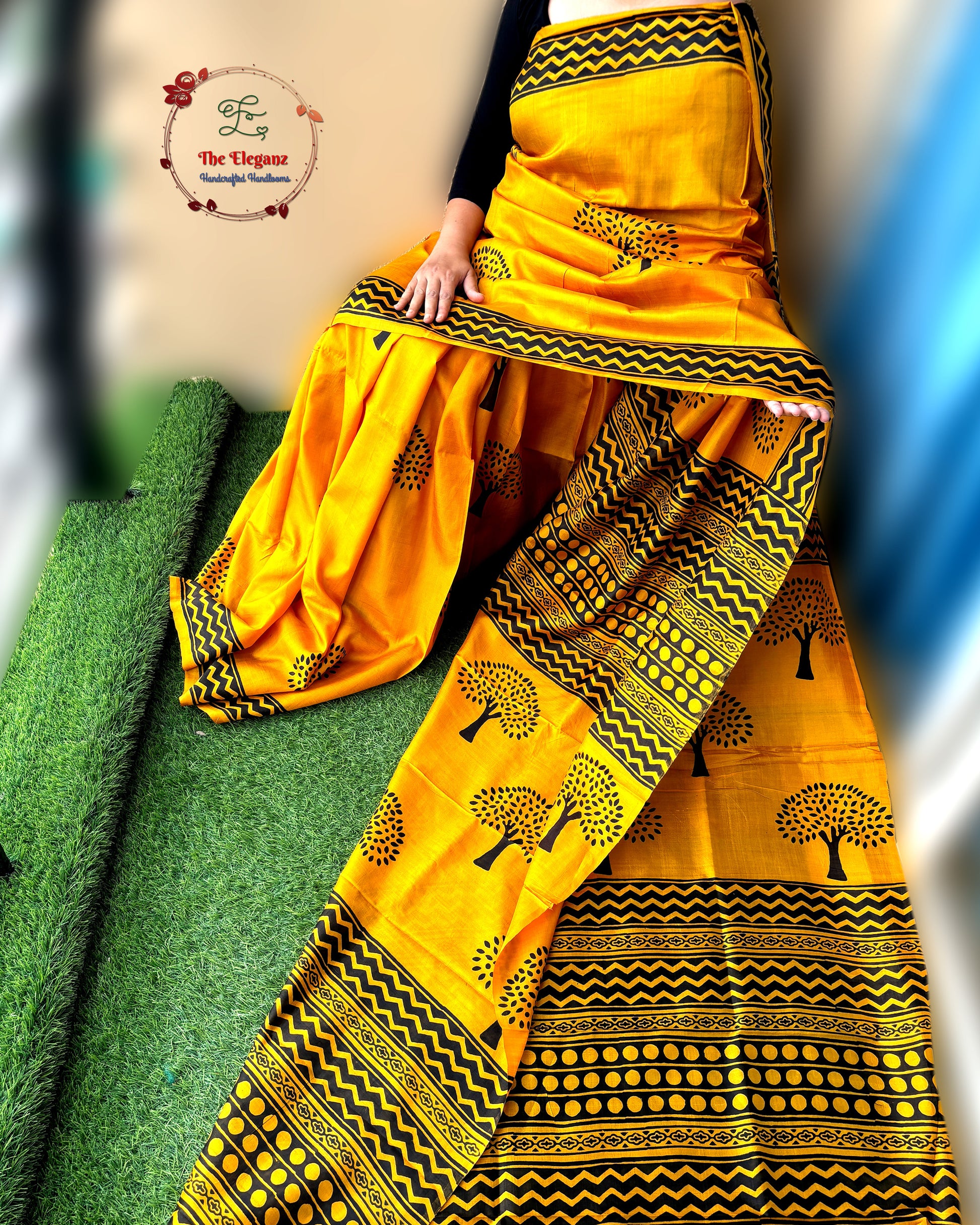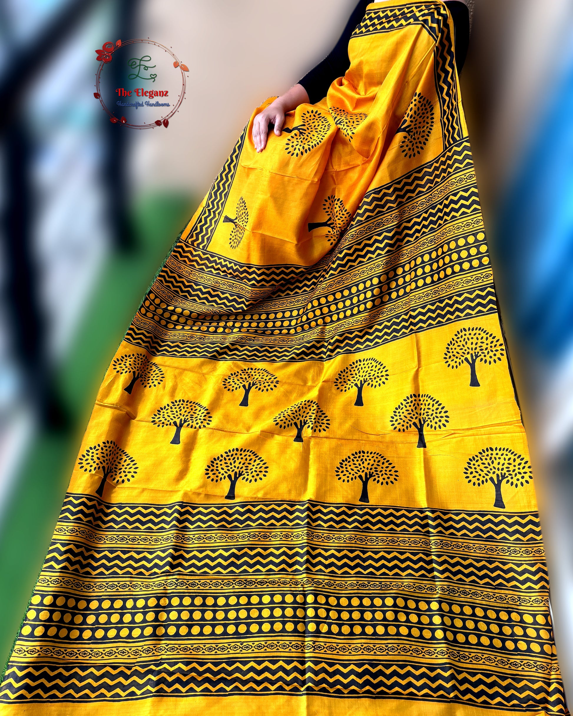 Where sunshine meets earthy elegance - adorned with tree motifs and bold tribal patterns, perfect for statement festive dressing.