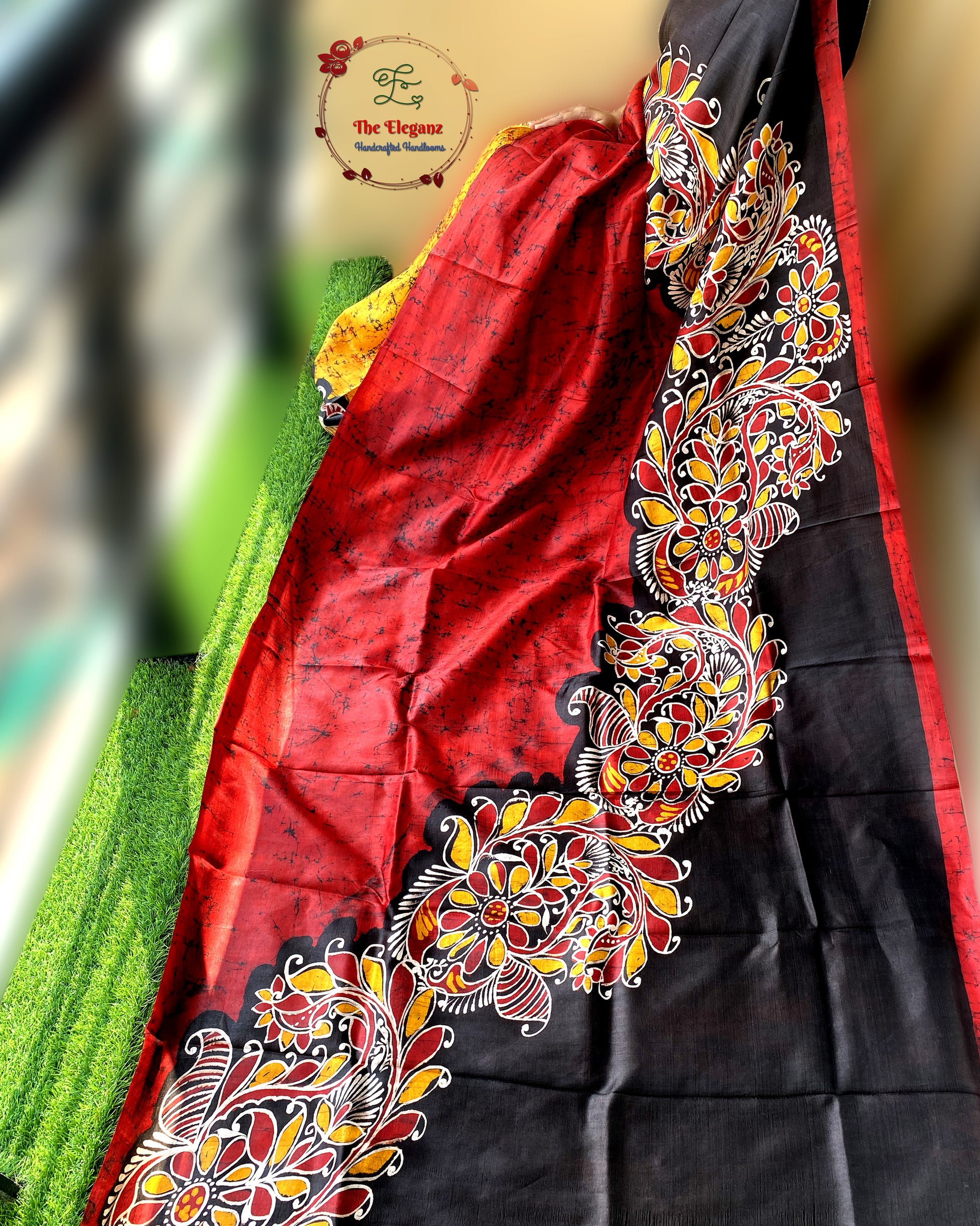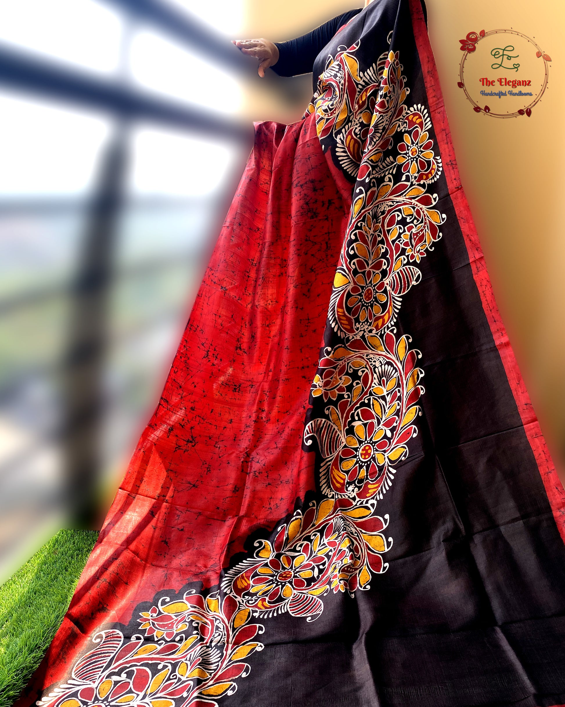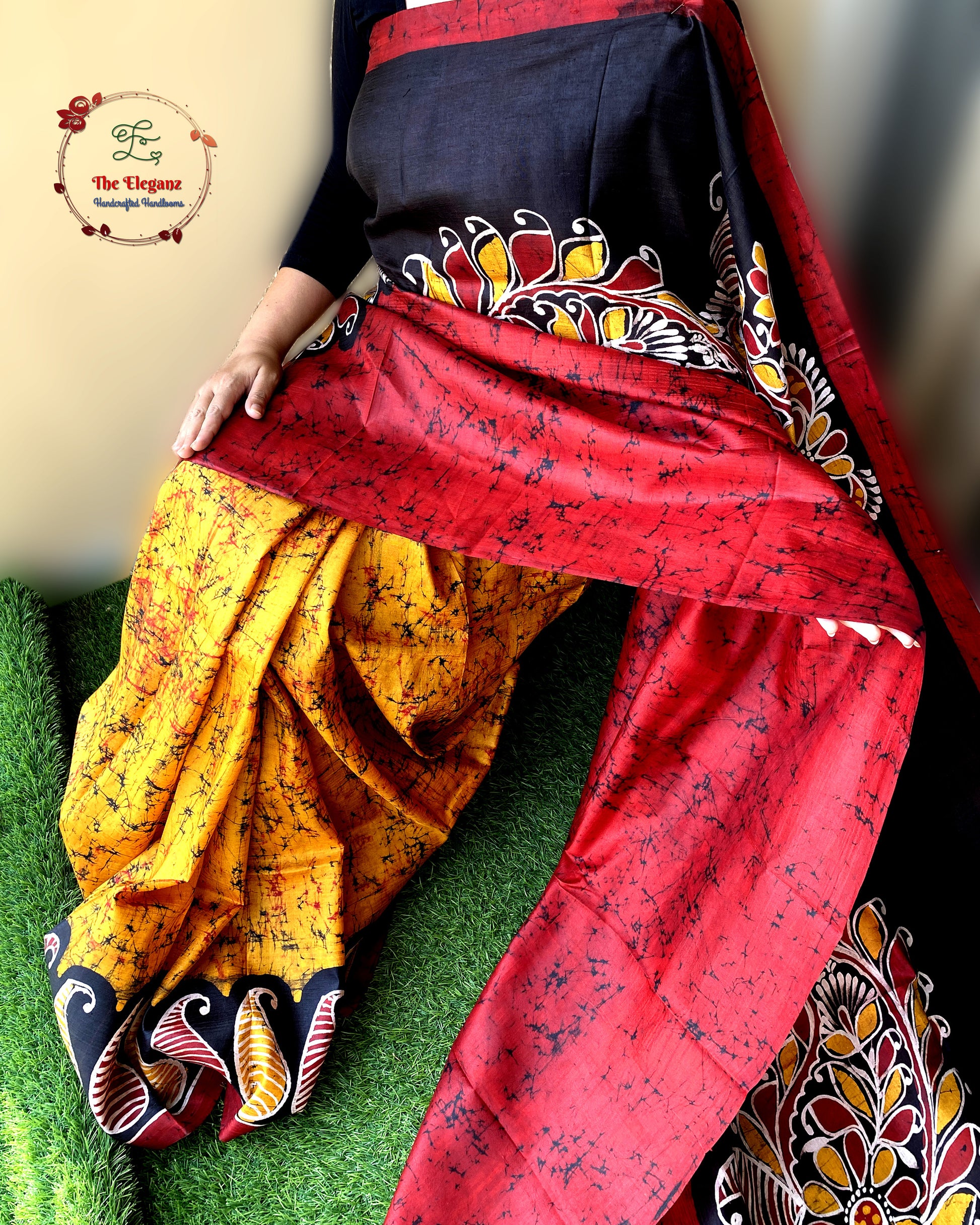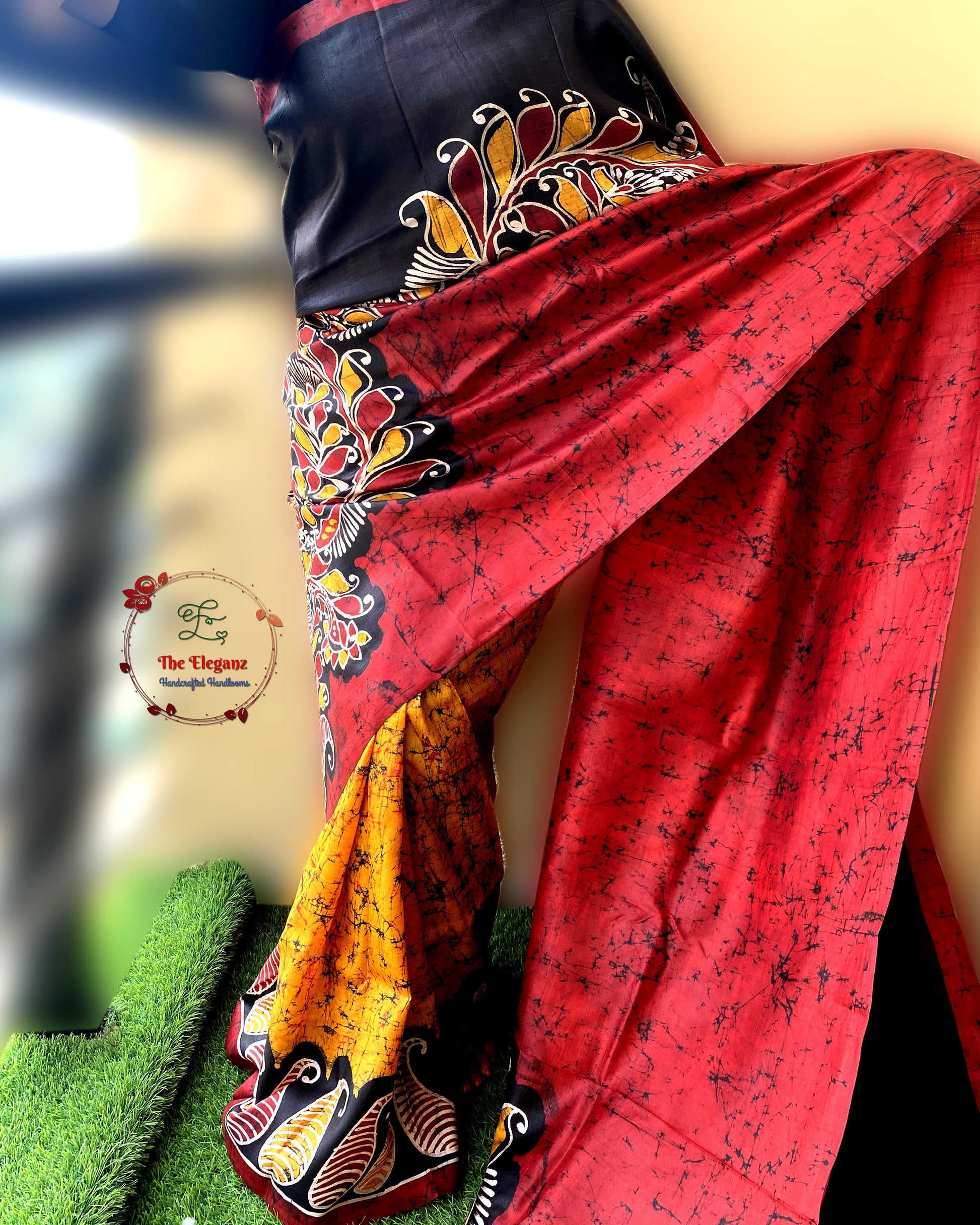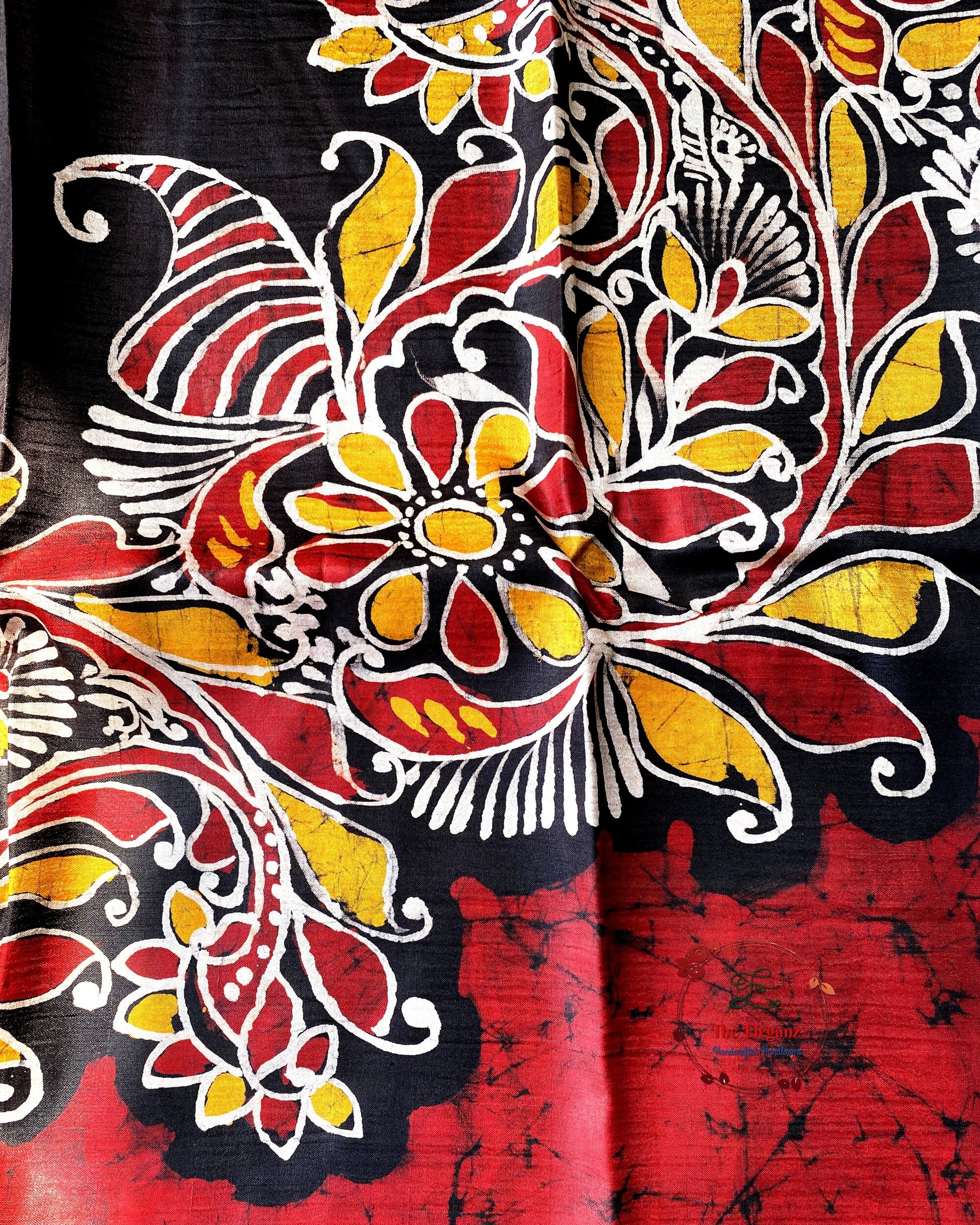 The Rakt Kamal Bishnupuri Batik Silk Saree is a masterpiece of Bengal’s hand-painting tradition. Crafted from pure Bishnupuri silk, it features the age-old Batik resist-dye technique, where every motif is hand-drawn with wax before being dyed. The vibrant red body with textured crackle batik patterns beautifully contrasts with the bold black pallu adorned with lotus-inspired motifs in shades of mustard, red, and white, making it a statement piece of wearable art.