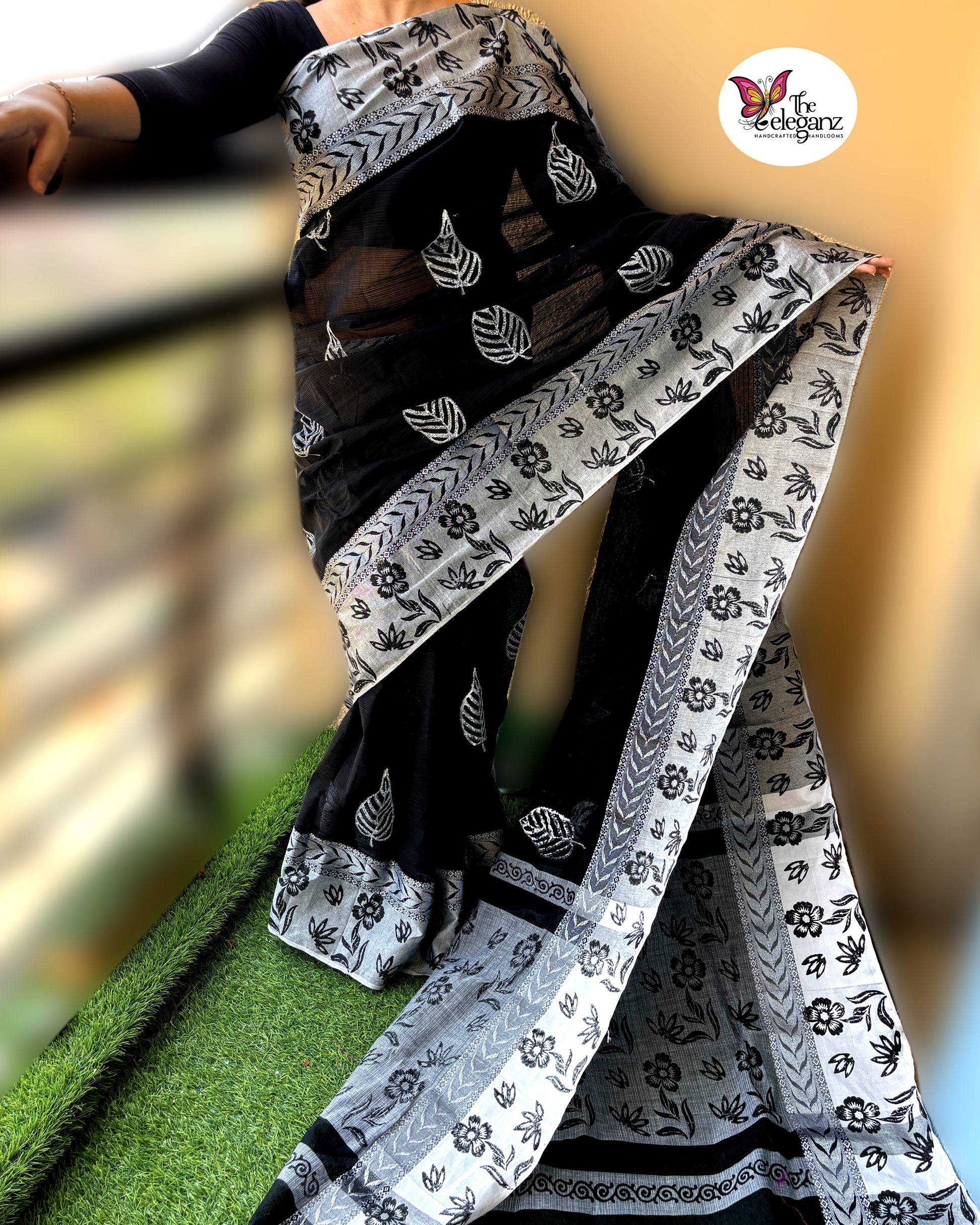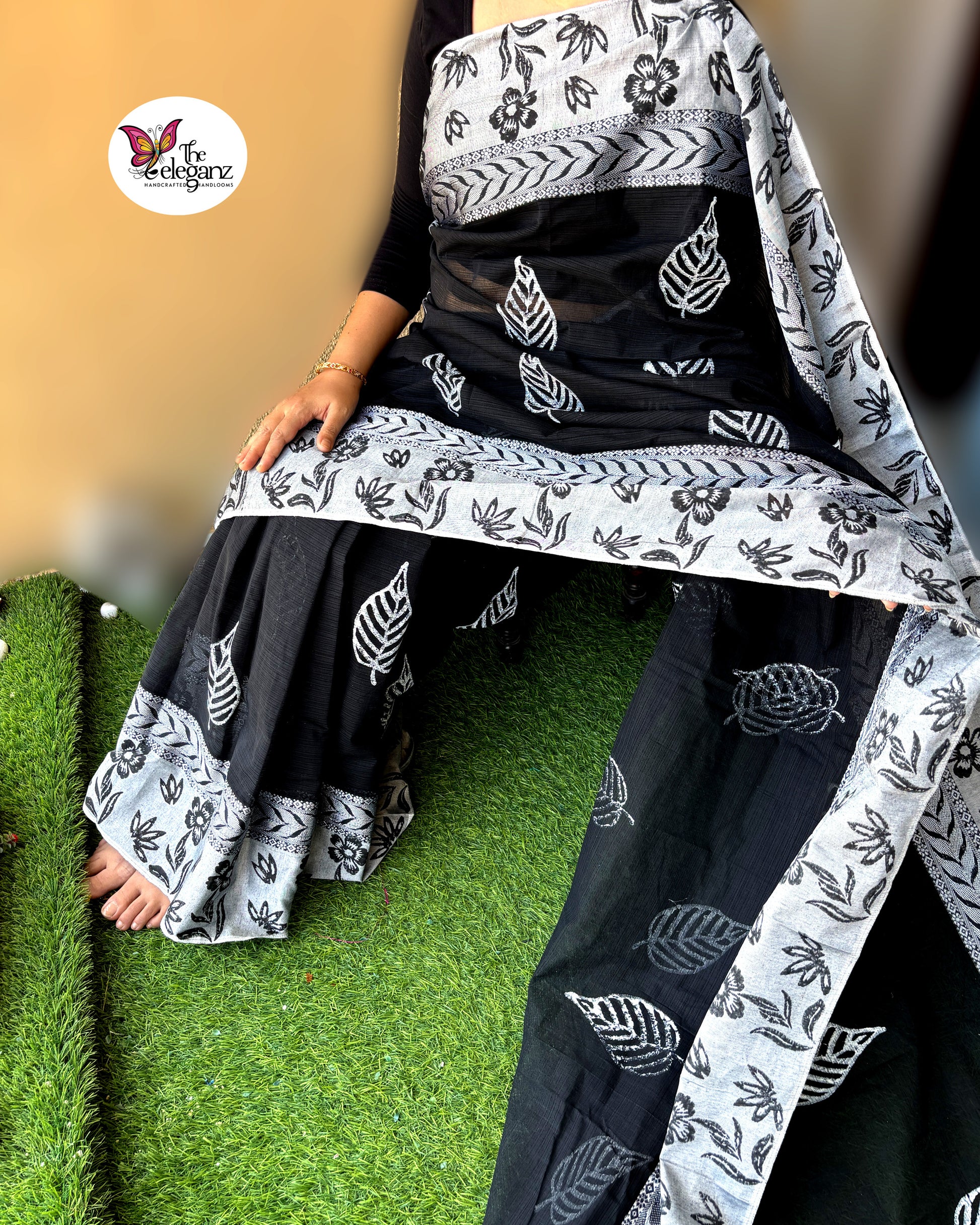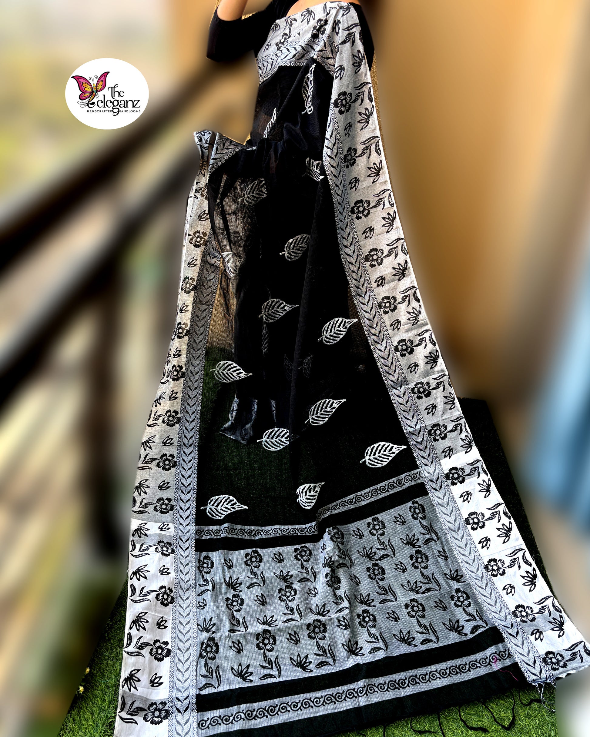 The Shyama Patra Pure Cotton Saree is a graceful play of black and white. Its inky black base is dotted with delicate white leaf motifs, framed by floral borders that add charm and contrast. Light, breezy, and timeless, this saree is perfect for those who love understated elegance with a hint of artistry.