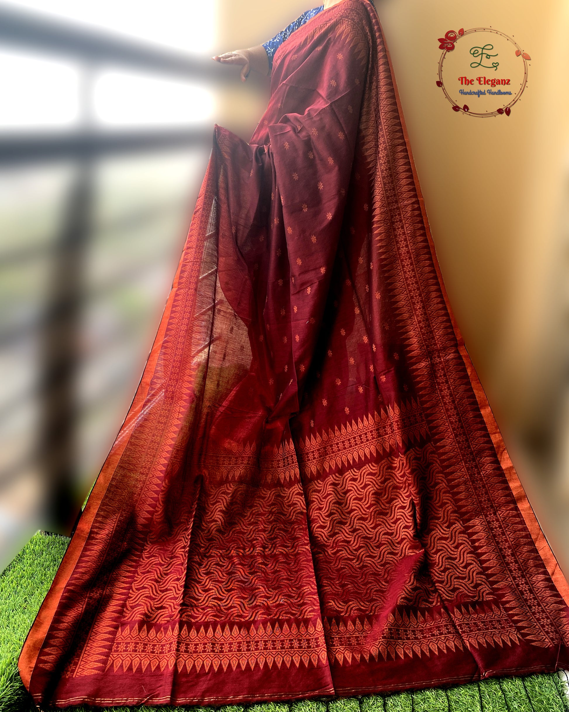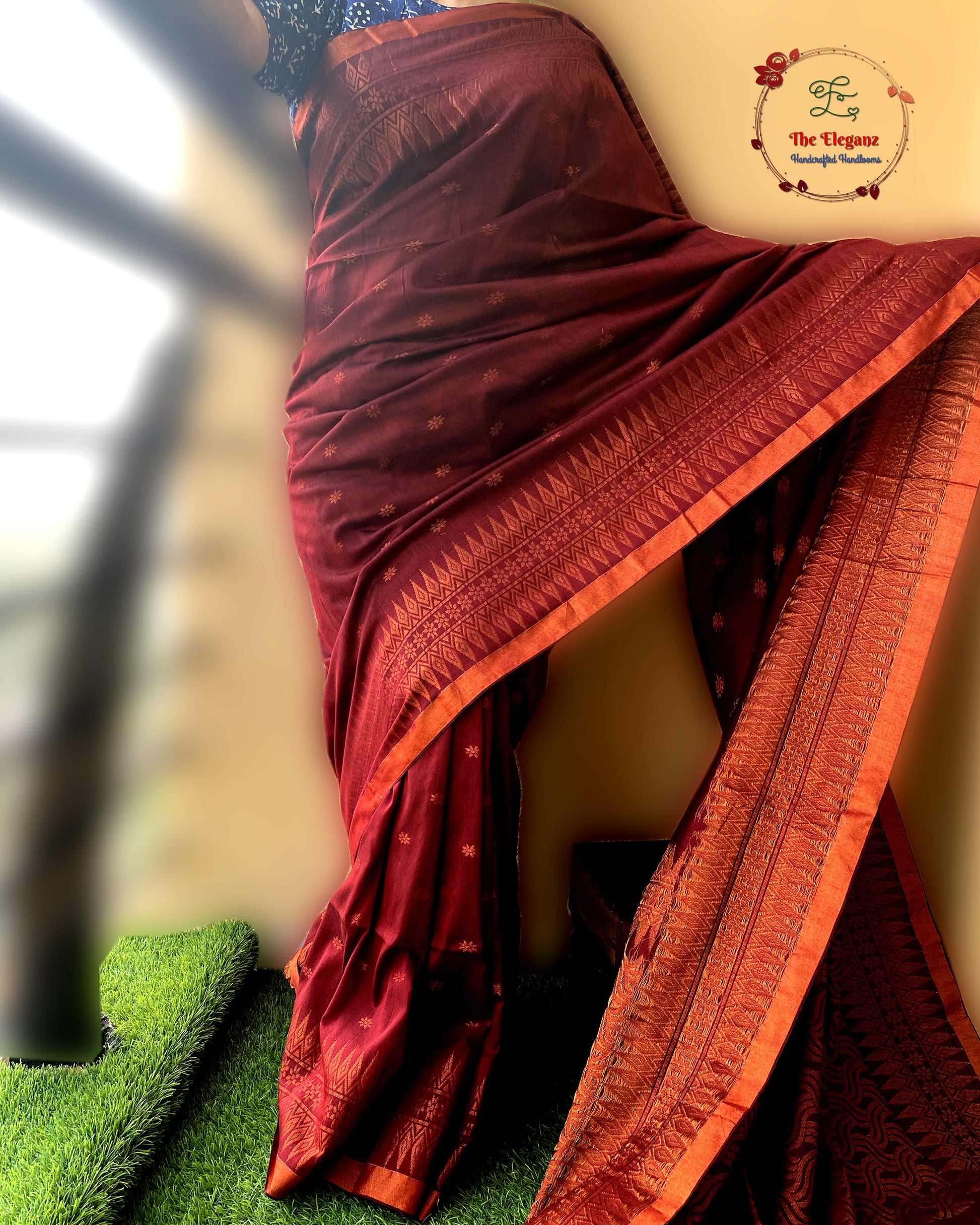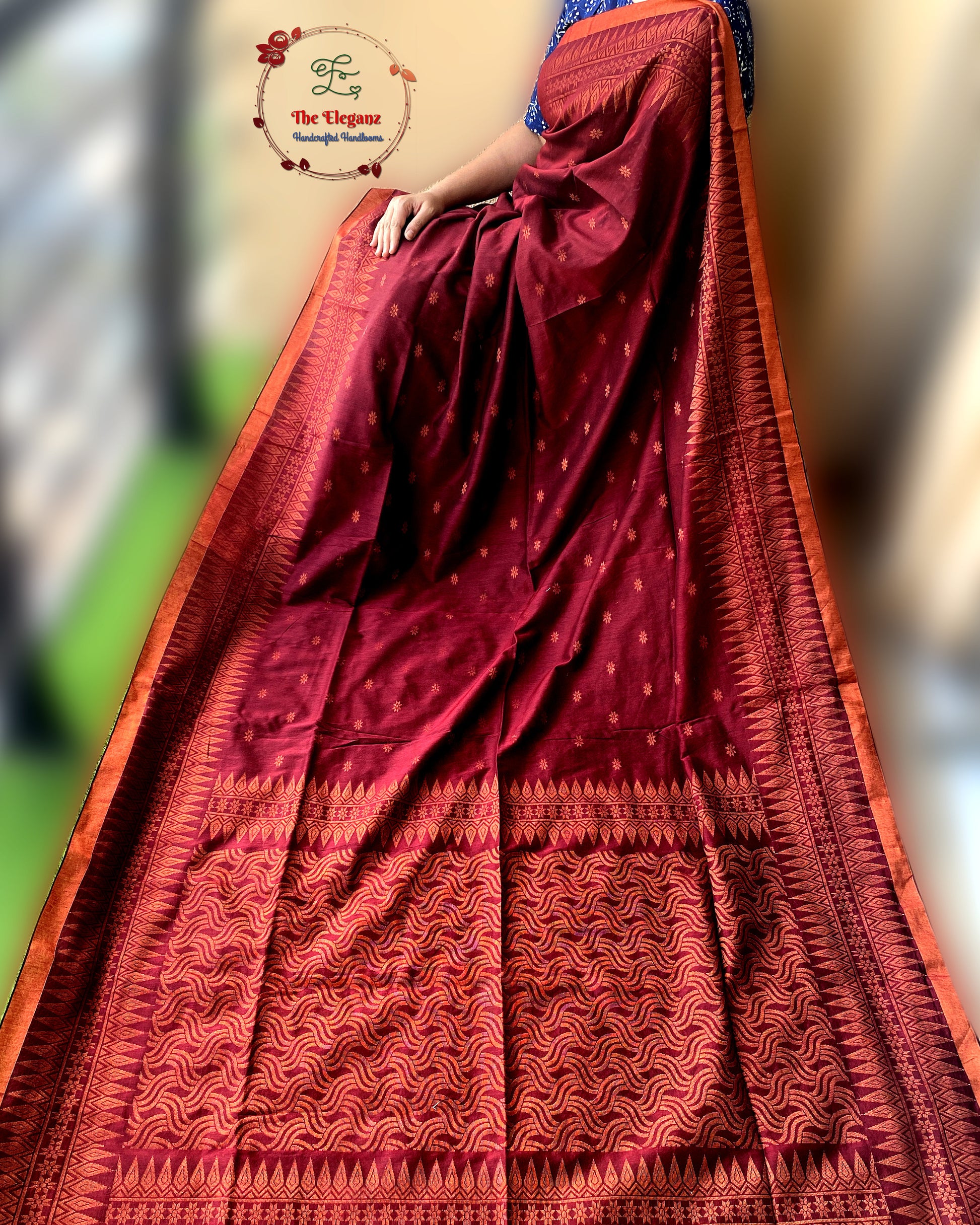 Work: Woven motifs with intricate copper zari border & pallu