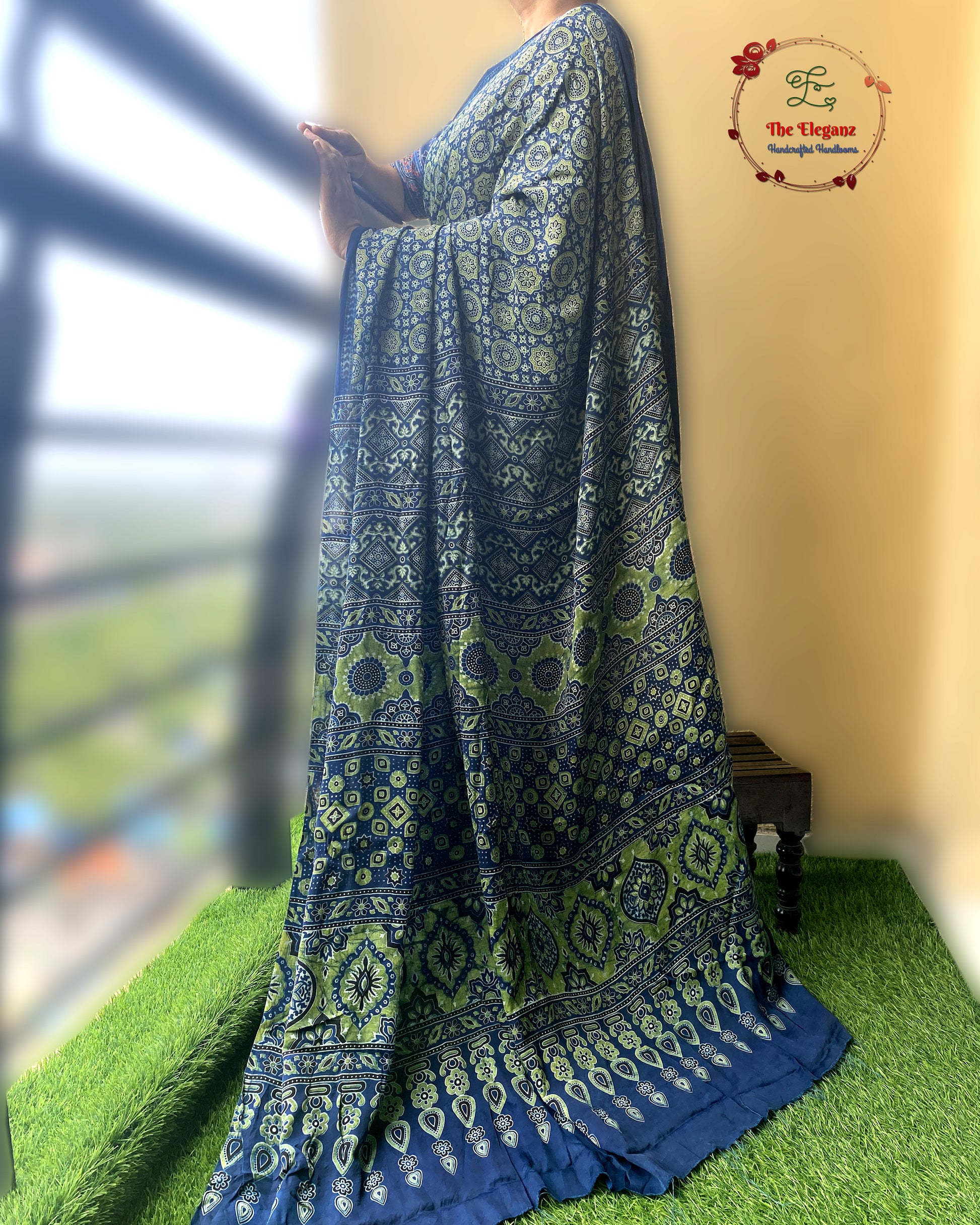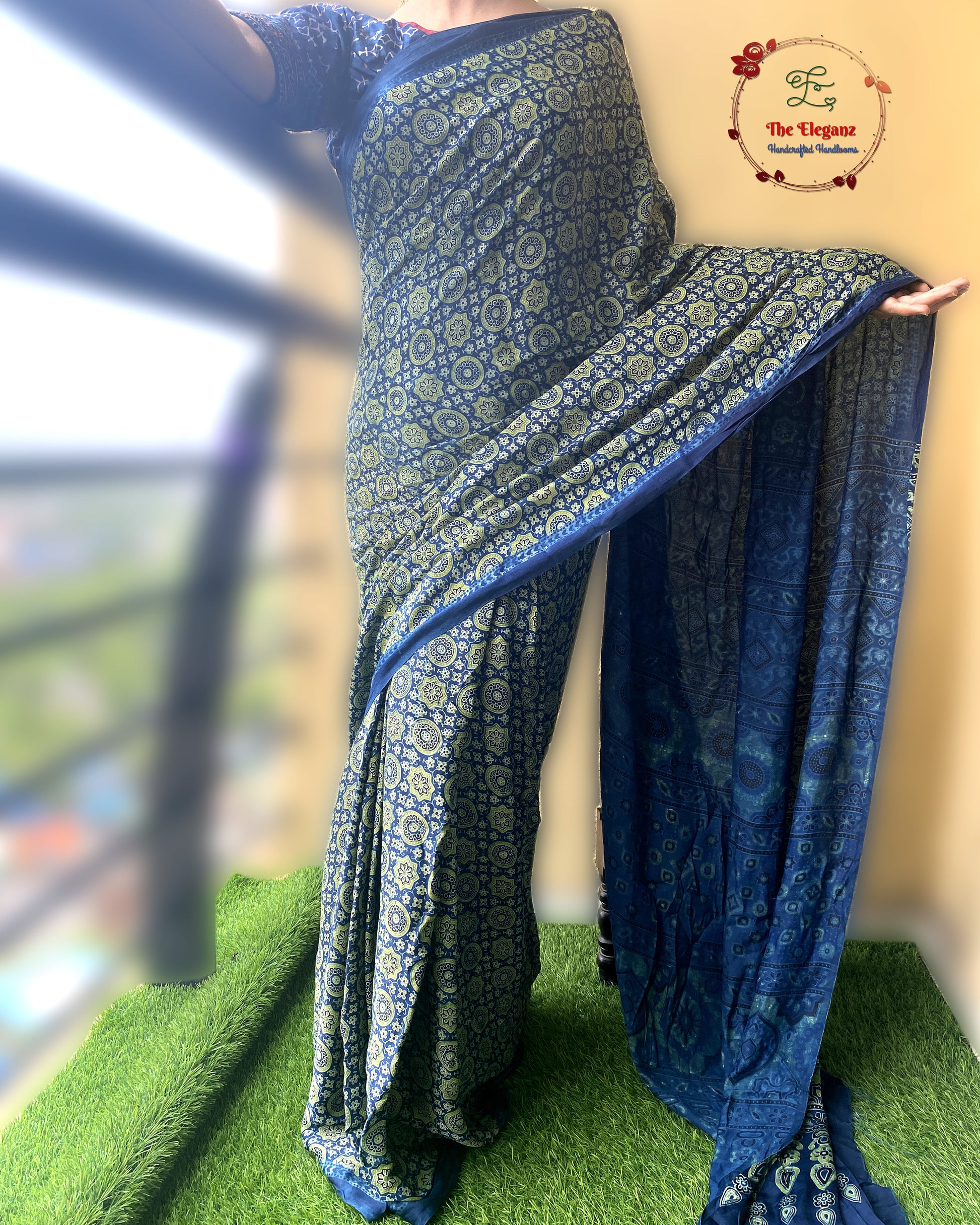 Echoing the earth and sky, this Ajrakh saree in deep blue and green is a symphony of heritage and craft. Hand block printed with natural dyes on pure Modal silk, it celebrates the eternal dance of nature — vibrant, fluid, and timeless.