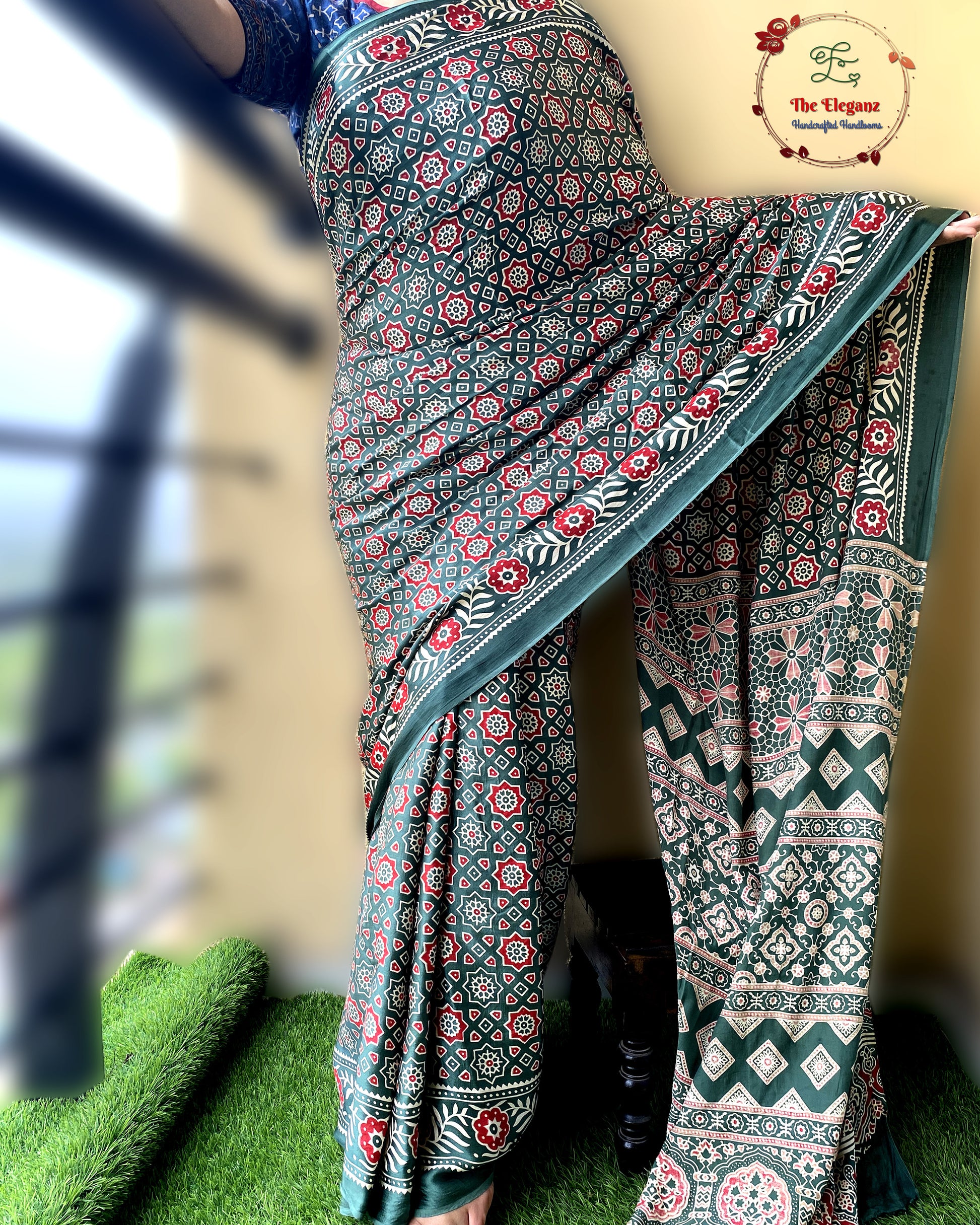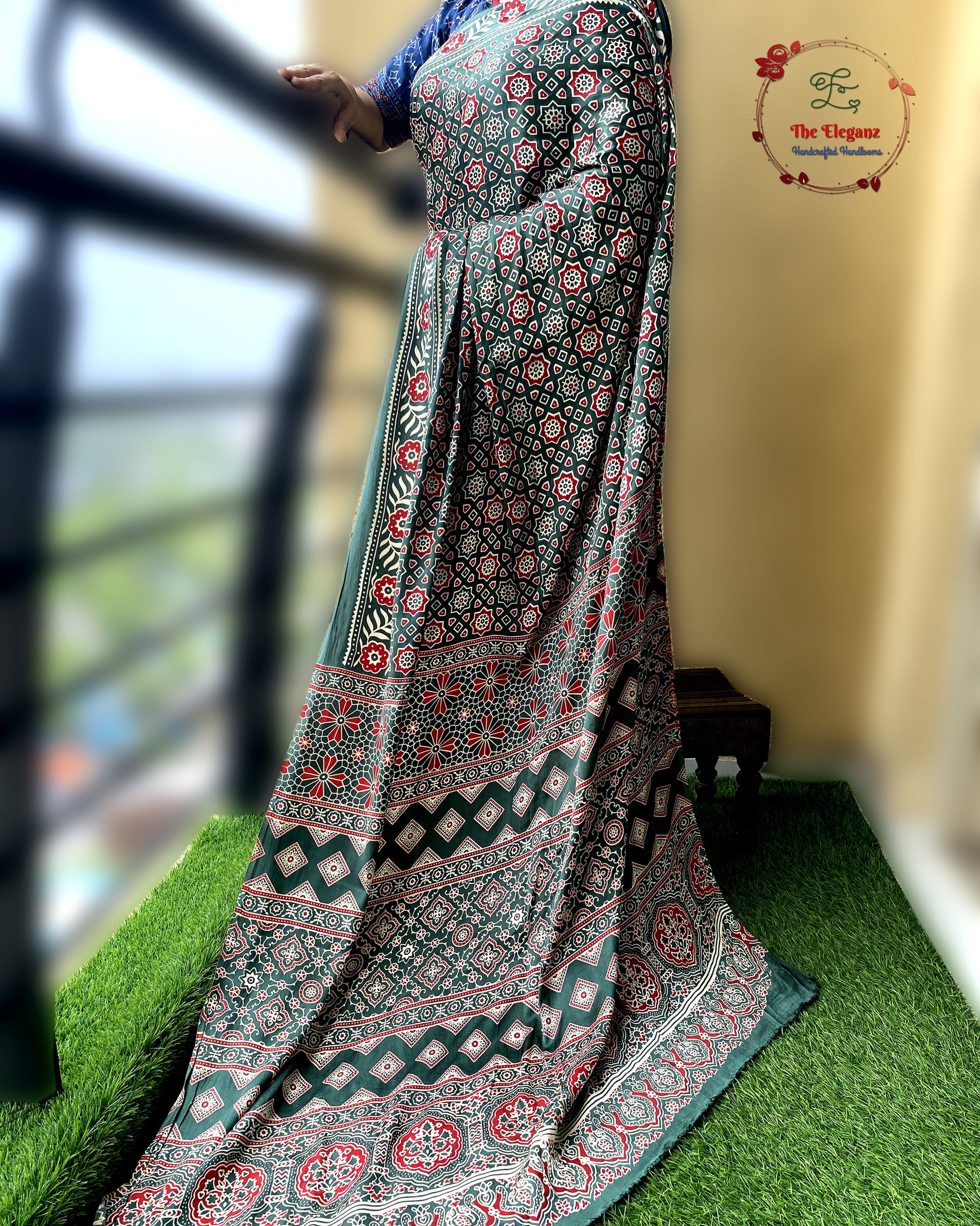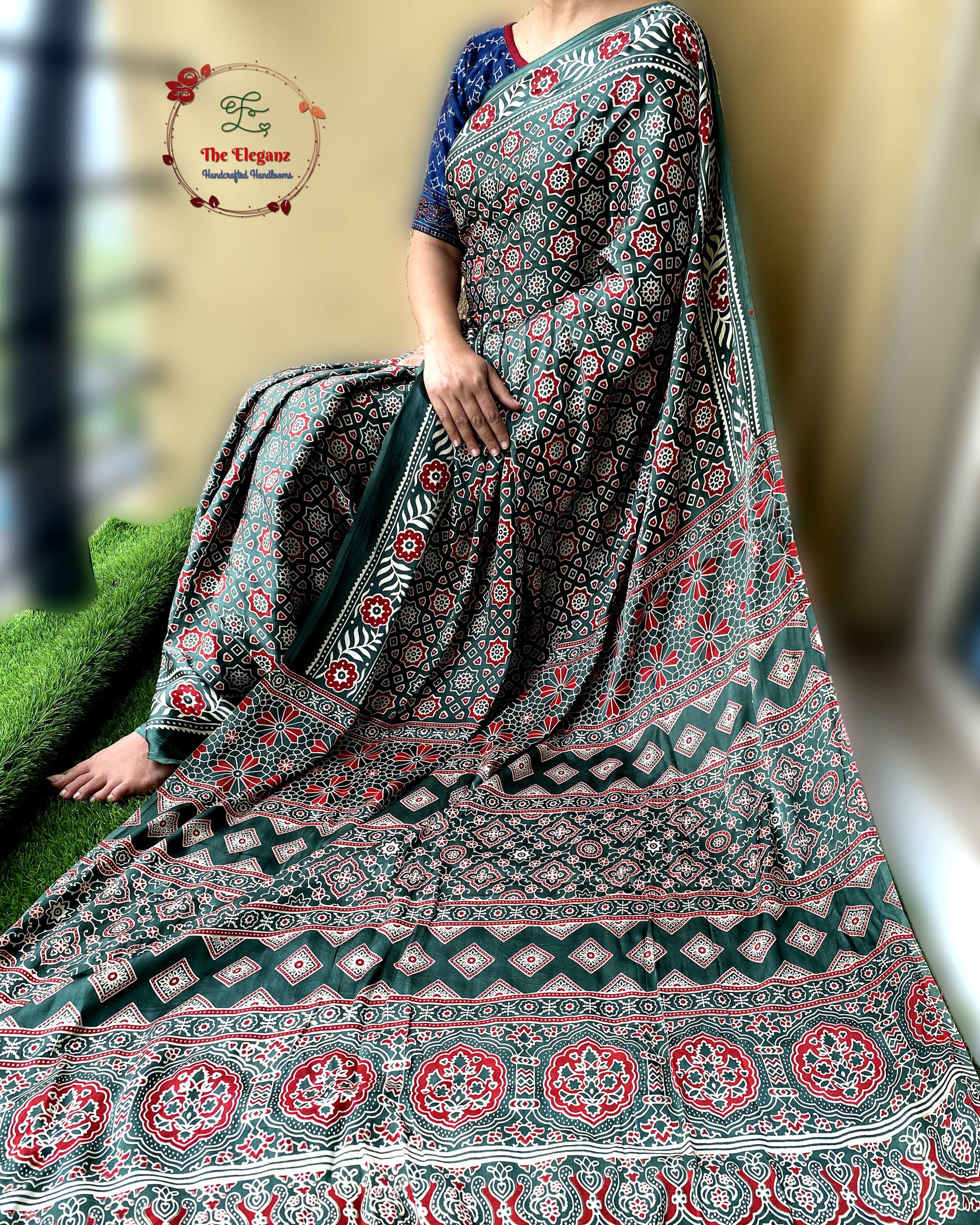 An ode to eternity, Ruhani Ajrakh drapes you in soulful patterns of red and green, where geometry meets grace. Hand block-printed with age-old artistry, this saree becomes more than attire—it is heritage reborn in every fold.