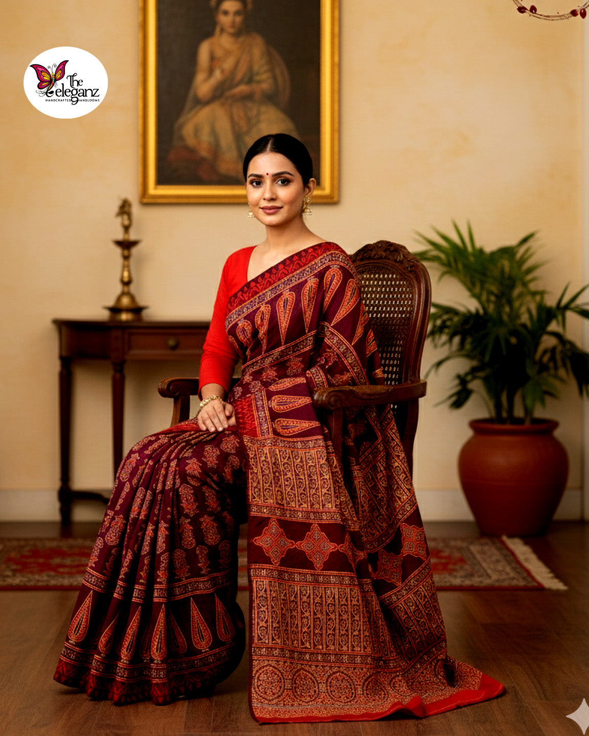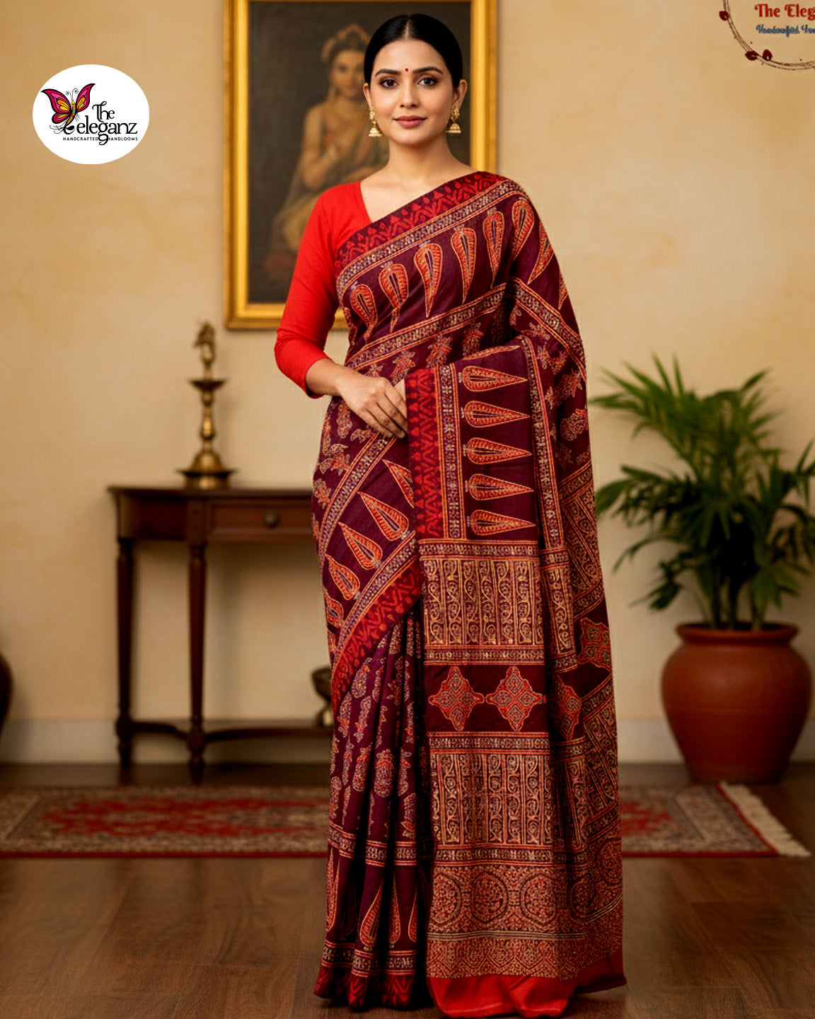 Rich maroon base with detailed paisley, floral & geometric Ajrakh motifs