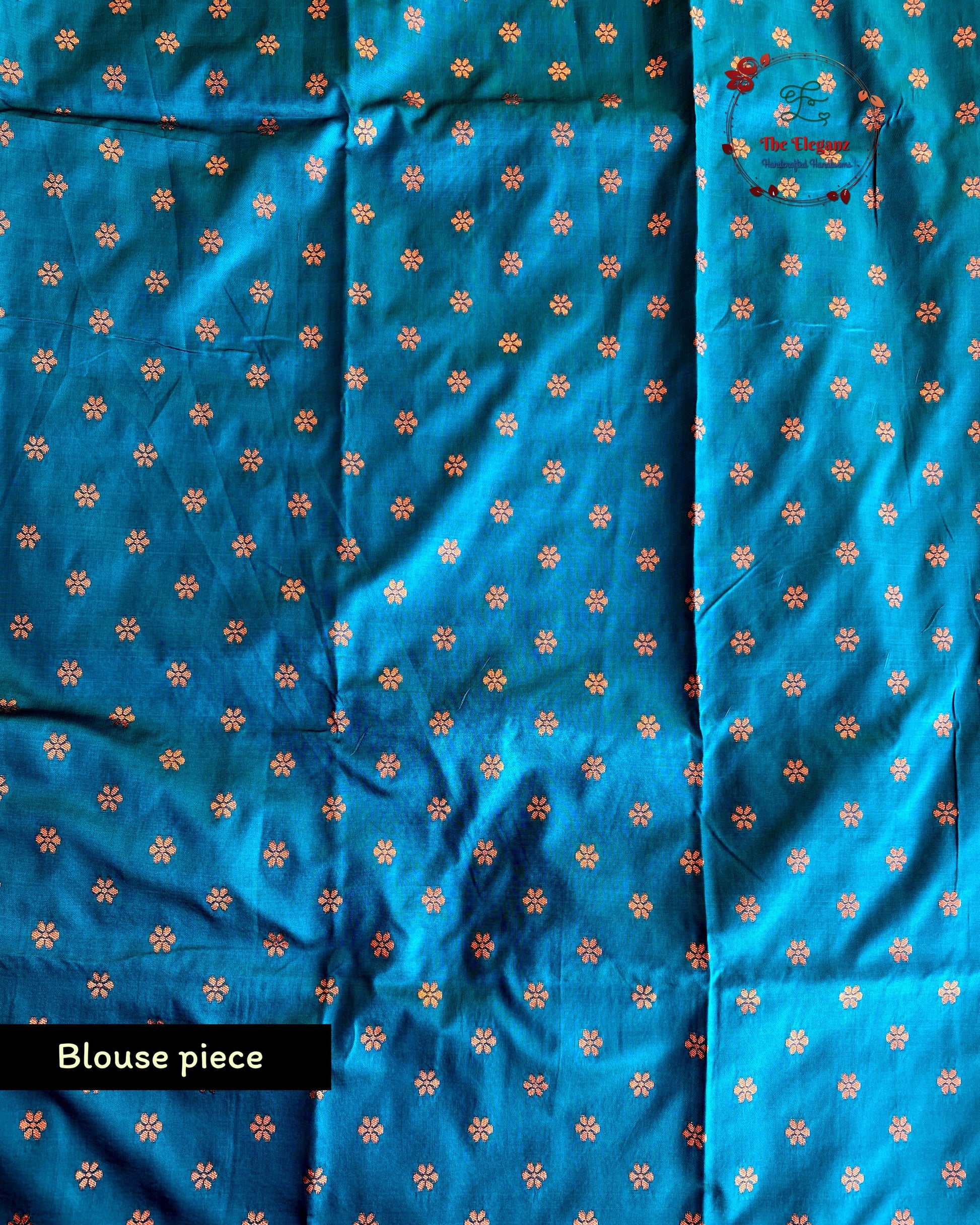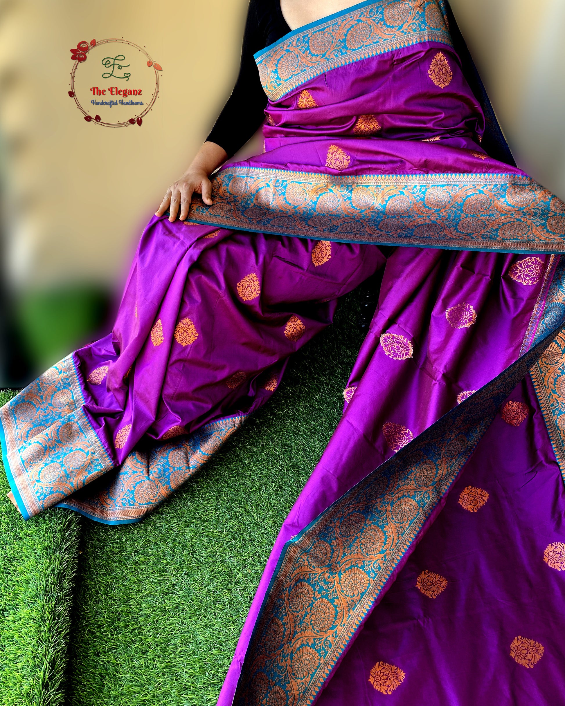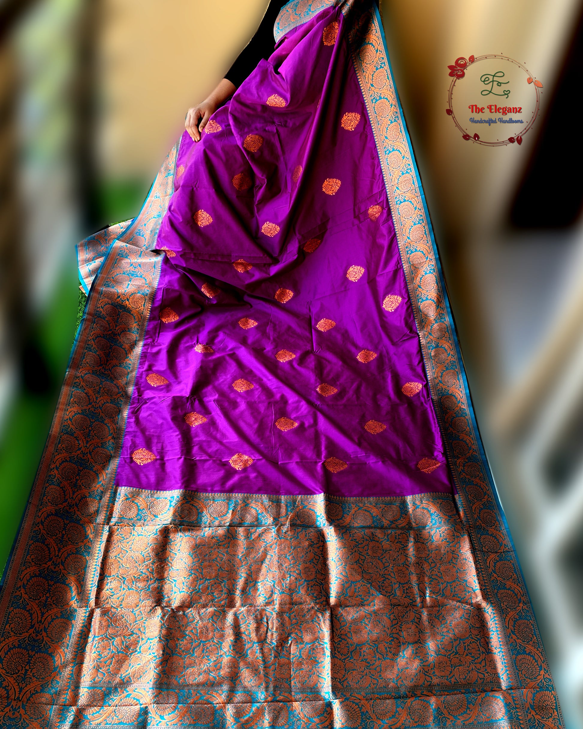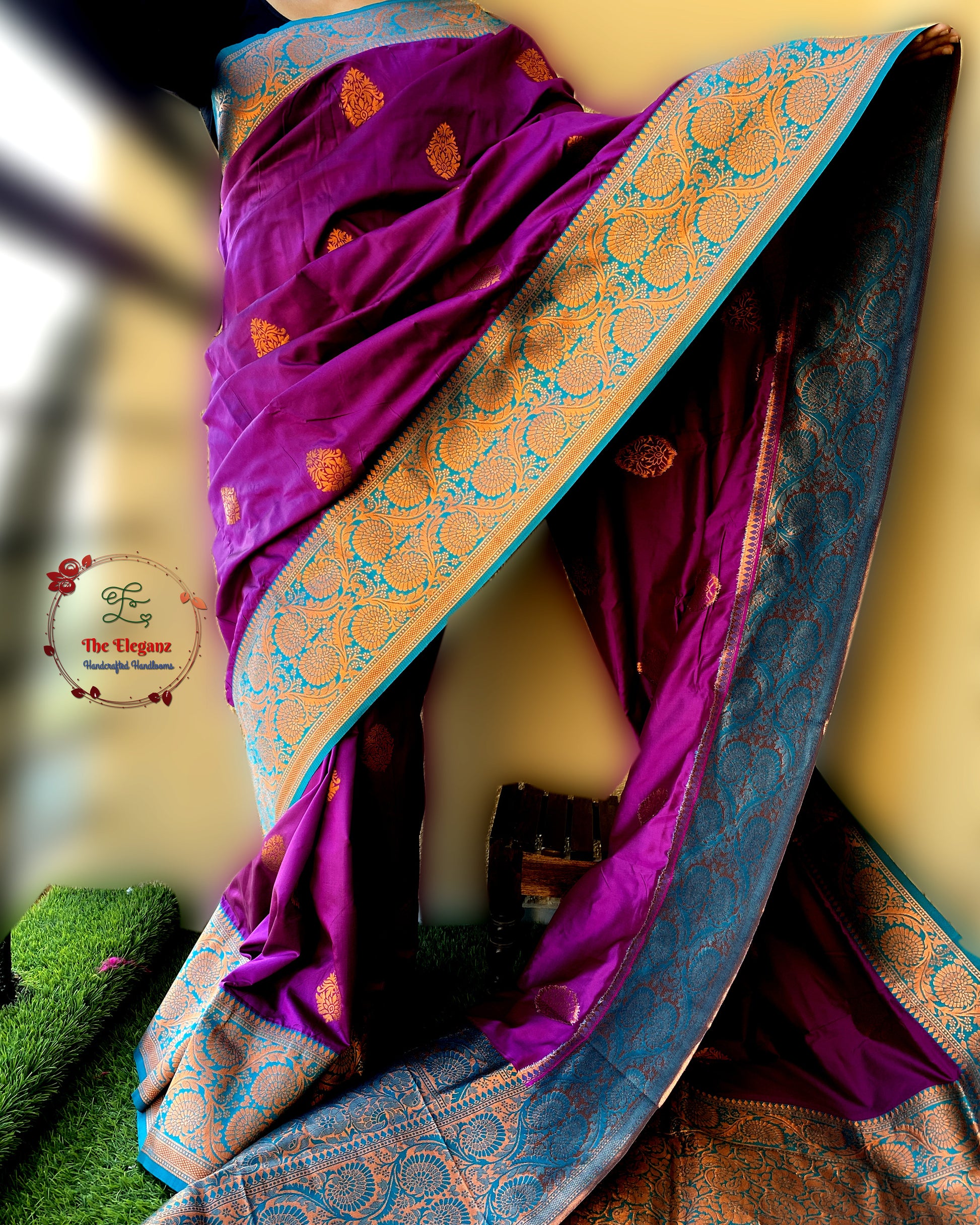 In hues of deep violet kissed by shimmering golden threads, Rajmohini stands as a vision of royal grace. The intricate turquoise-gold border flows like palace frescoes, while the body blooms with golden butis that whisper timeless elegance. A saree made to enchant, captivate, and command admiration.