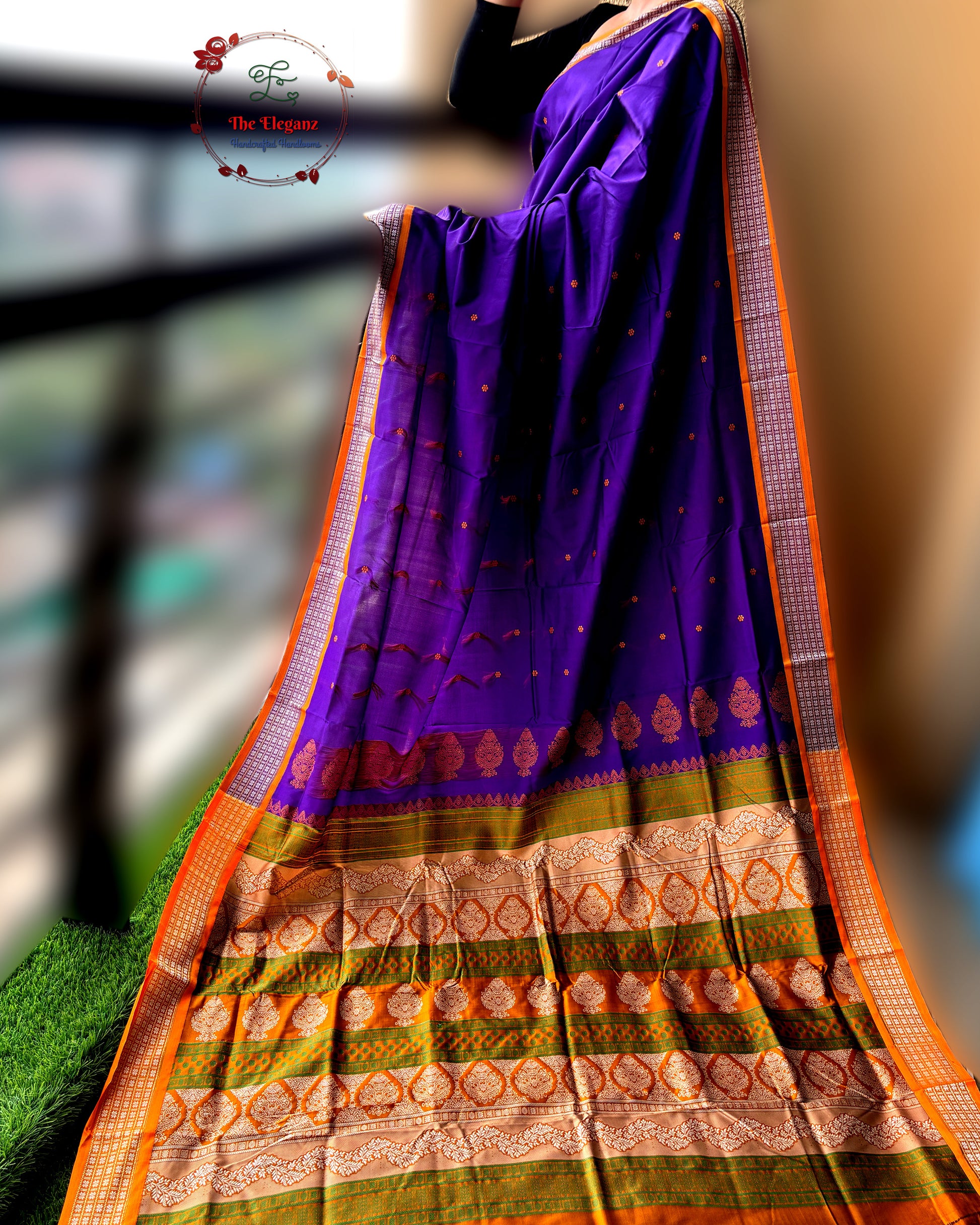 "Rajvaibhav" is a celebration of royal elegance woven into threads. This deep purple semi Bomkai silk saree, with its intricate temple-inspired borders in warm golden and green, evokes the grandeur of Odisha’s weaving heritage. A saree that radiates nobility and grace, perfect for occasions where tradition meets magnificence.