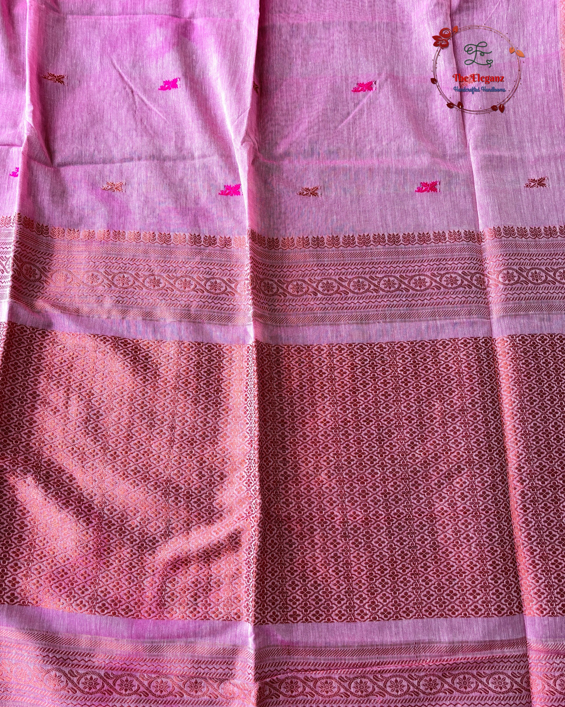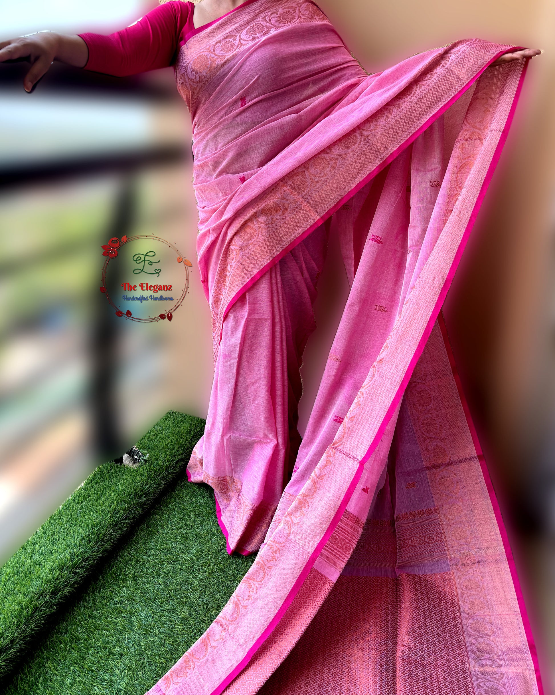 Whispering pink serenity - this delicate weave glows with soft zari work, making it the perfect blend of grace and festivity.