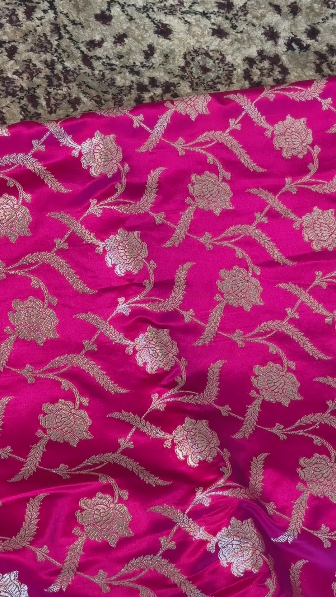 Bold as dawn and radiant as celebration, Rangini drapes you in the joy of festivity. The hot pink silk canvas glows with intricate golden zari floral motifs, while the rich border and pallu carry the timeless whispers of Banarasi artistry. A saree made to shine in the spotlight.