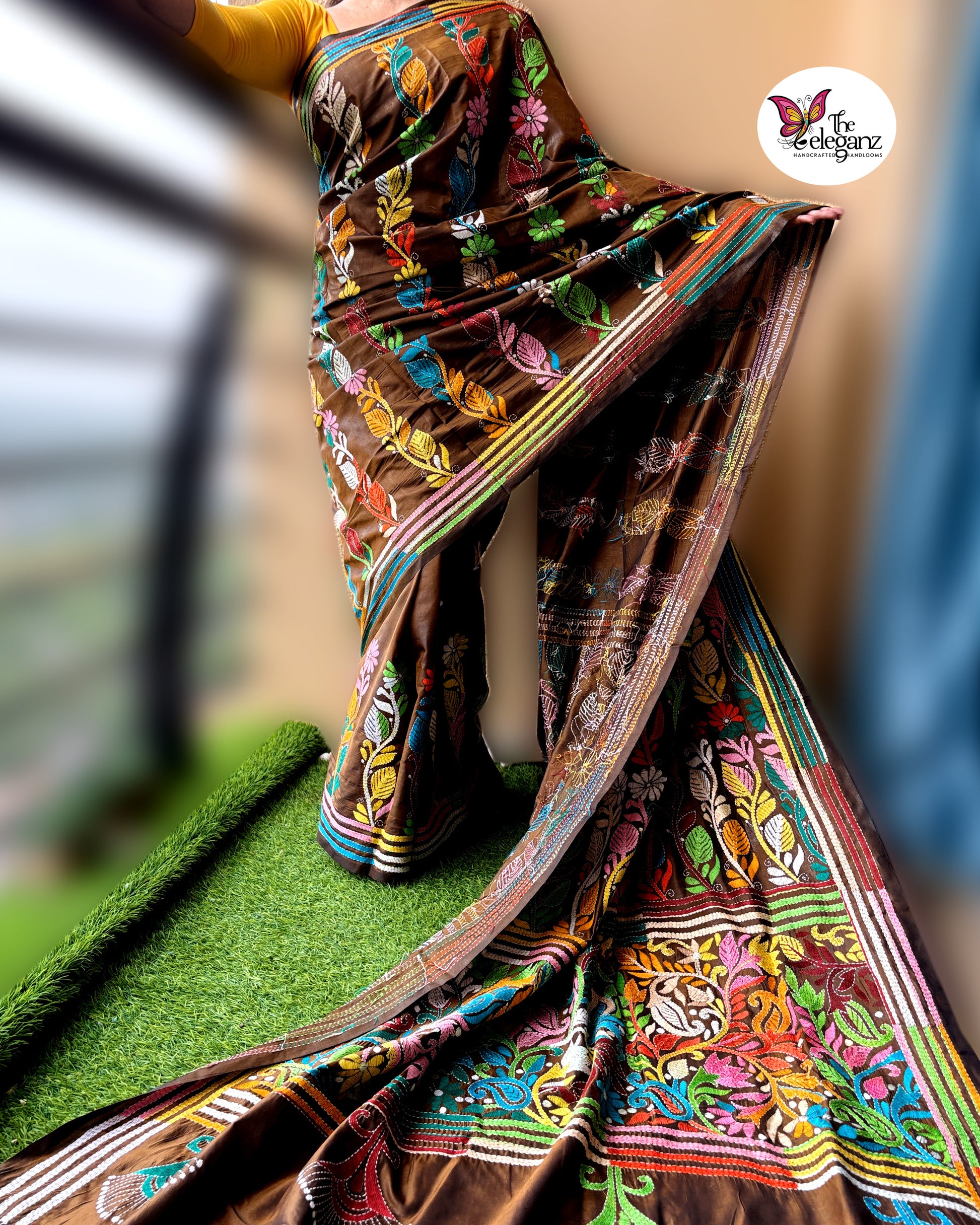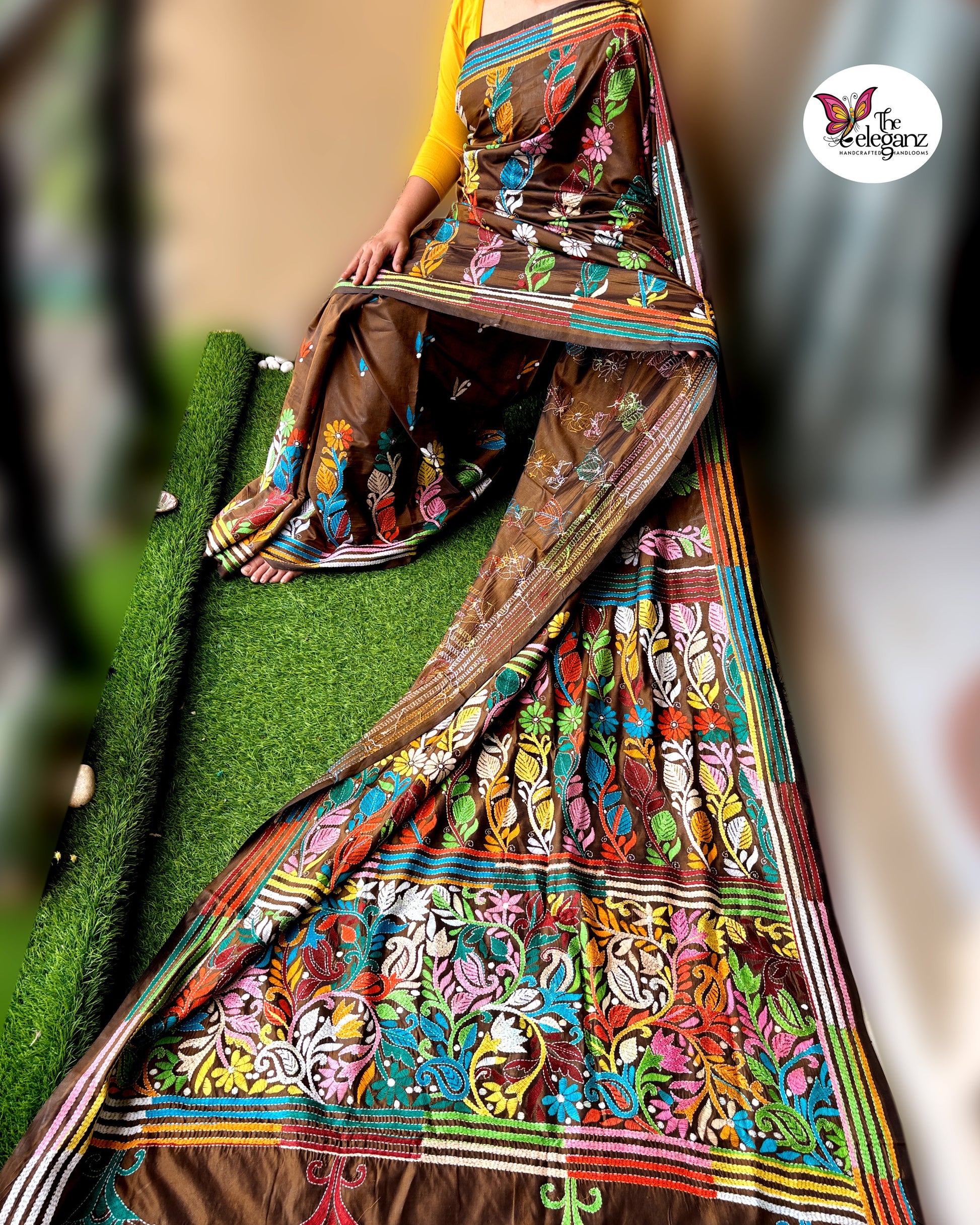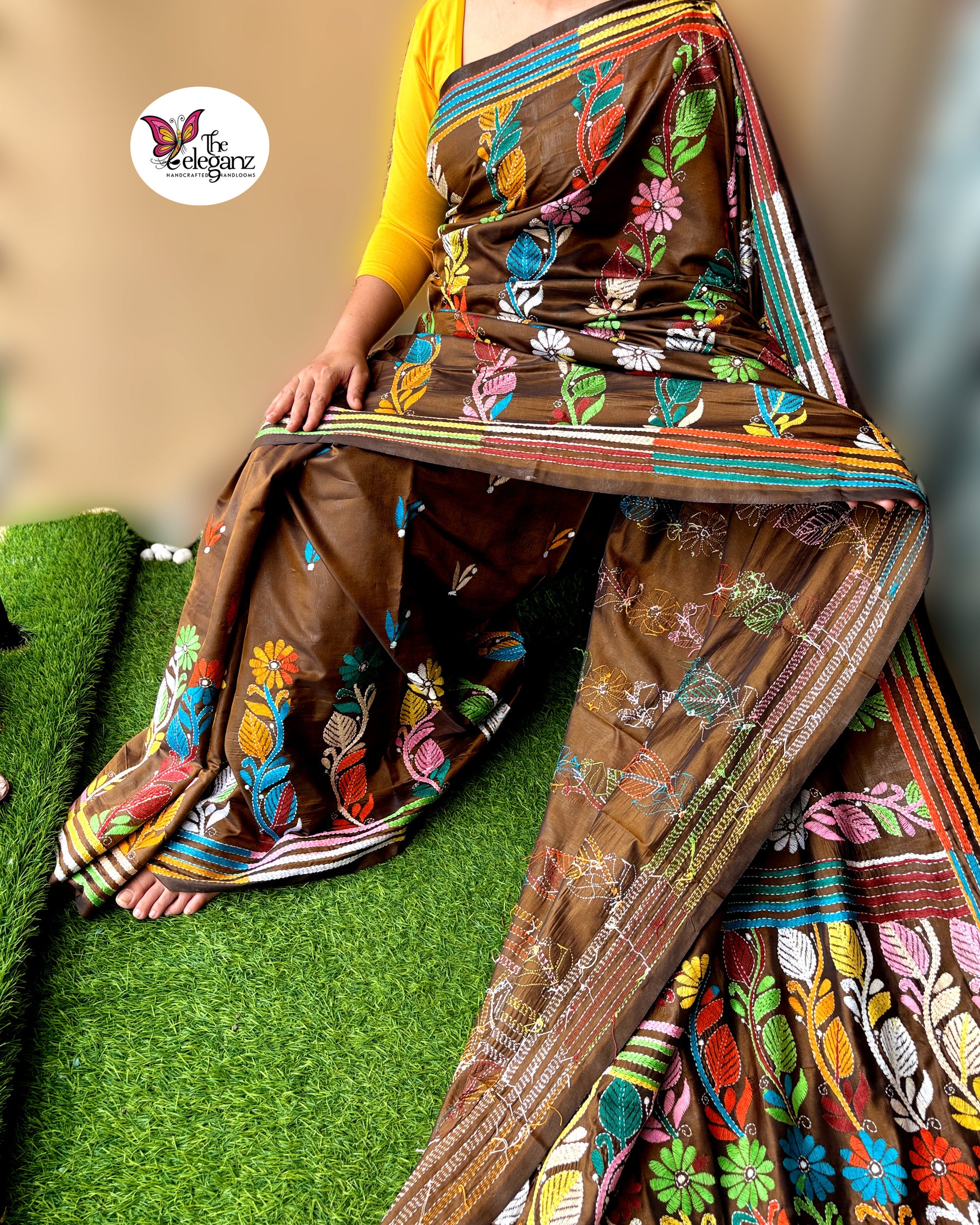 Rangmaati mirrors the vibrant spirit of the earth after the first rain — rich, warm, and alive with colour. On a deep brown canvas, a garden of multicoloured Kantha stitches blossoms in perfect rhythm — leaves, vines, and florals woven in joy. A saree that celebrates the harmony between earth and art, handcrafted with devotion and detail.