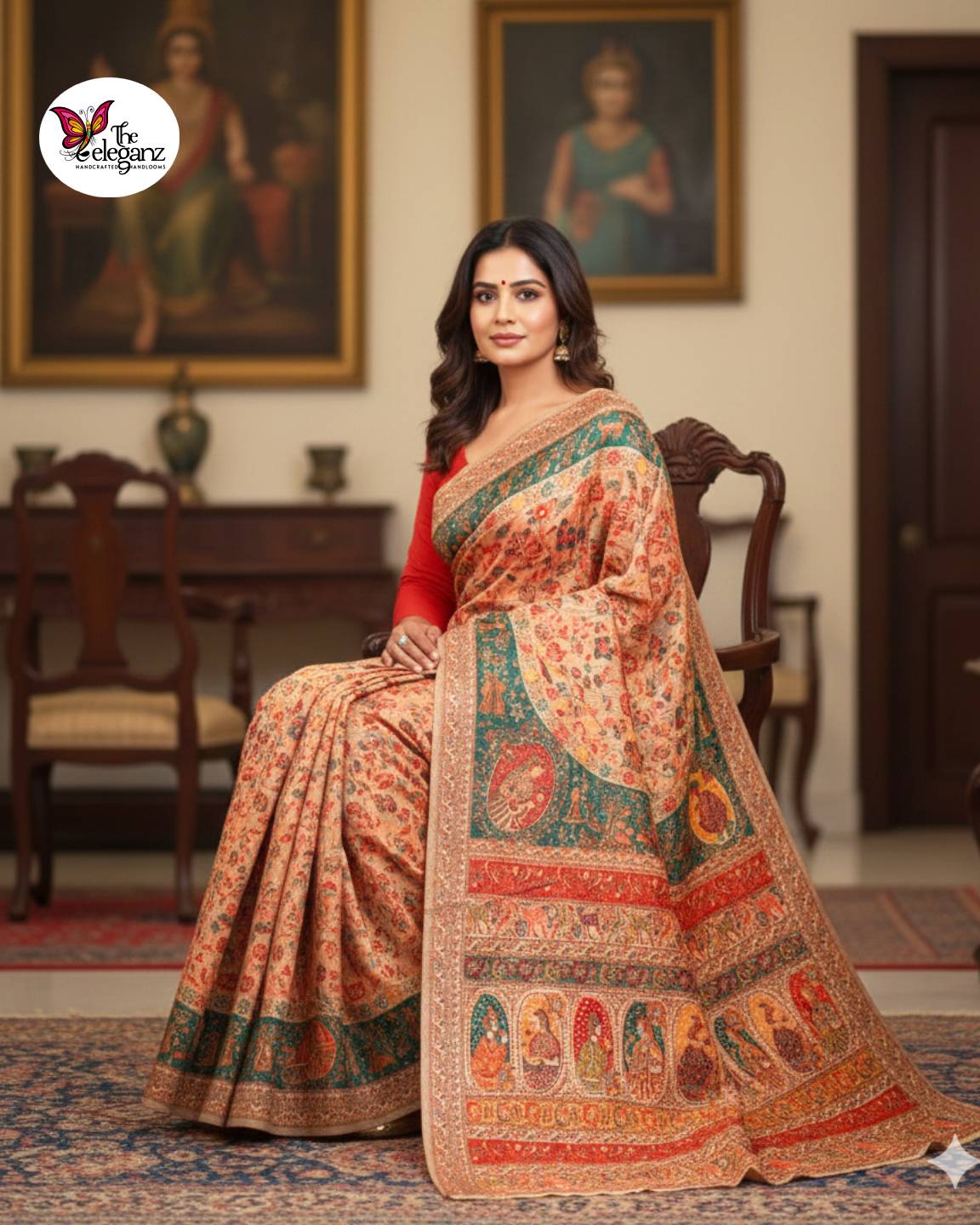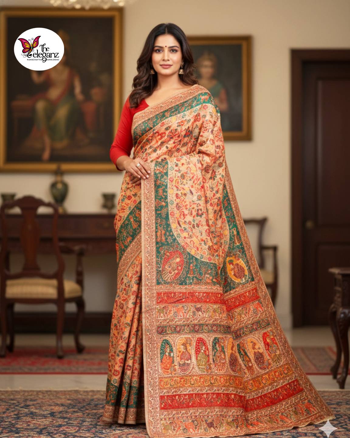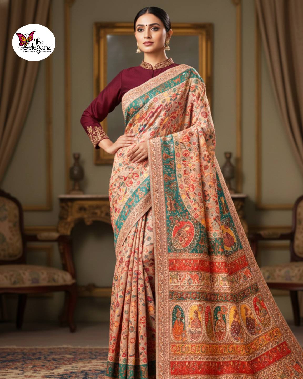 Special Features: Full-body woven design; miniature figure panels inspired by traditional royal murals; soft pashmina-feel texture