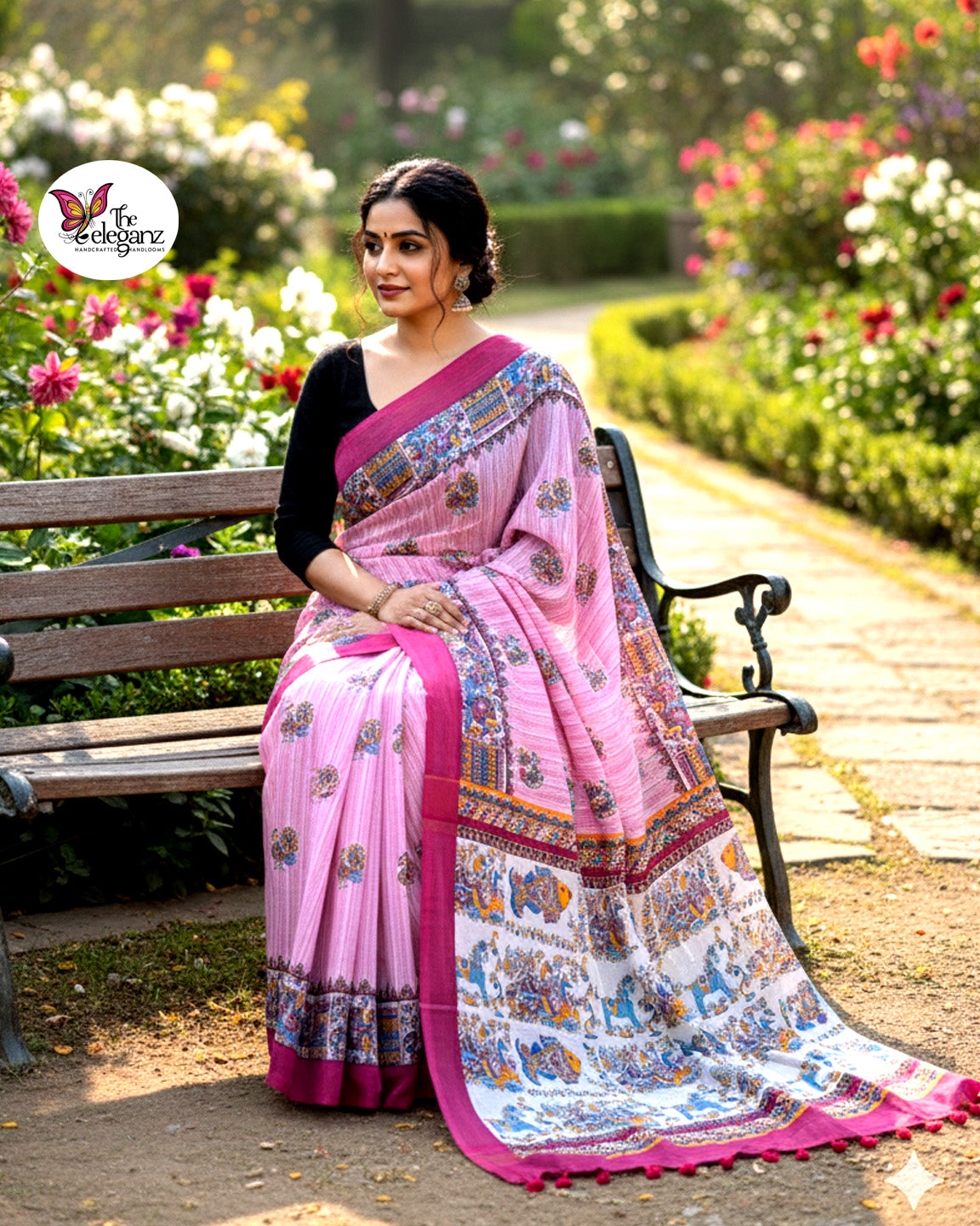 Graceful and spirited, Rangmatsya is a cotton canvas where art and elegance meet. The delicate pink hue softens the vibrance of its Madhubani-inspired motifs — fishes, elephants, and florals — each narrating stories of tradition and joy. Light, breezy, and artistic, it’s a saree that paints culture in contemporary tones.