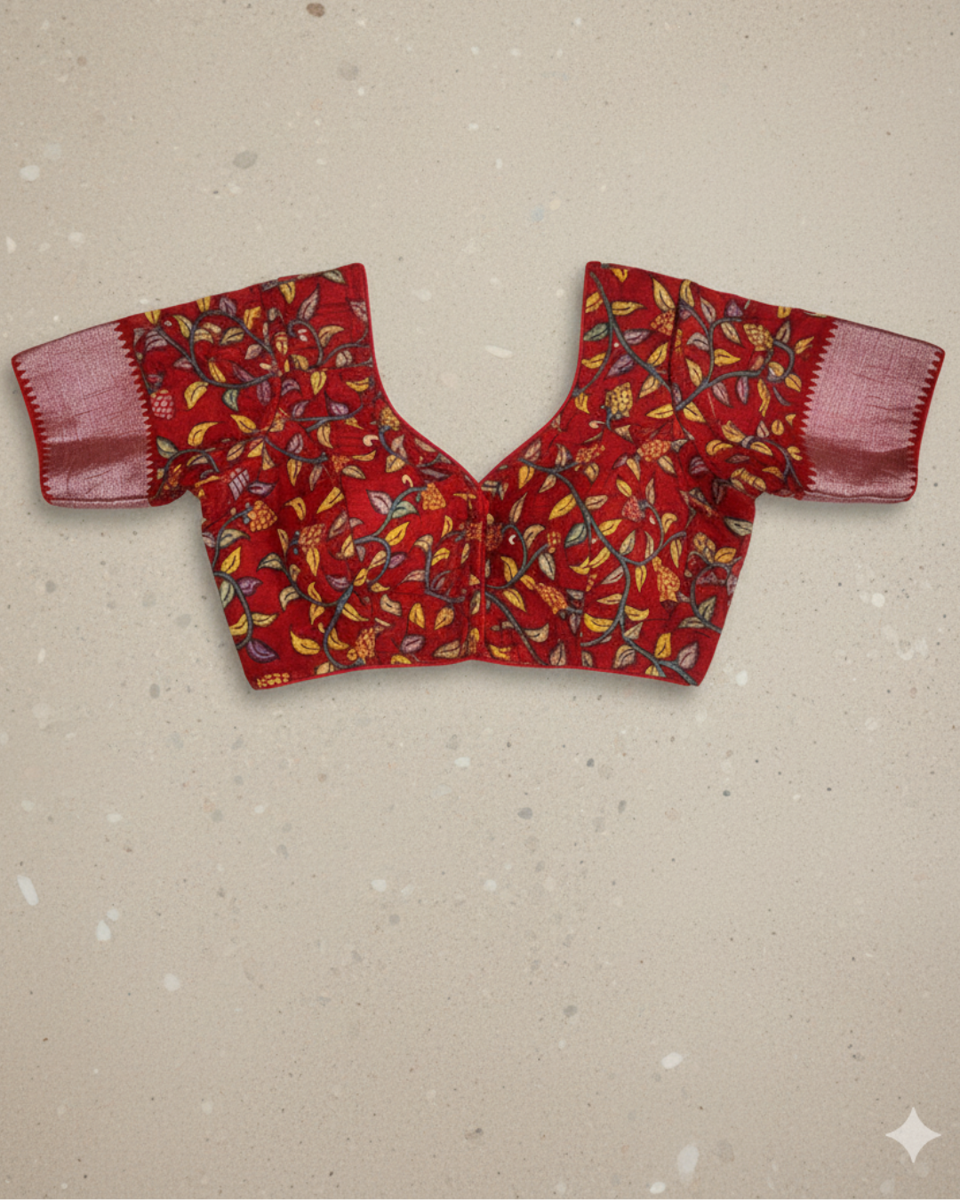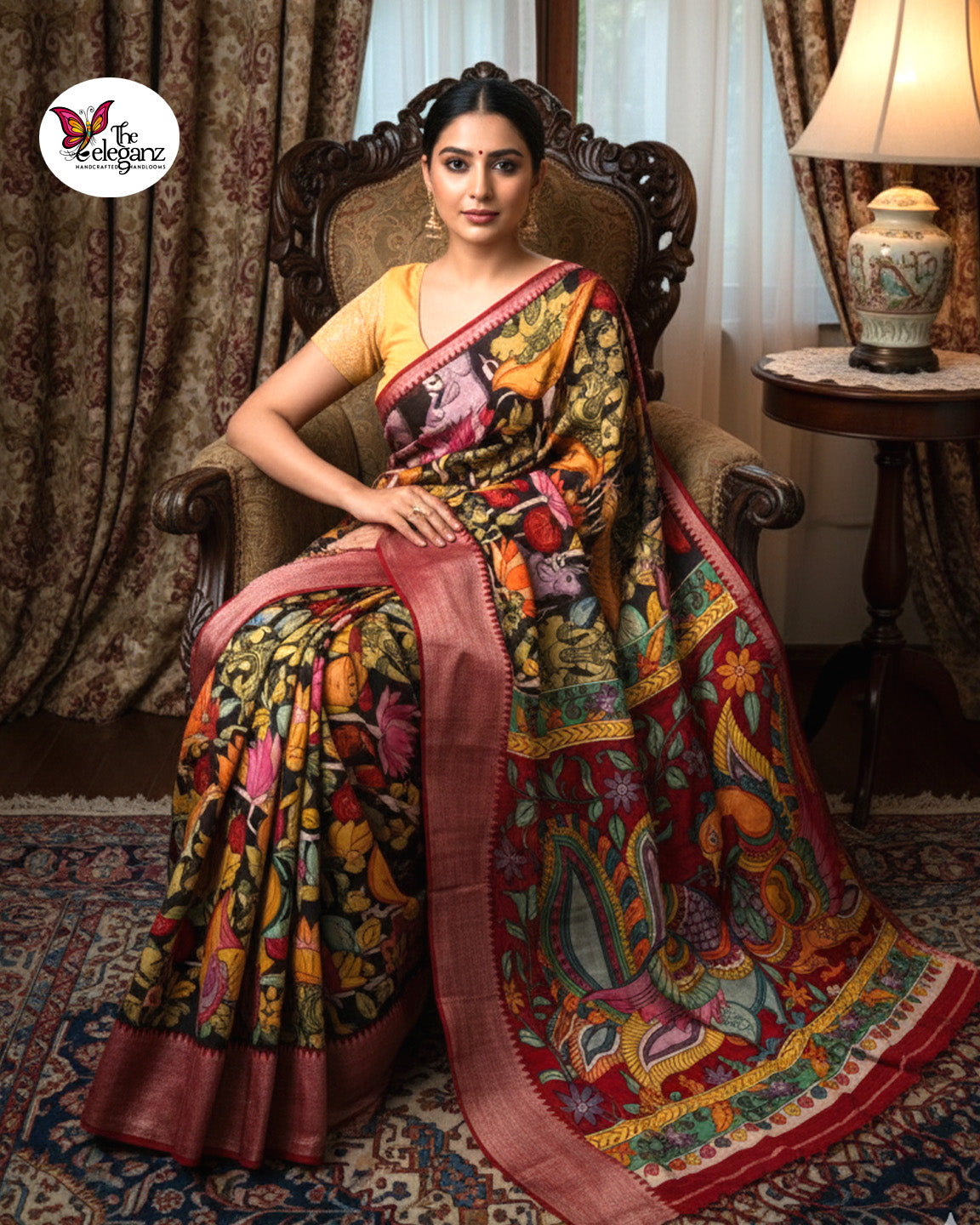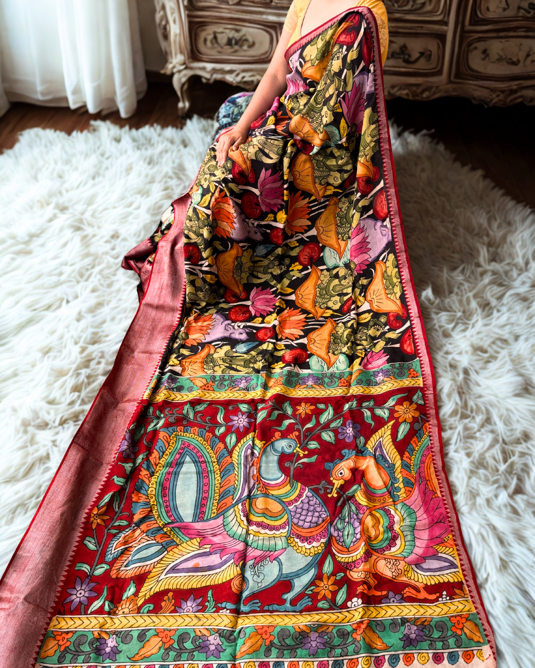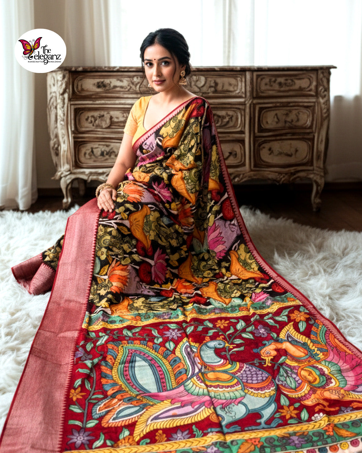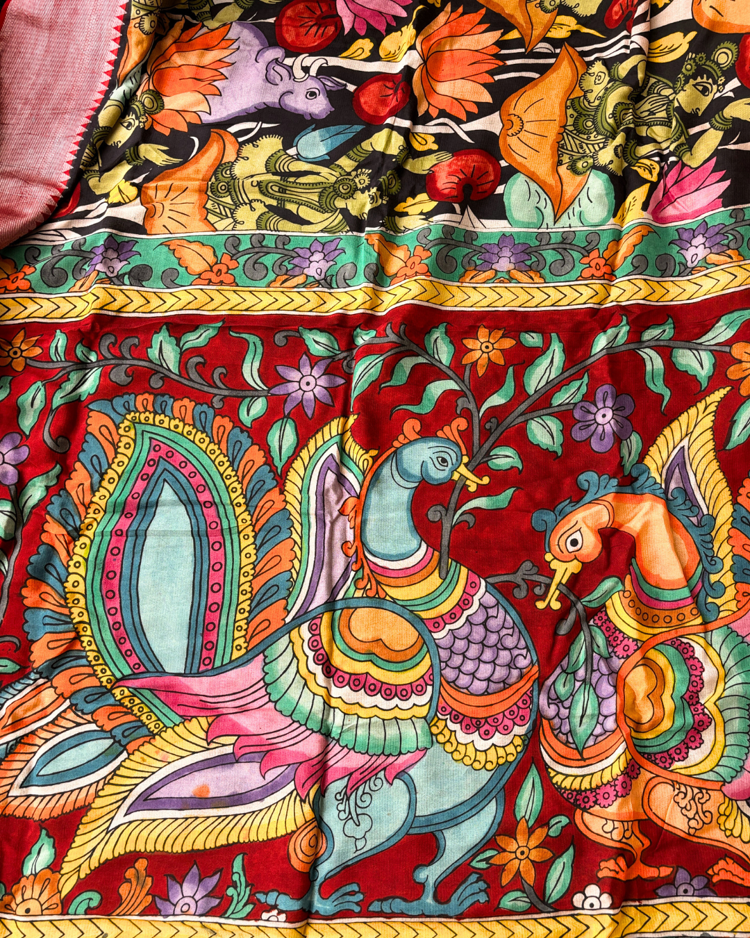 This saree is Pen Kalamkari, entirely hand-drawn and hand-painted, not block-printed or digitally printed. Slight ink overlaps, minor irregularities, or natural dye variations are inherent signatures of this authentic craft and add to its artistic value.