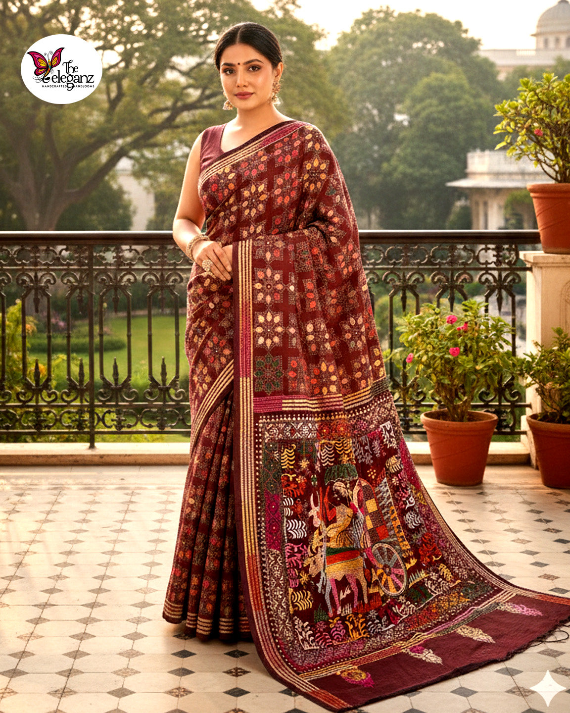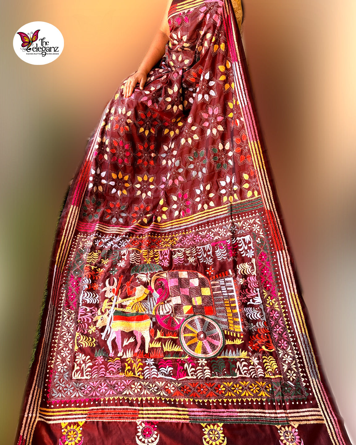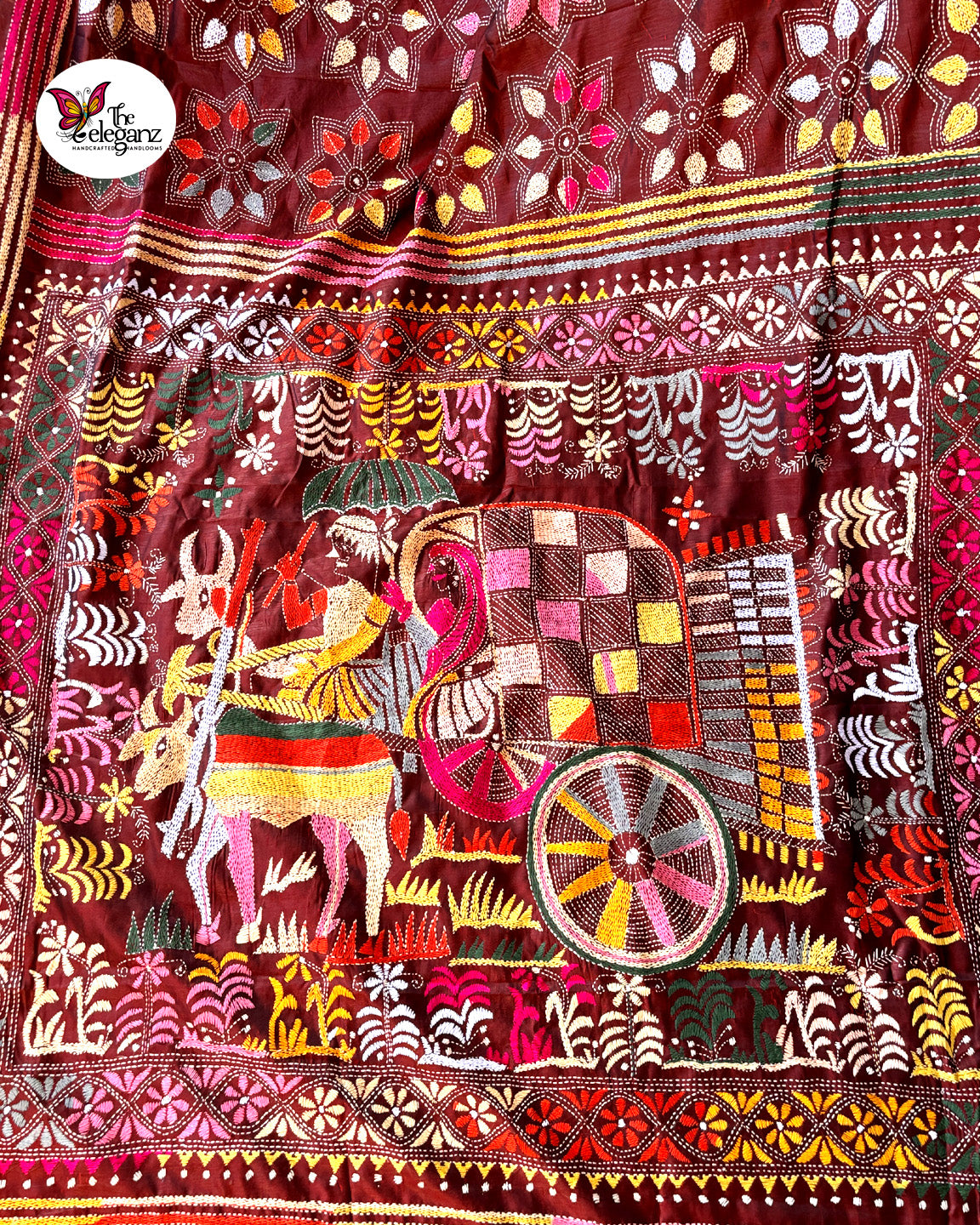 Rathika is a timeless work of wearable art — a rich maroon Bangalore silk blend drape brought to life with hand-stitched Kantha embroidery. Every motif is needle-crafted by artisans, forming vivid florals across the body and a stunning storytelling panel on the pallu — depicting a traditional bullock cart procession in vibrant threadwork.