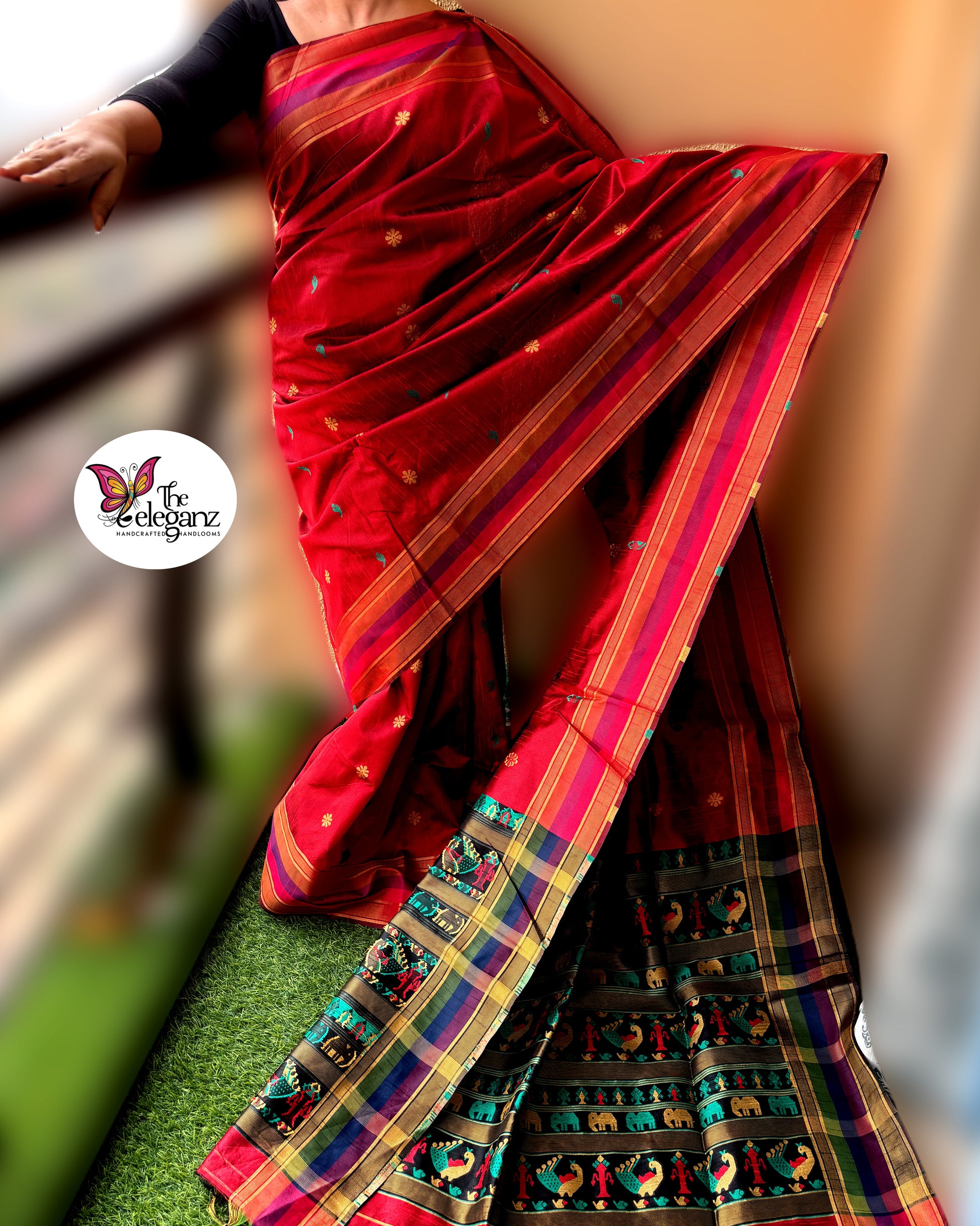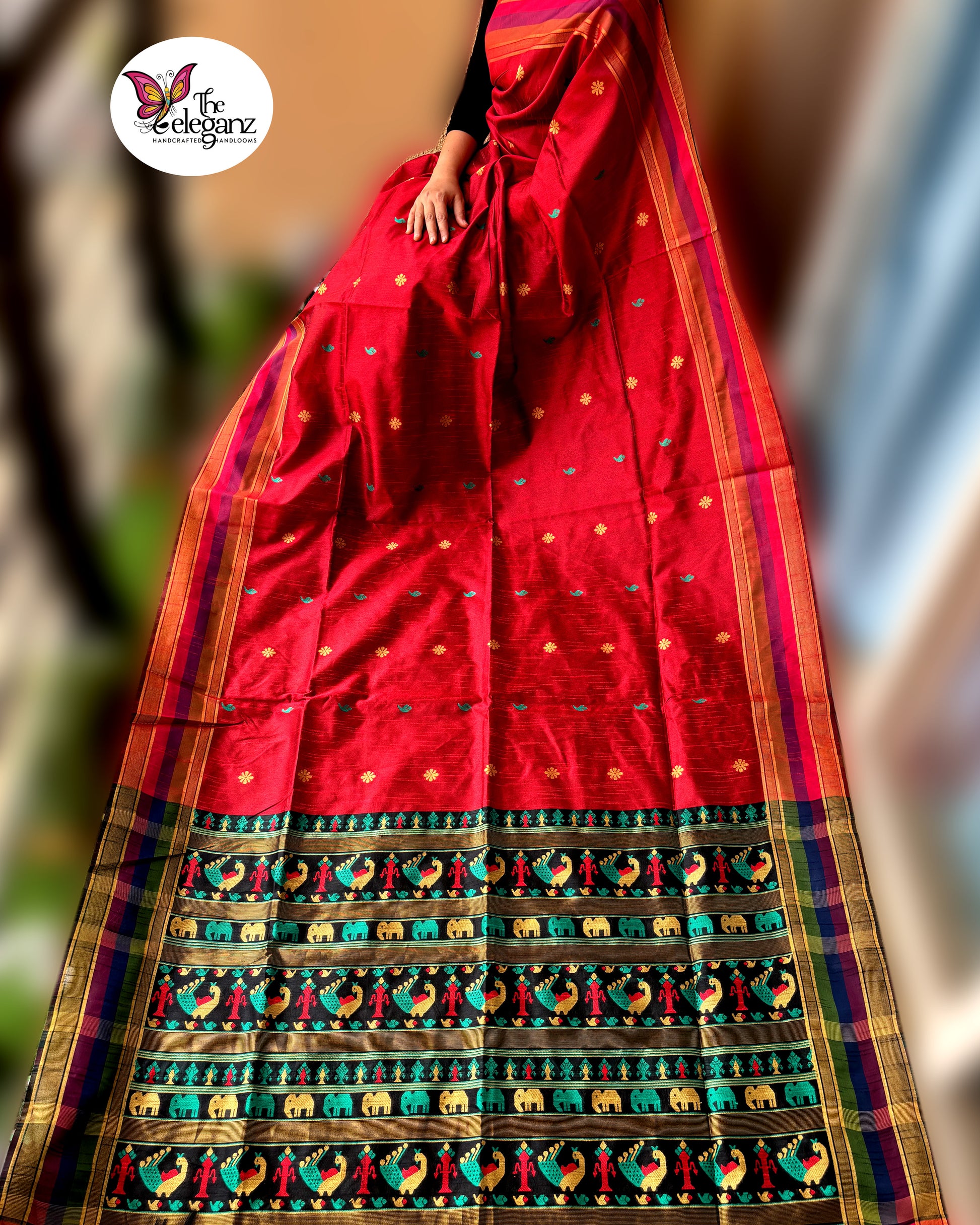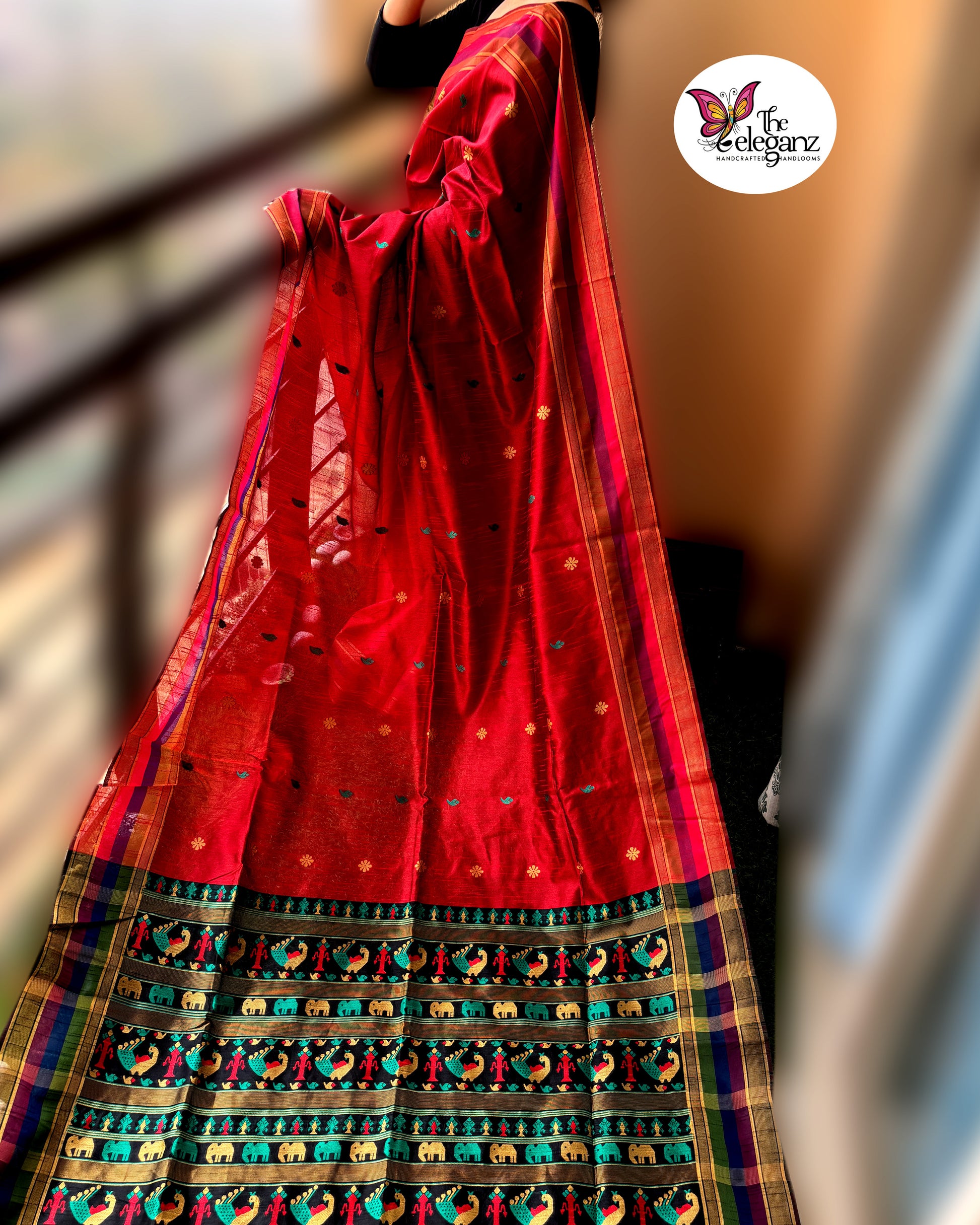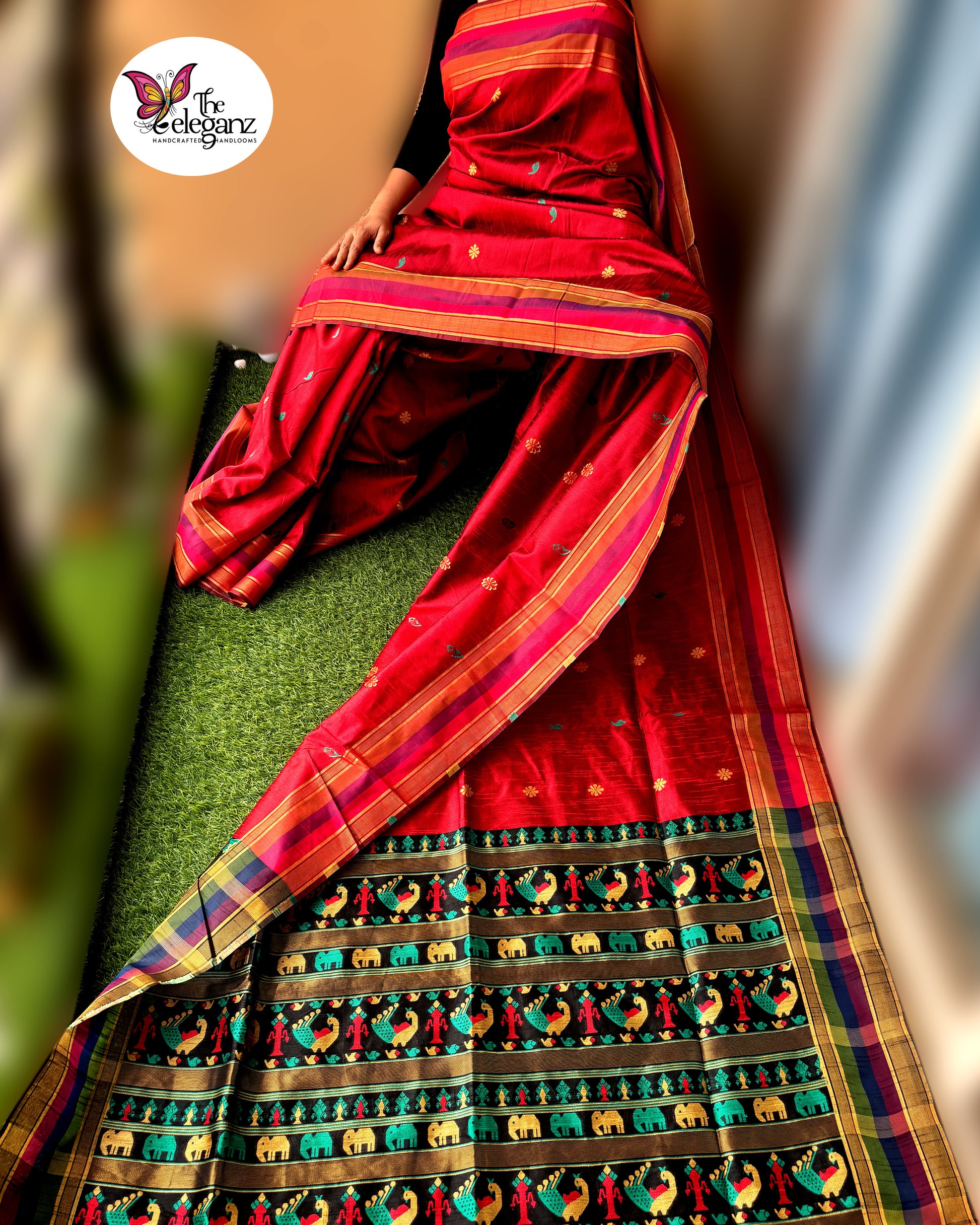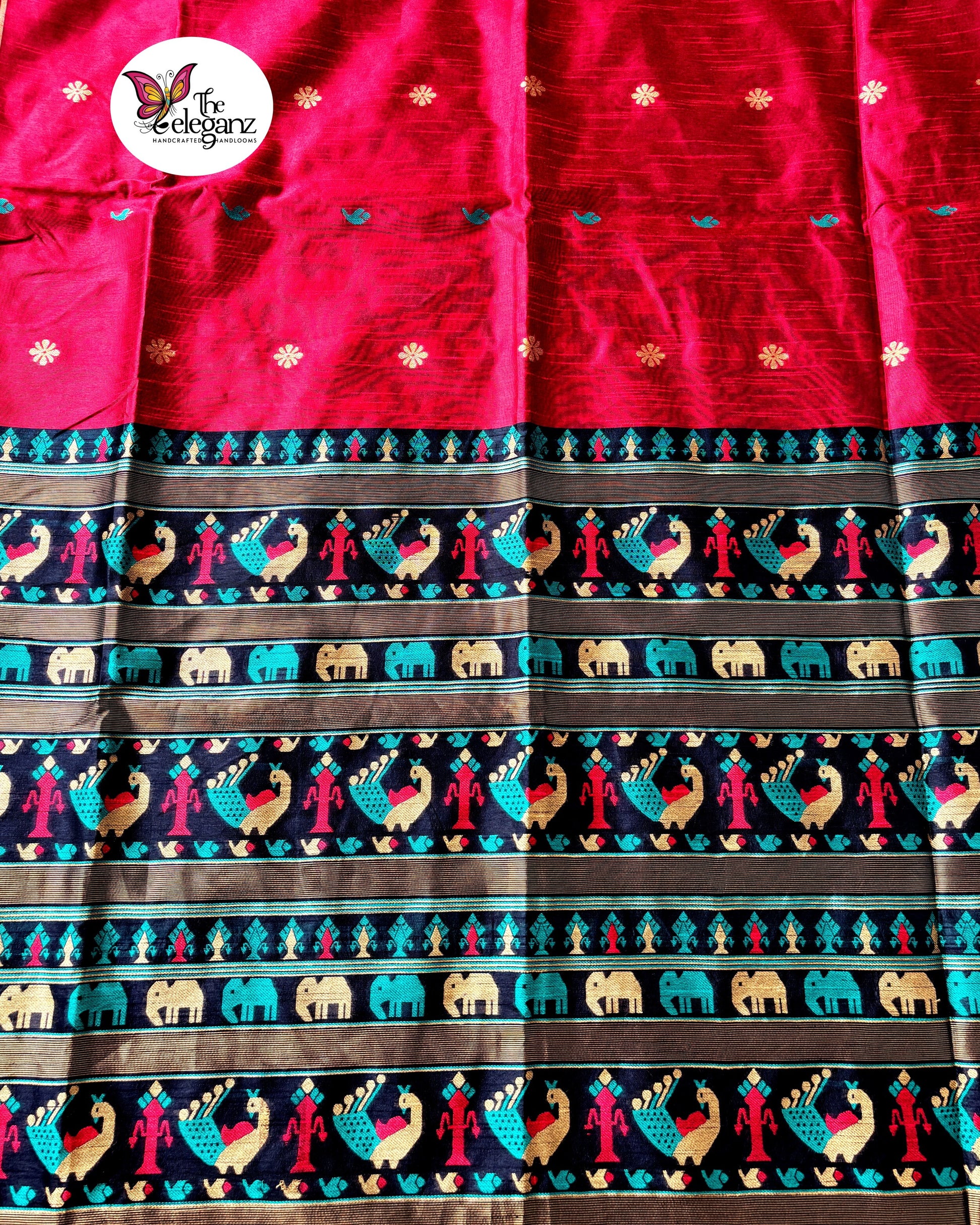 Rudranee — where divine warmth meets timeless artistry. This semi tussar Dolabedi style saree, in rich maroon, unfolds like a festive melody — adorned with woven elephants, peacocks, and temple dancers that echo the rhythm of Odisha’s heritage. Its intricate border weaves devotion, celebration, and elegance into one magnificent drape.