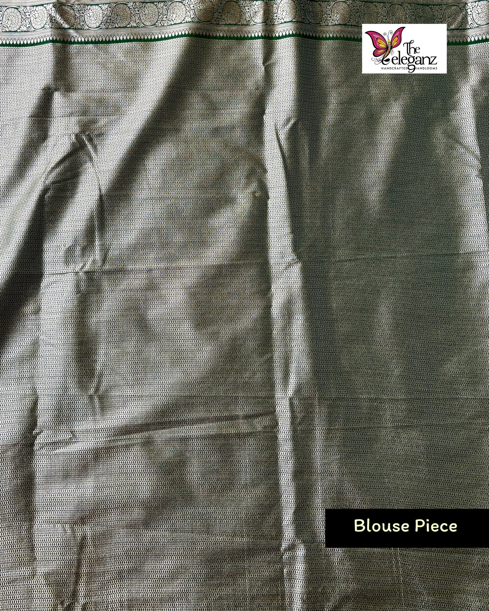 Saanjhika — where the glow of dusk meets the calm of twilight. This soft Katan silk saree blends the warmth of golden mustard with the serenity of emerald green, creating a vision of poise and heritage. The zari-laden border and intricate temple motifs evoke the quiet grandeur of evening rituals — timeless, radiant, and deeply rooted in tradition.