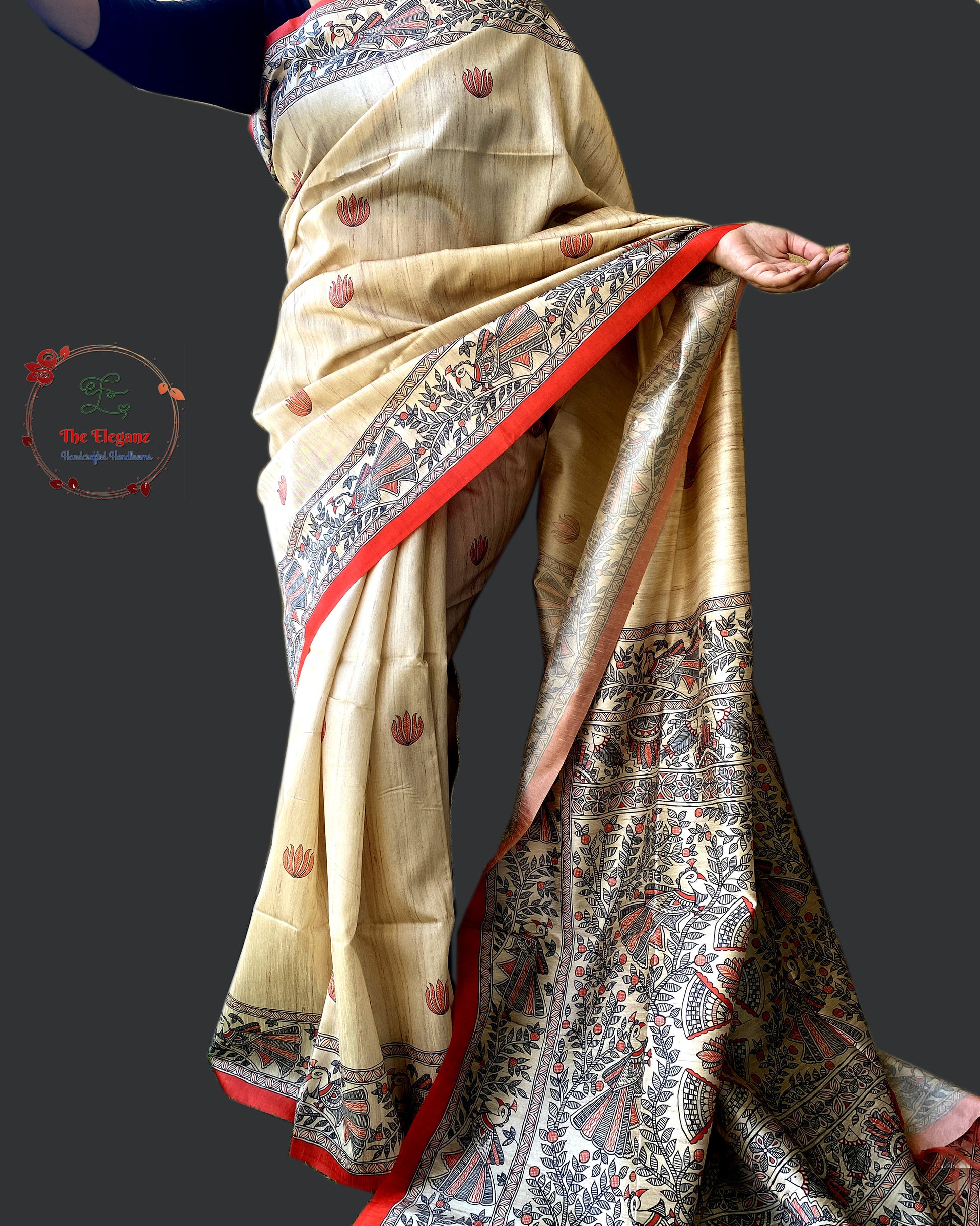 A canvas of tradition, this semi ghicha silk saree blooms with the timeless strokes of Madhubani artistry. The intricate motifs narrate tales of heritage, while the earthy texture of ghicha silk enhances its rustic elegance. A perfect harmony of craft and culture, draped in grace.