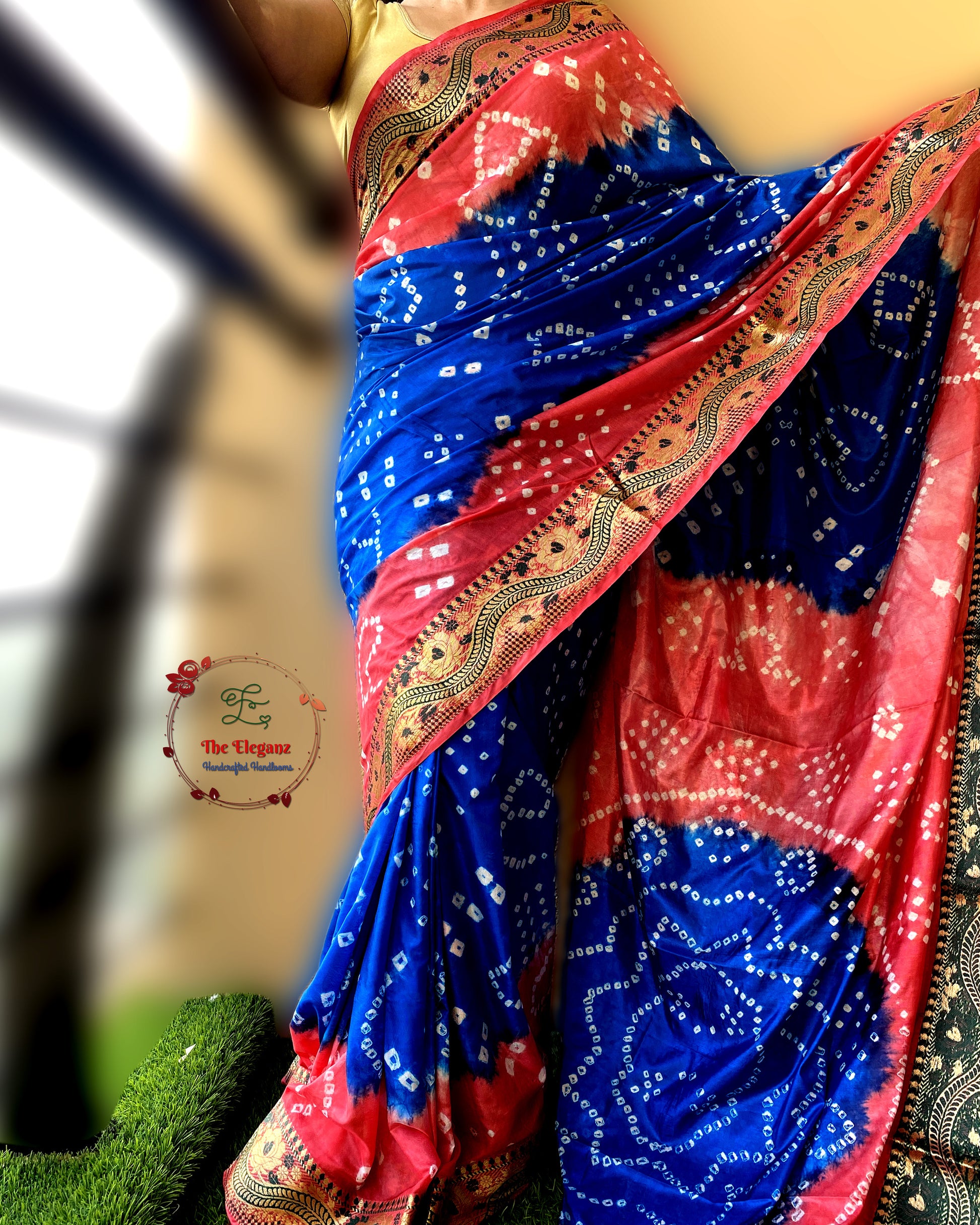 This saree is made in semi silk with Bandhni tie-dye work, not pure silk. Slight irregularities in tie-dye patterns or zari weave are natural to its handcrafted process. Actual colours may vary slightly due to lighting and screen resolution.