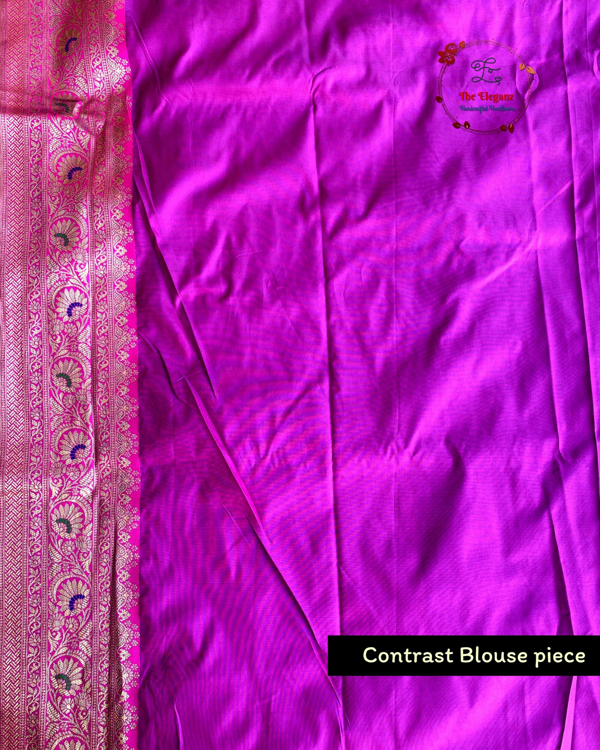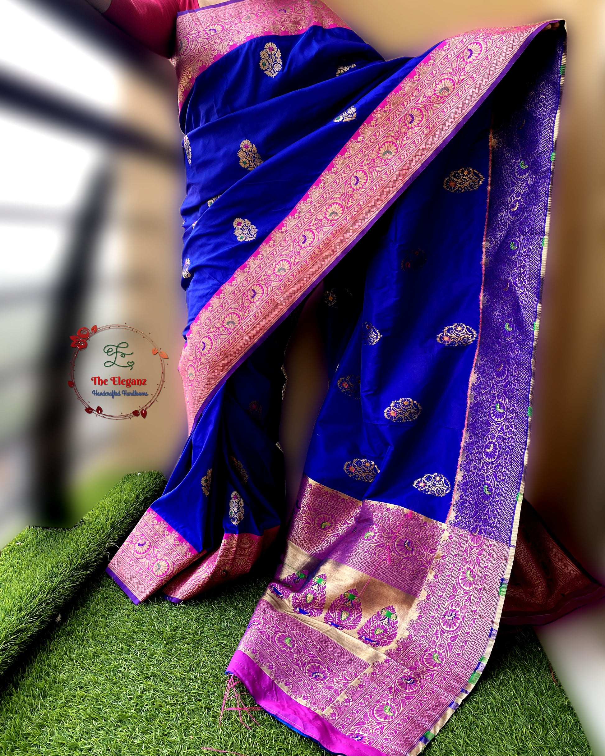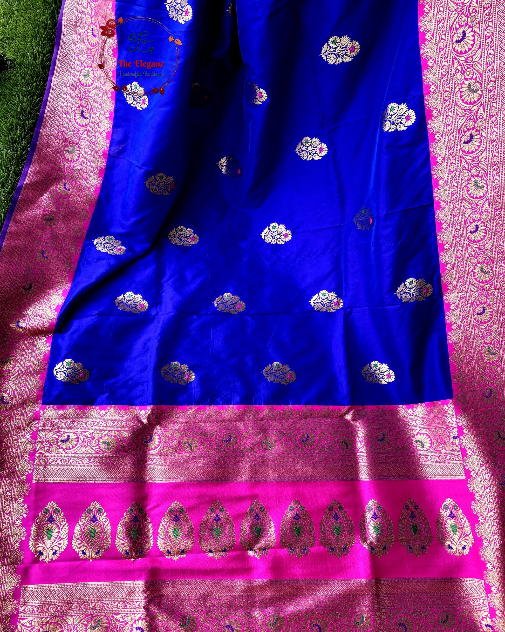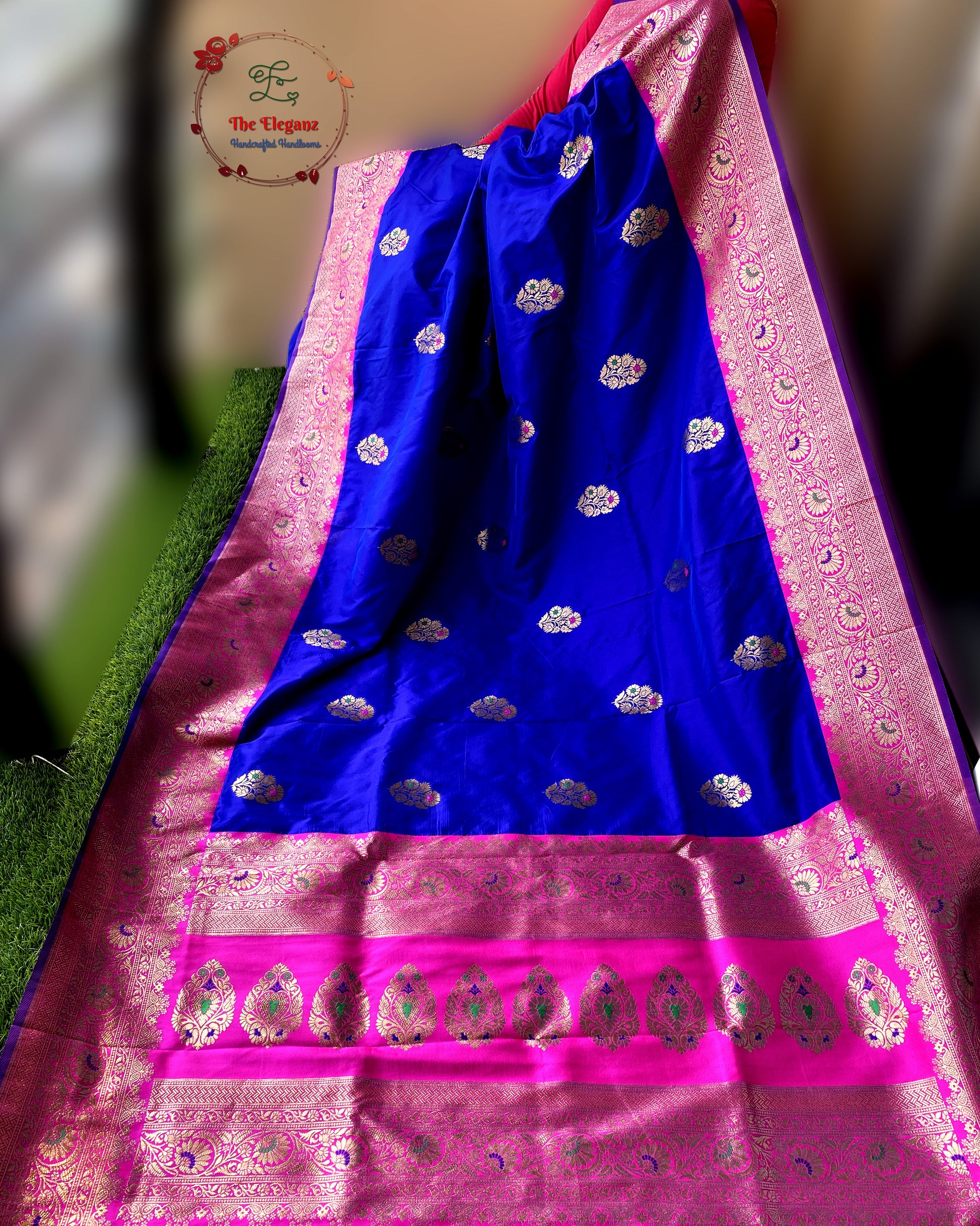Royal blue drapes kissed with pink zari borders, blooming with golden motifs like blossoms in moonlight.
