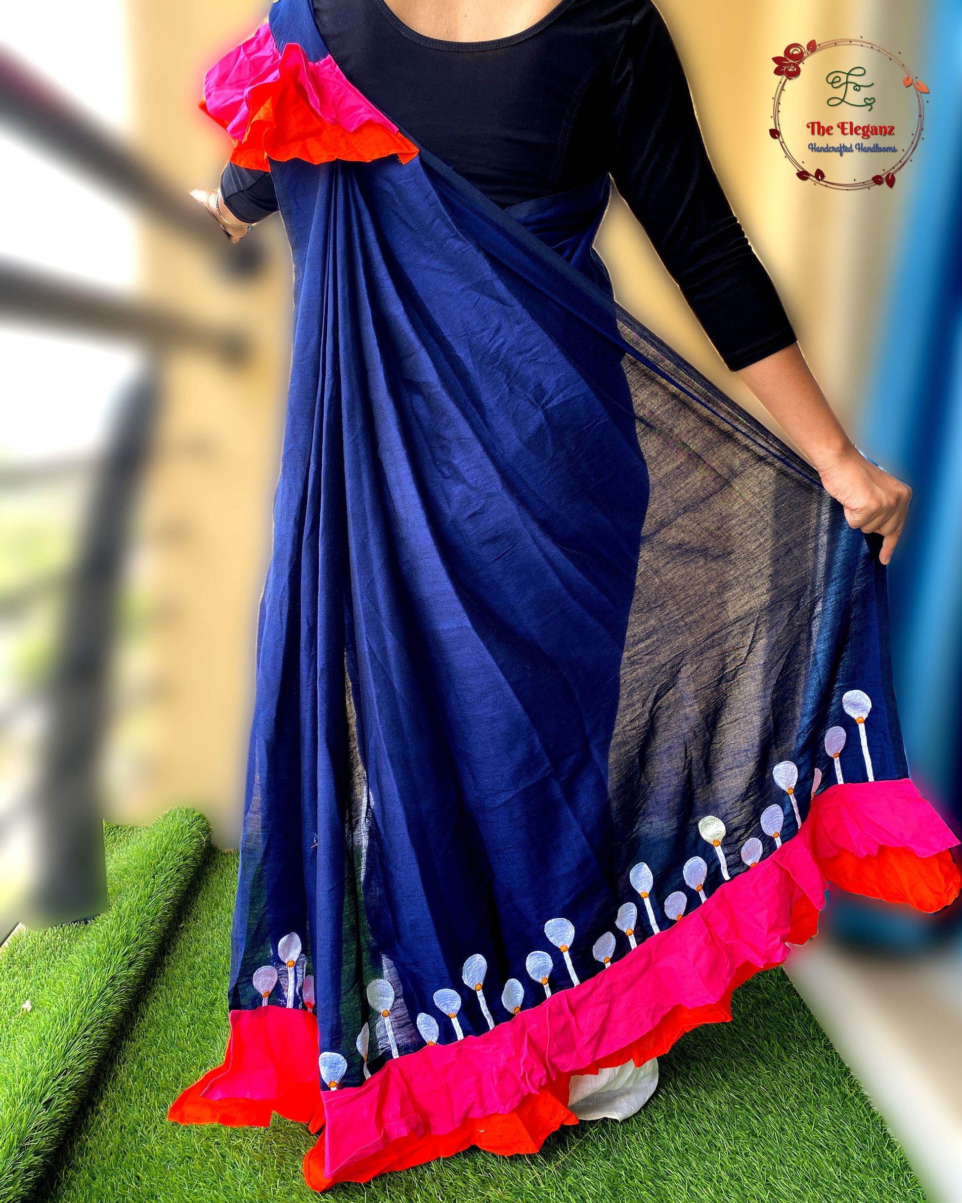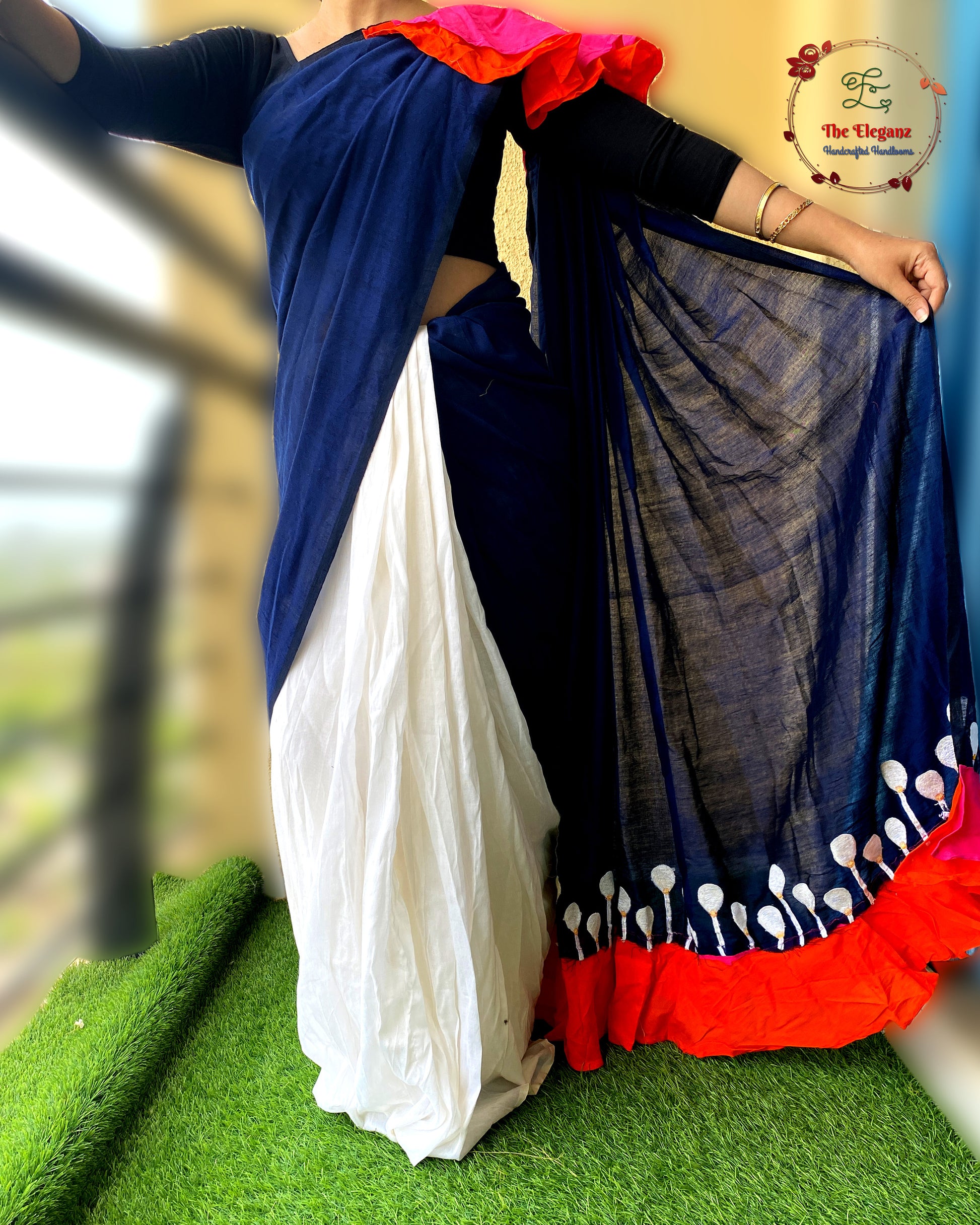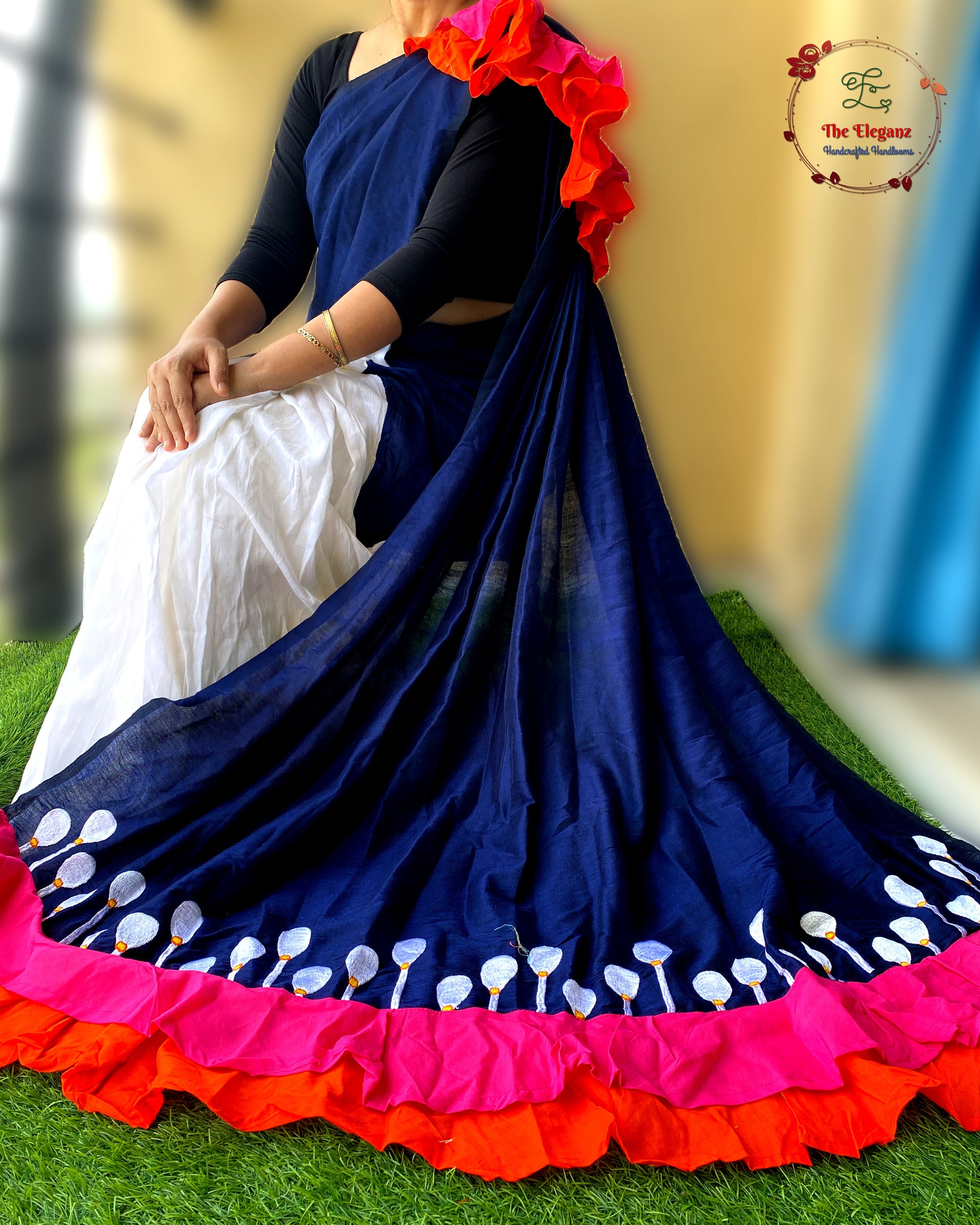 The Rangtara Semi-Stitched Khadi Cotton Saree is a modern twist on traditional khadi. With its deep navy-blue body, playful ruffled borders in fuchsia and fiery orange, and delicate hand-embroidered motifs, this saree exudes contemporary chic while staying rooted in handloom heritage. Designed as semi-stitched, it brings easy draping with a statement look — perfect for festive evenings, parties, and special occasions.
