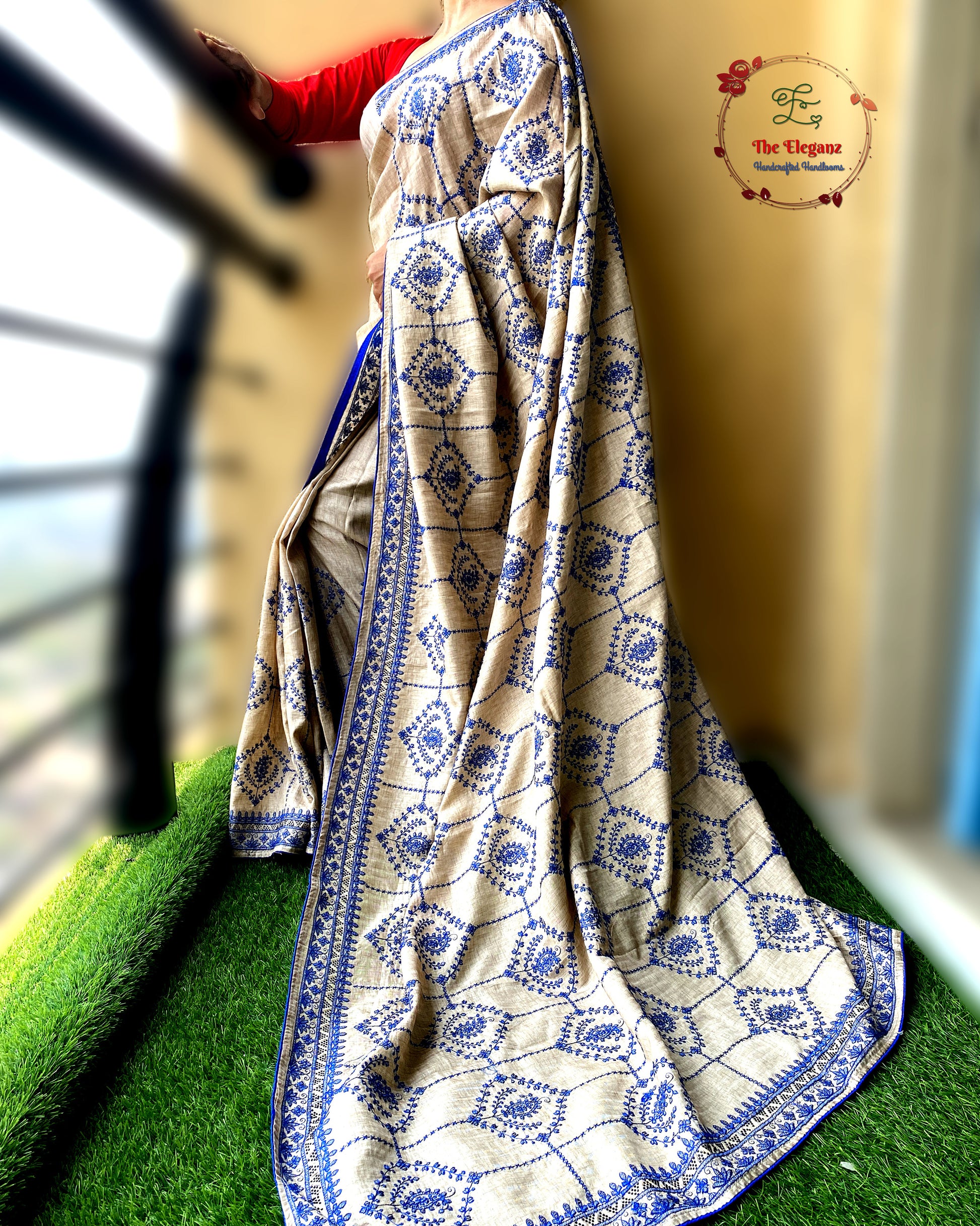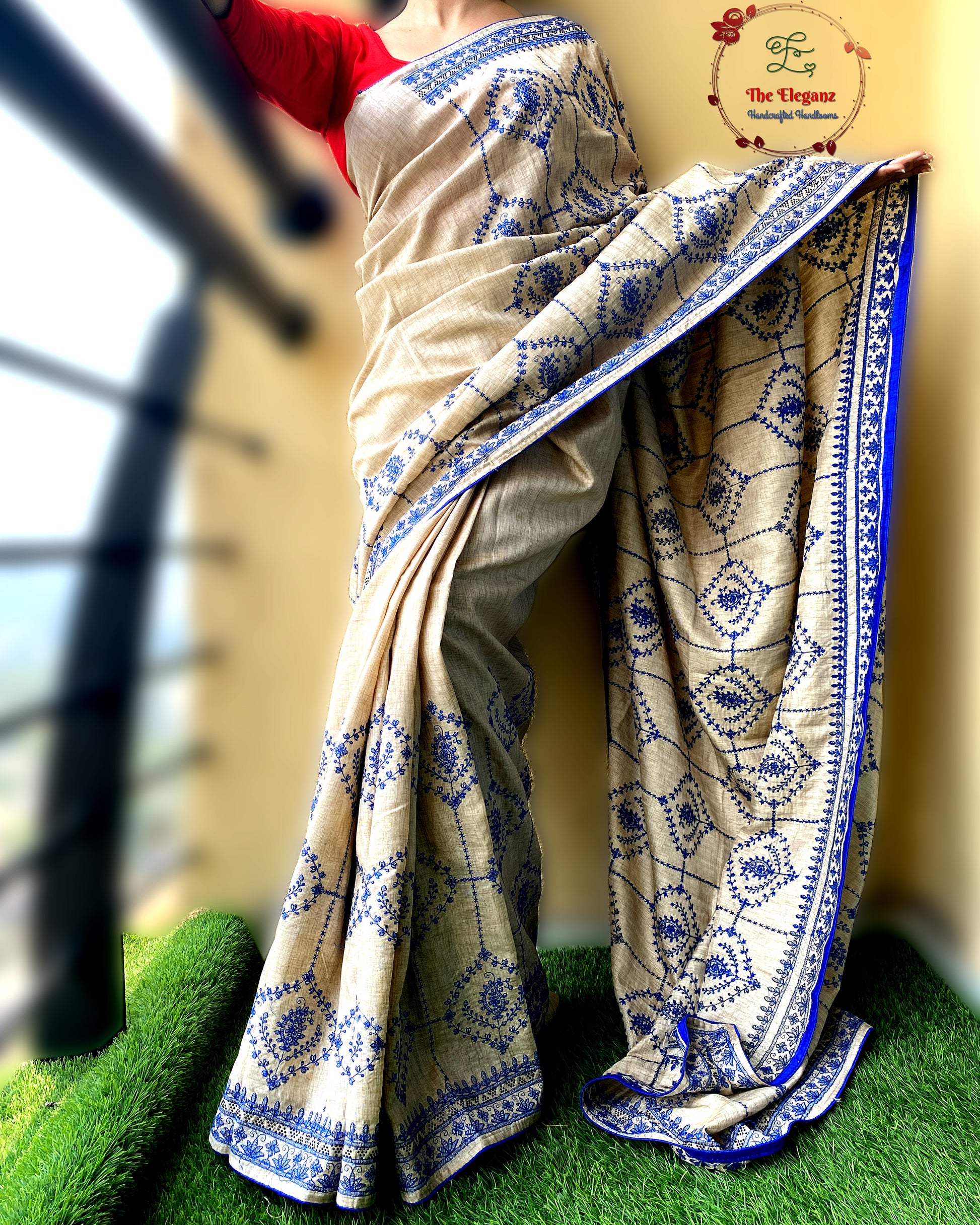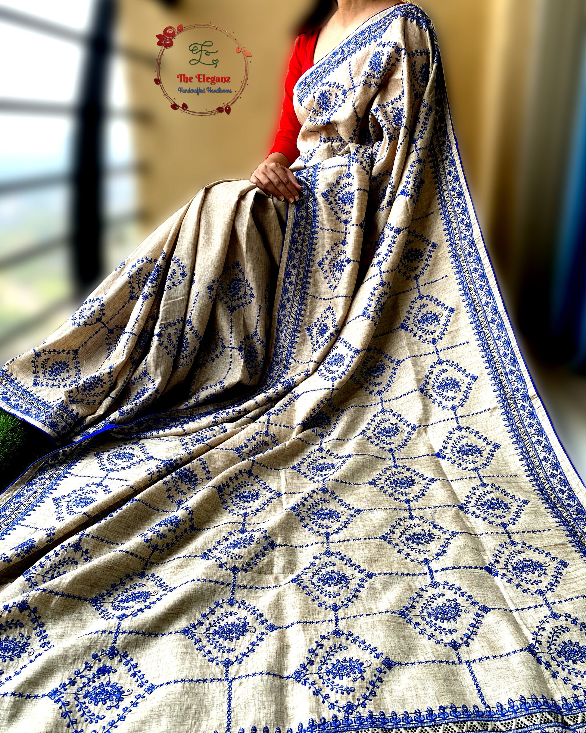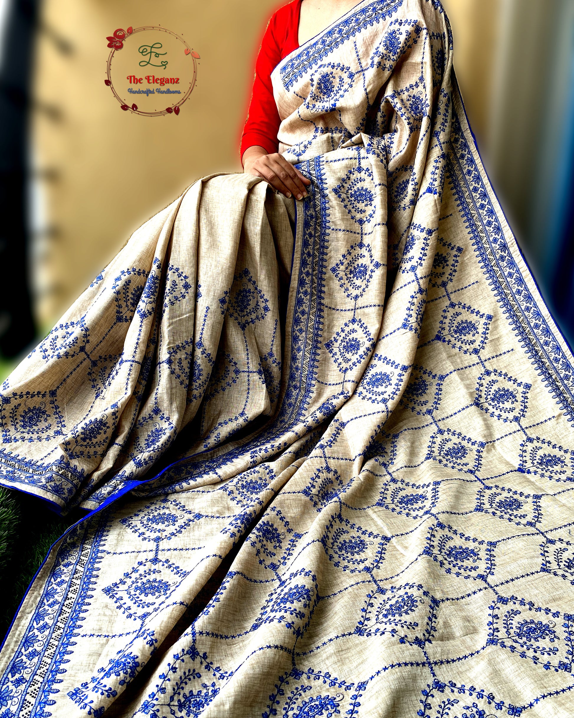 A canvas of soft beige semi tussar, brought alive with intricate blue embroidery that blooms across its body like delicate vines. This saree is a harmony of subtle charm and vibrant grace—perfect for those who love understated sophistication with a touch of artistry.