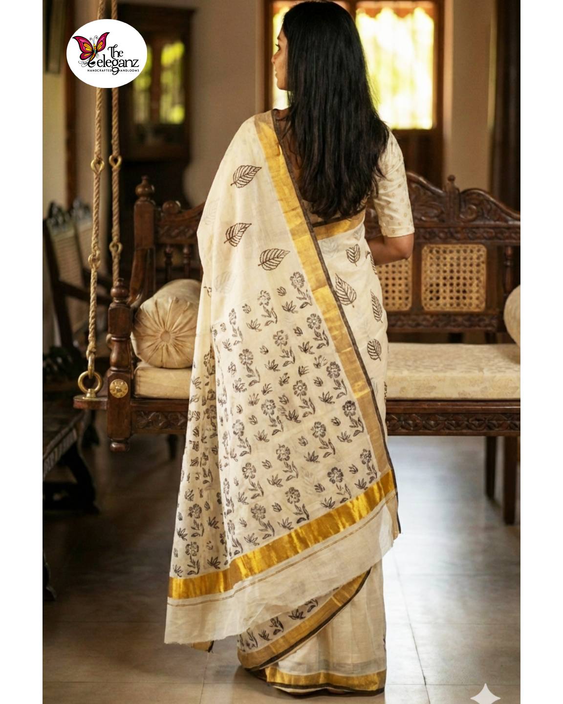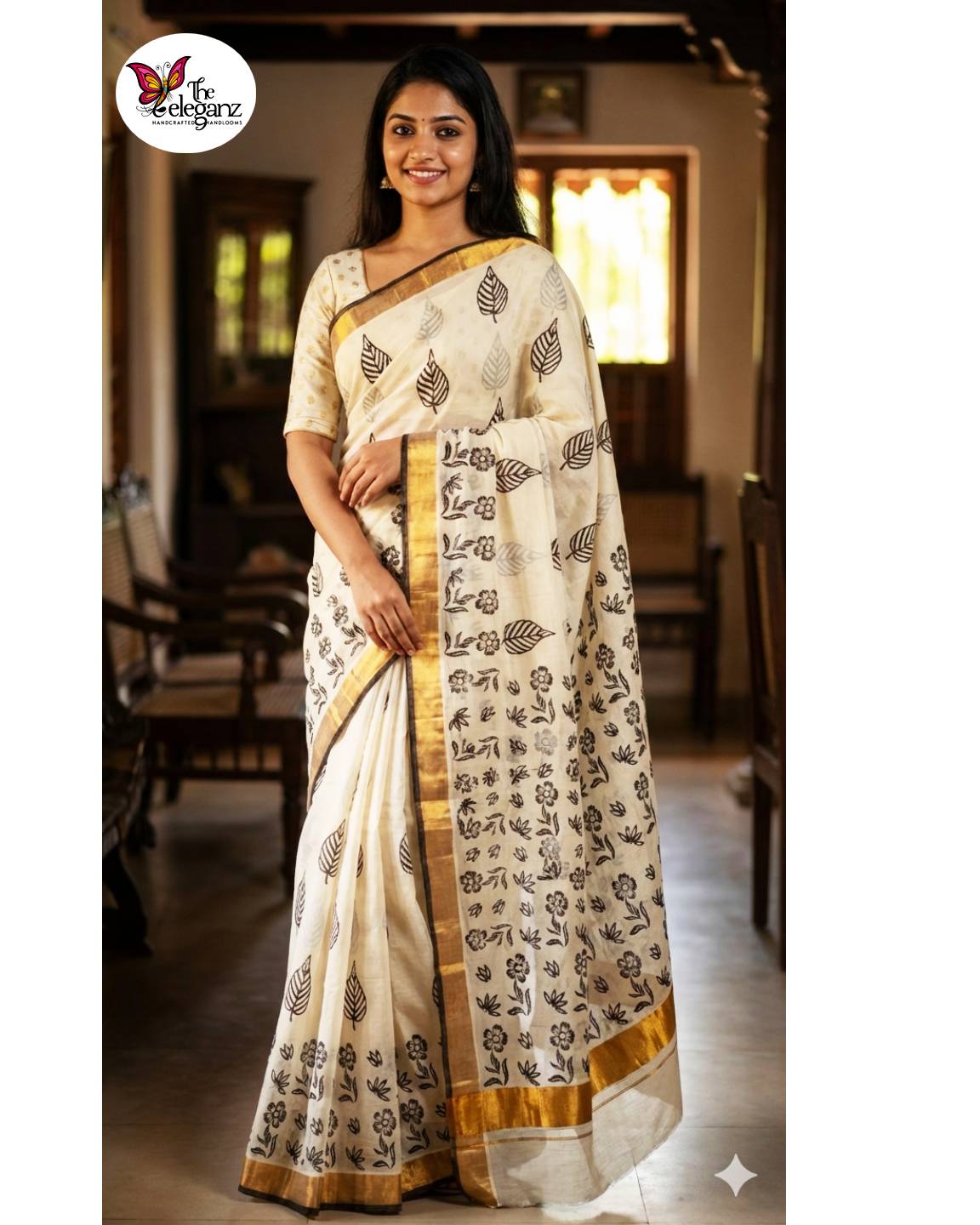 Shubhra Soumya is a classic South Kerala cotton saree that embodies calm elegance and handcrafted simplicity. Woven in a soft off-white base, the saree features delicate hand block printed floral and leaf motifs in earthy black tones. Finished with a traditional golden zari border, it reflects the quiet sophistication Kerala cottons are celebrated for—perfect for festive mornings, temple visits, cultural gatherings, and refined everyday wear.