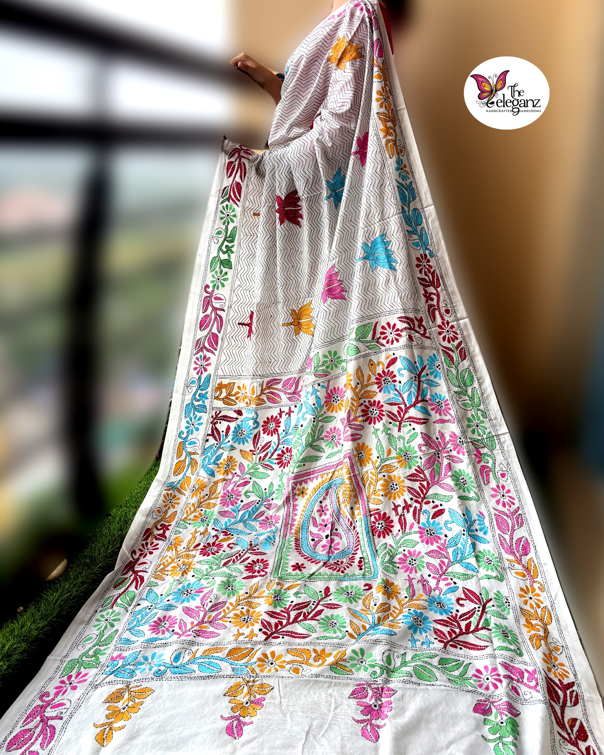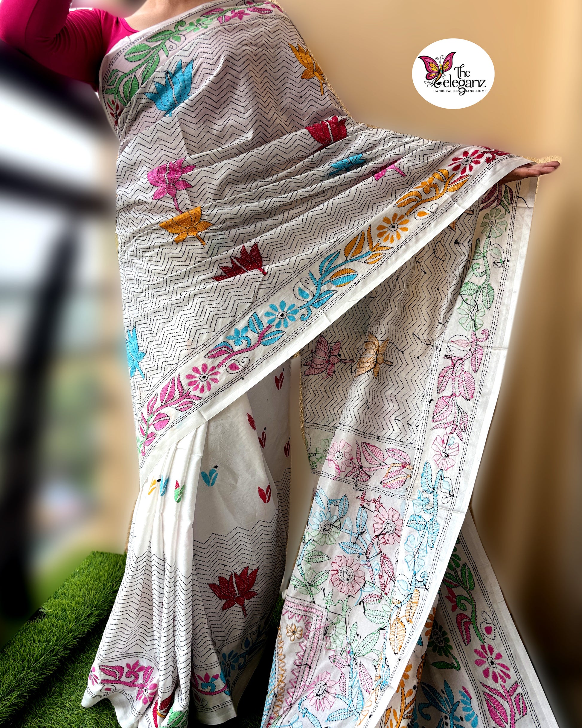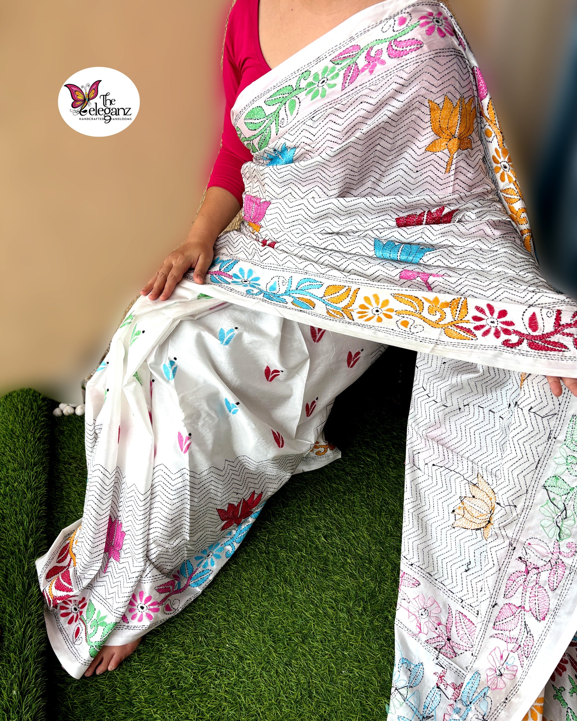 Shubhraa — meaning “pure” and “bright” — is a symphony of serenity and colour. On a pristine white canvas, hand-stitched Kantha blooms unfurl in joyous hues of pink, yellow, blue, and green. Each thread tells a story of patience and craft, turning this saree into a radiant celebration of purity, art, and tradition.