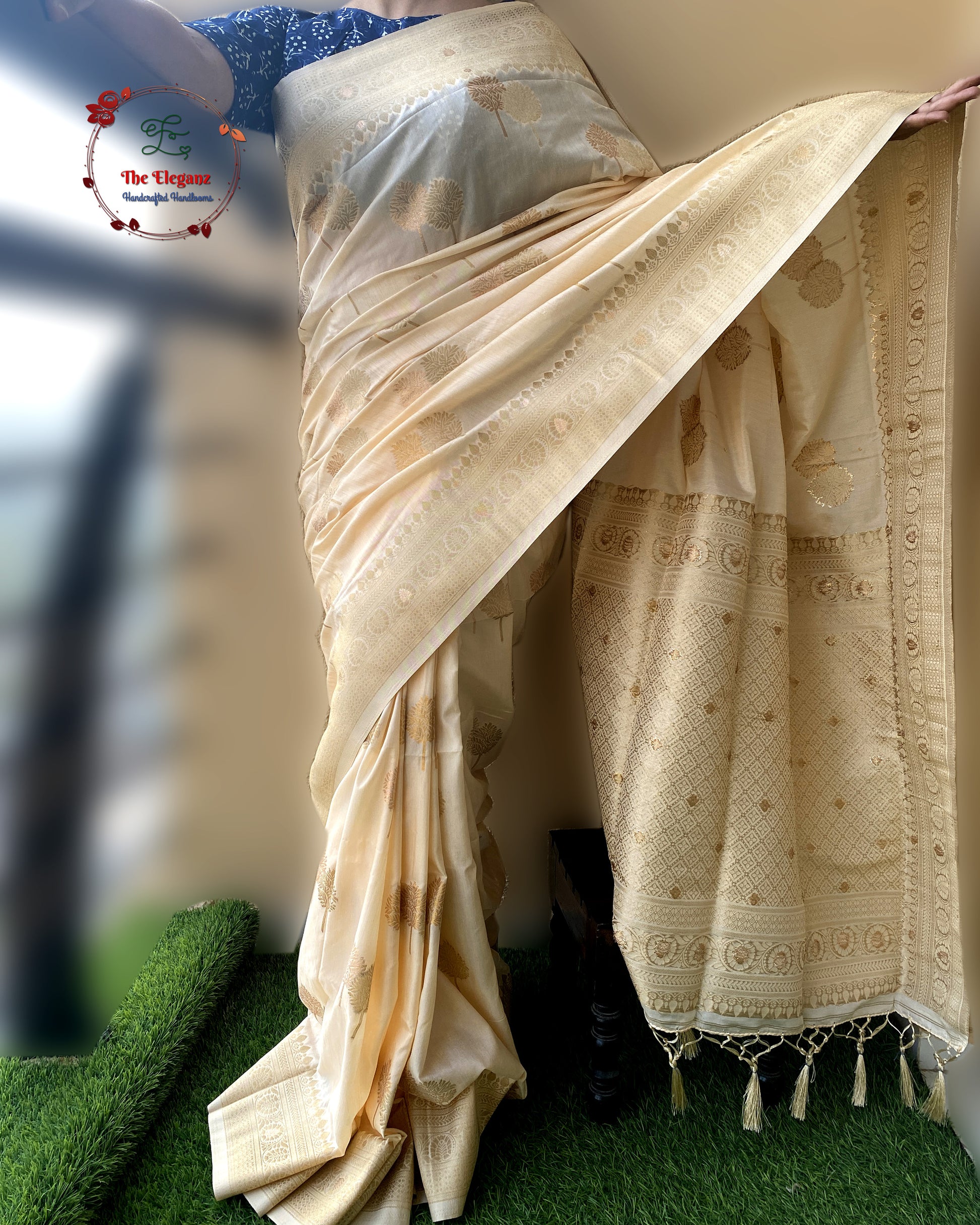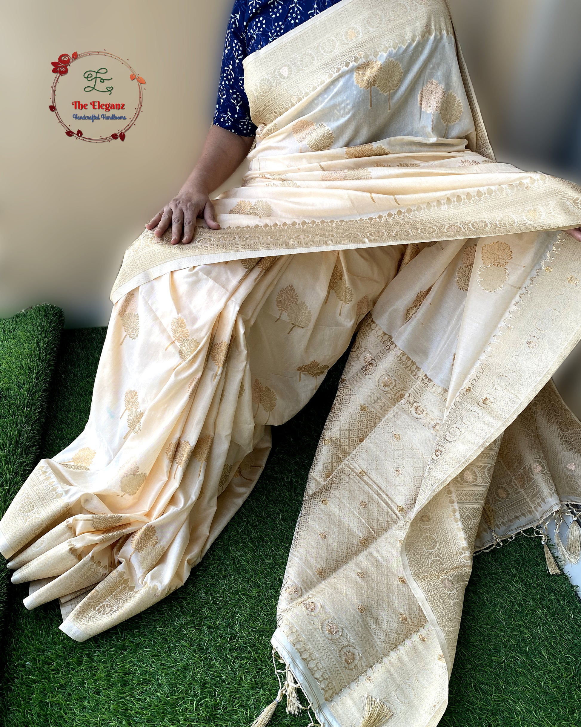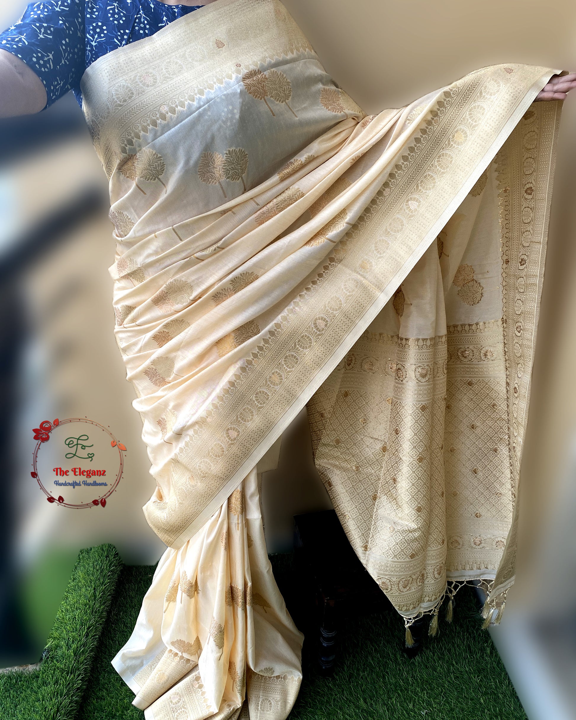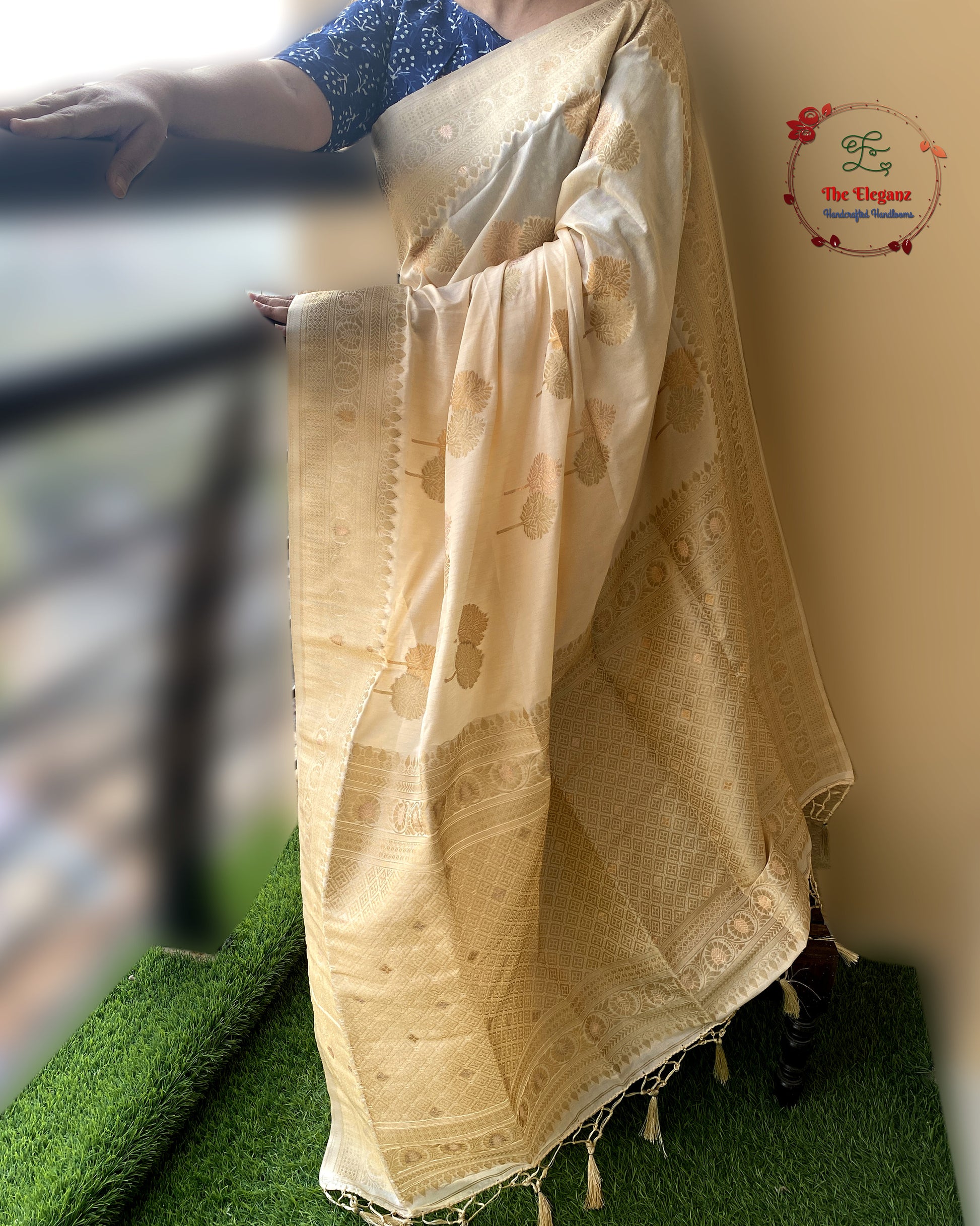 Design: Subtle tree motifs woven across the body with a classic zari border