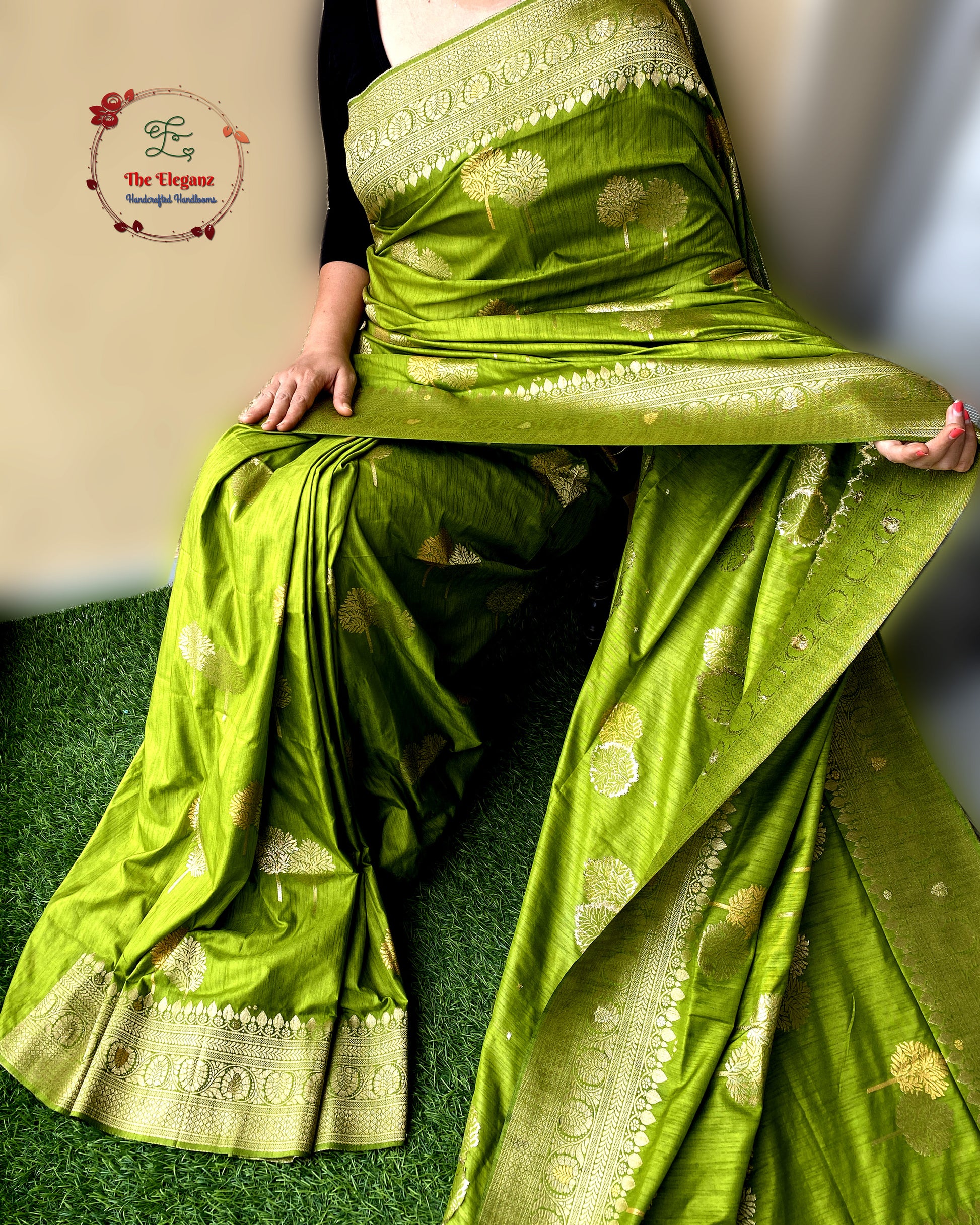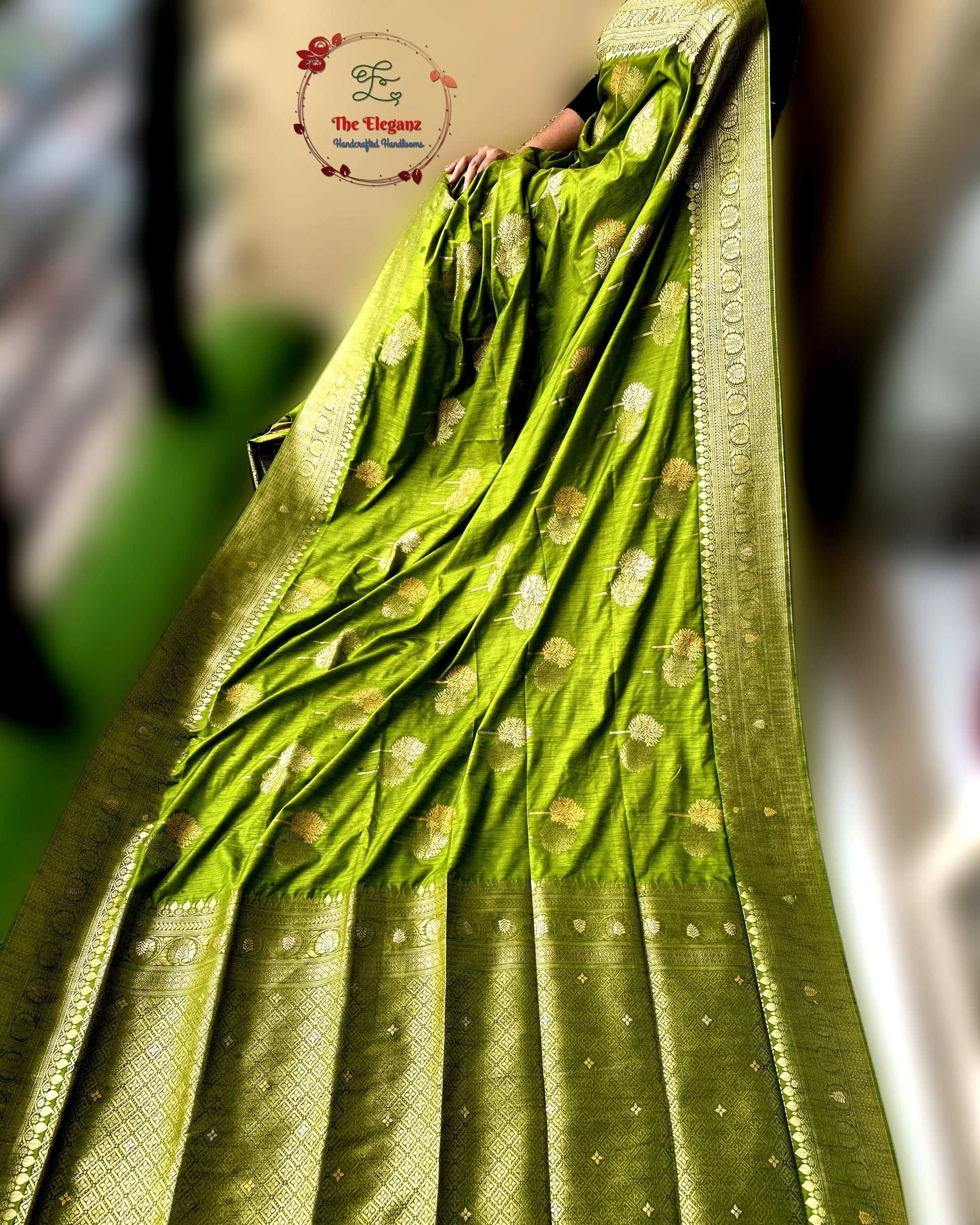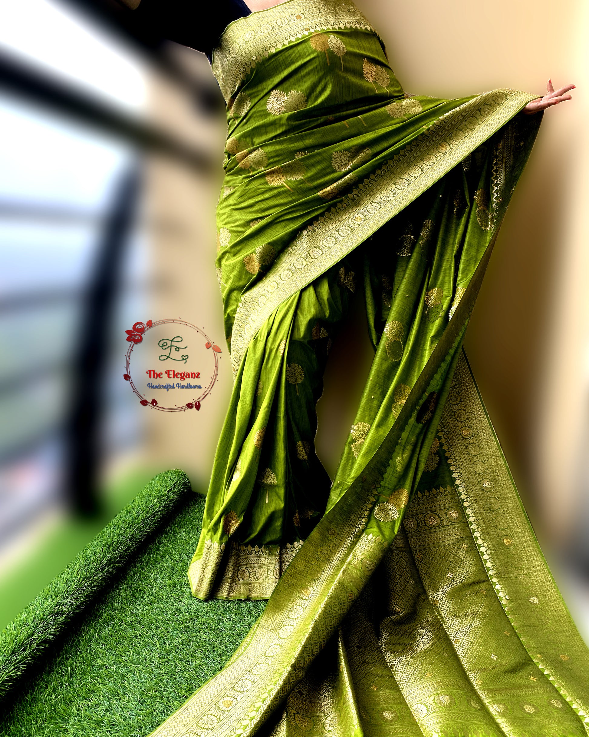 This green Bangalori Dola silk drape gleams with the vitality of spring, adorned with golden zari motifs that whisper tales of prosperity and grace. A saree that balances elegance with vibrance — perfect for festive mornings and cultural celebrations.