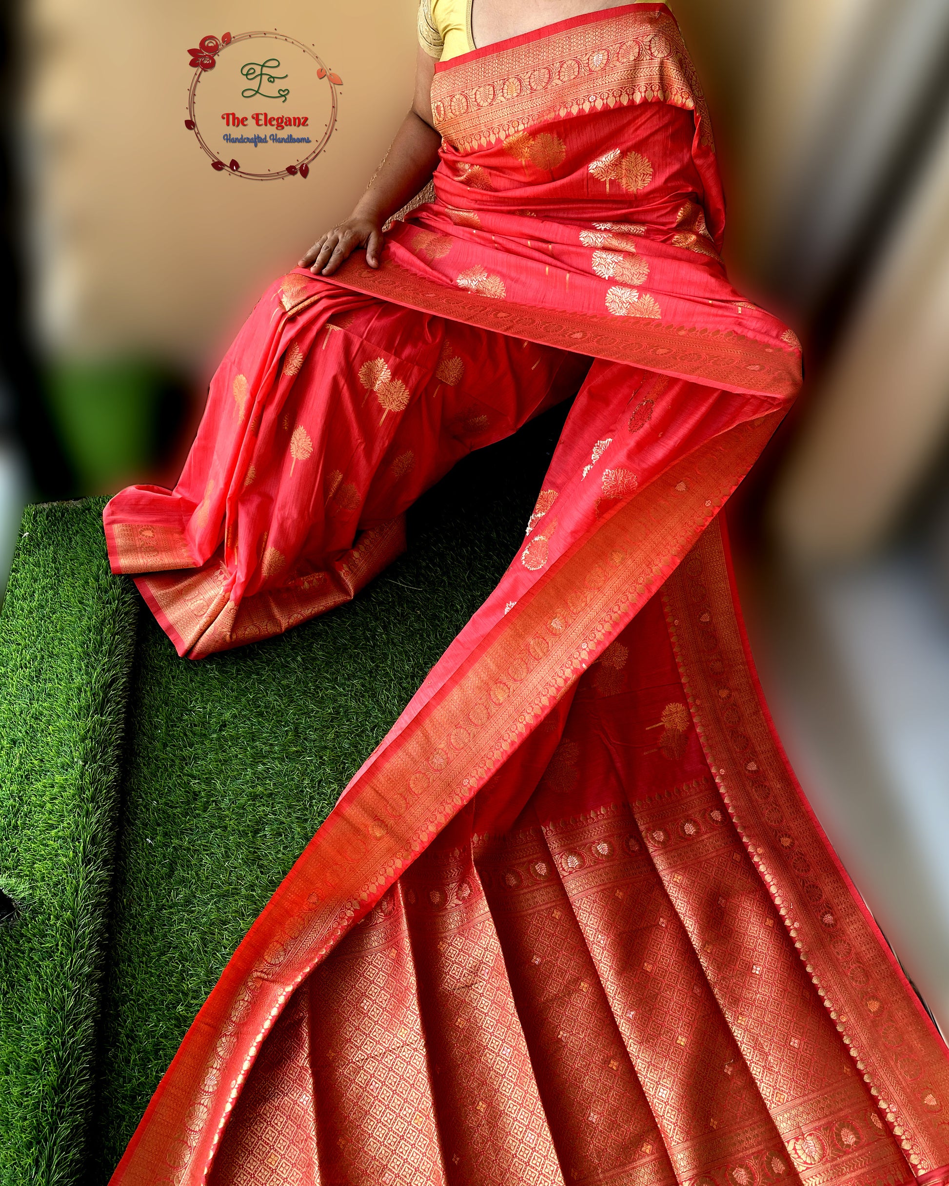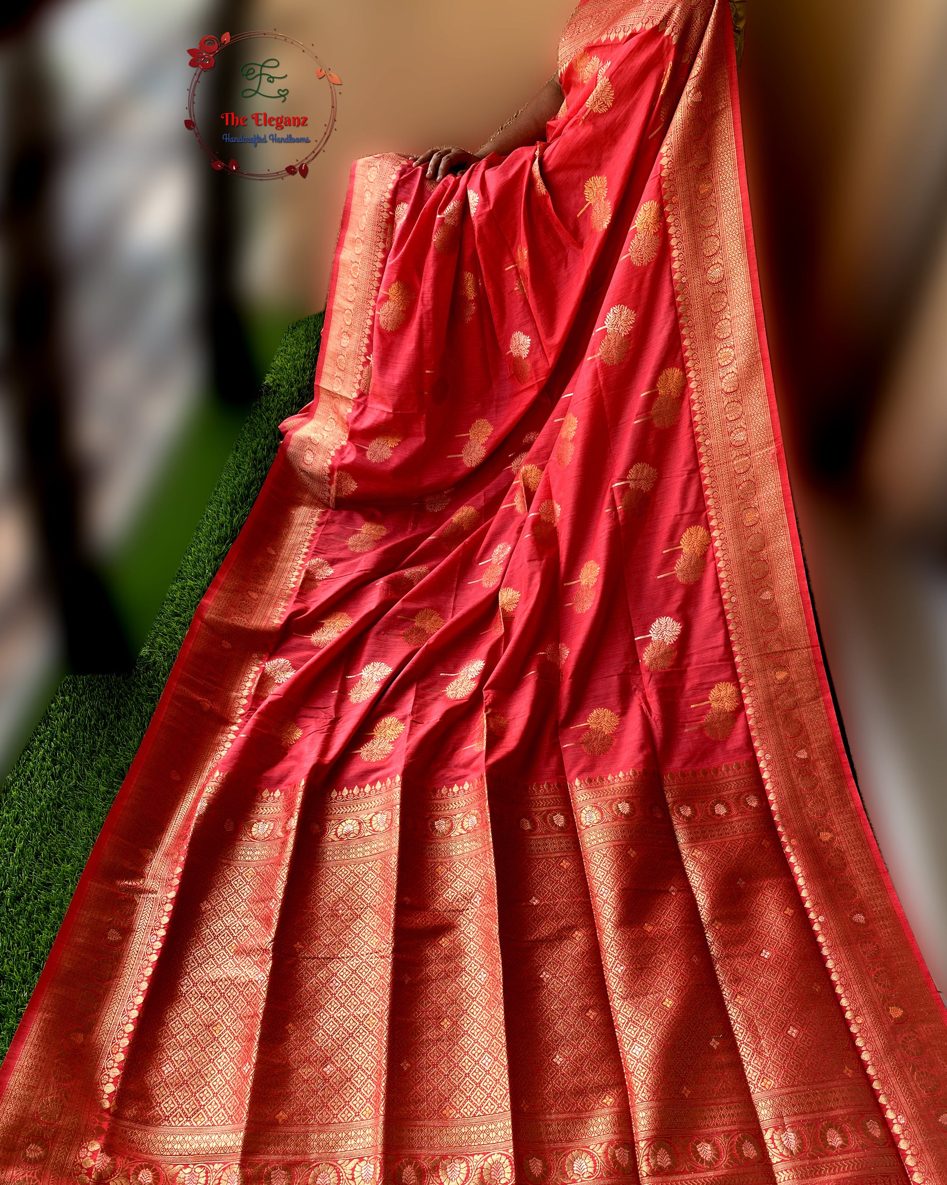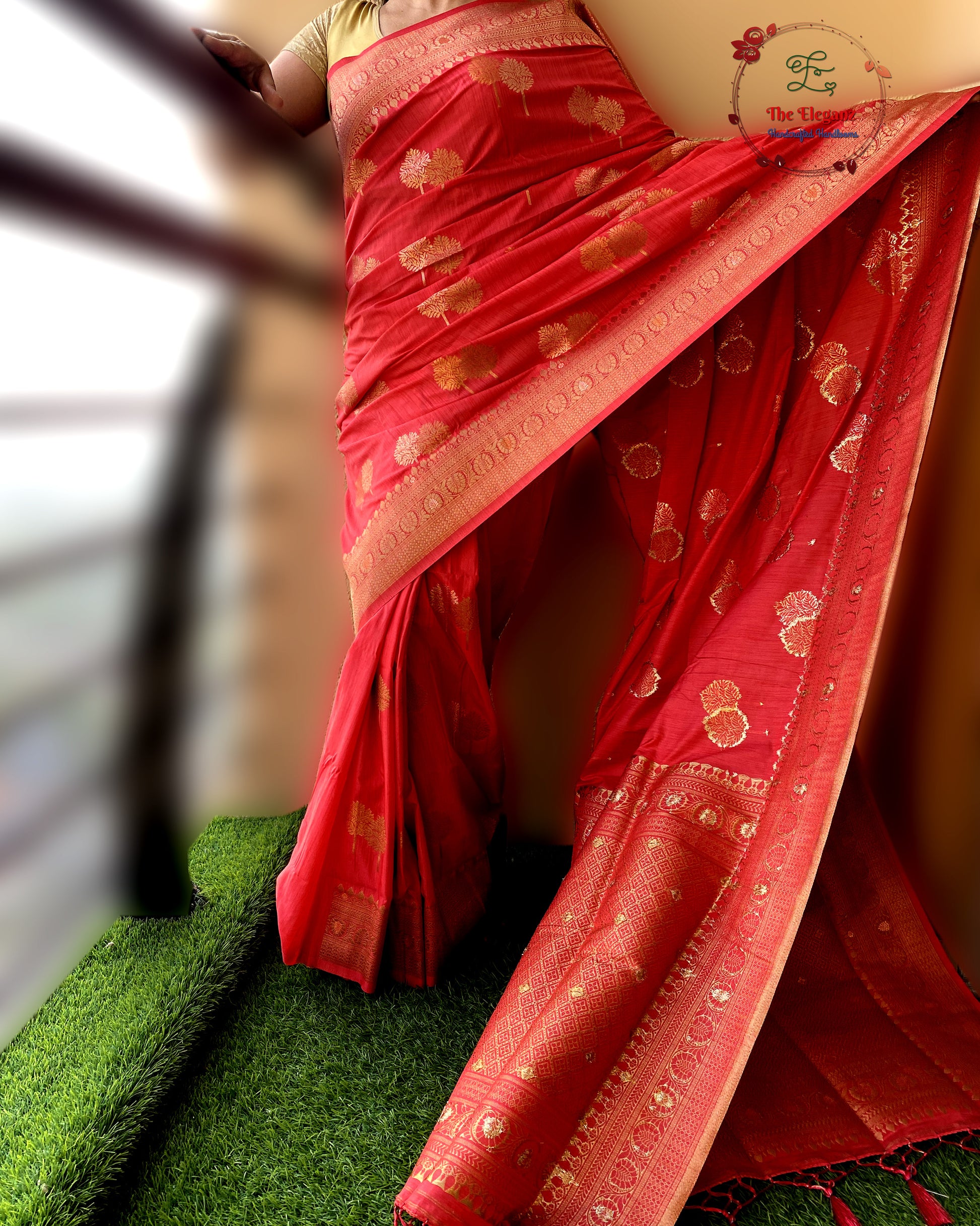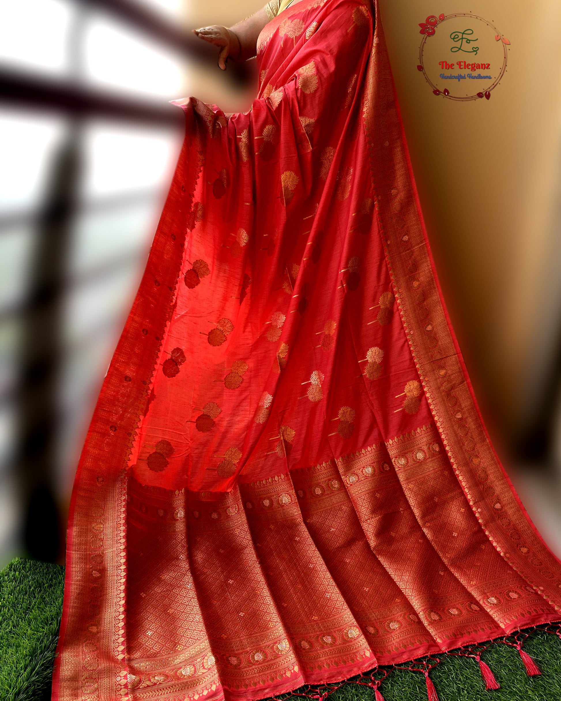 A saree that glows like twilight embers, this red Bangalori Dola silk drape shines with golden butis and a regal zari border. It whispers grace with every fold, making tradition meet effortless elegance.