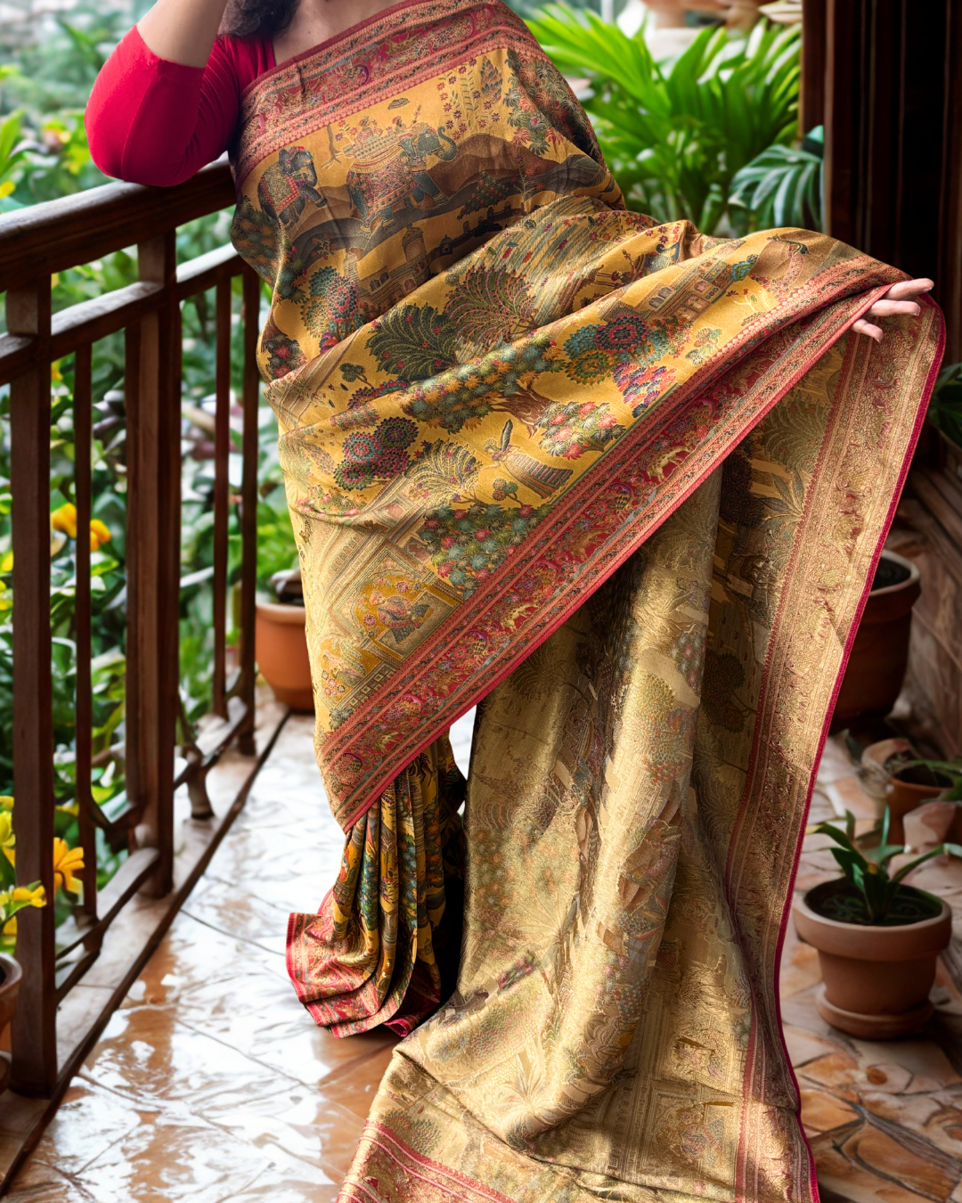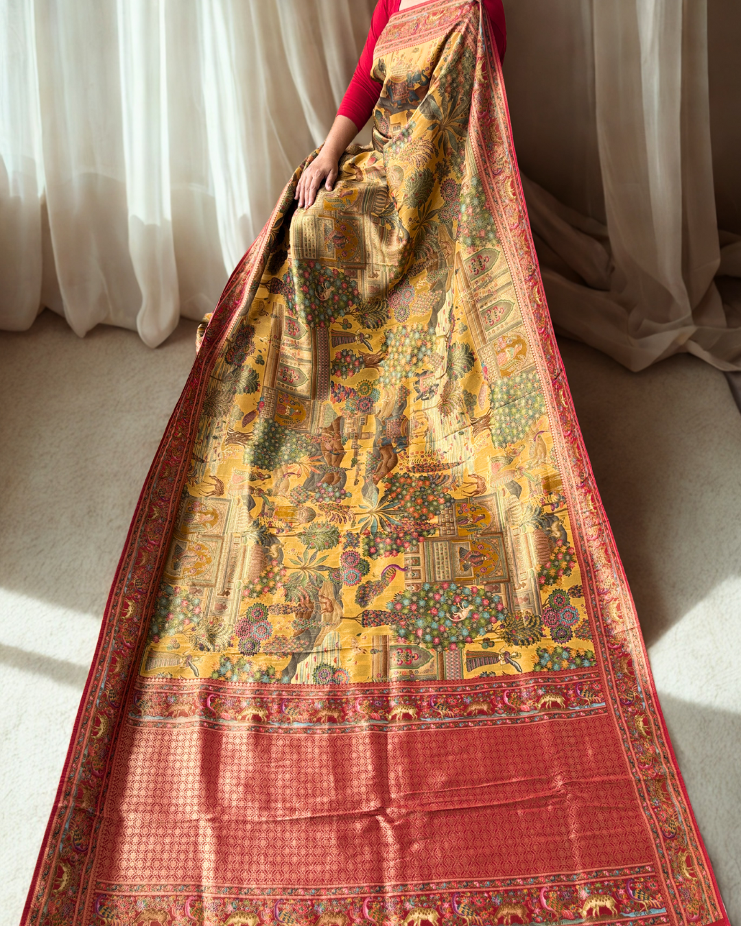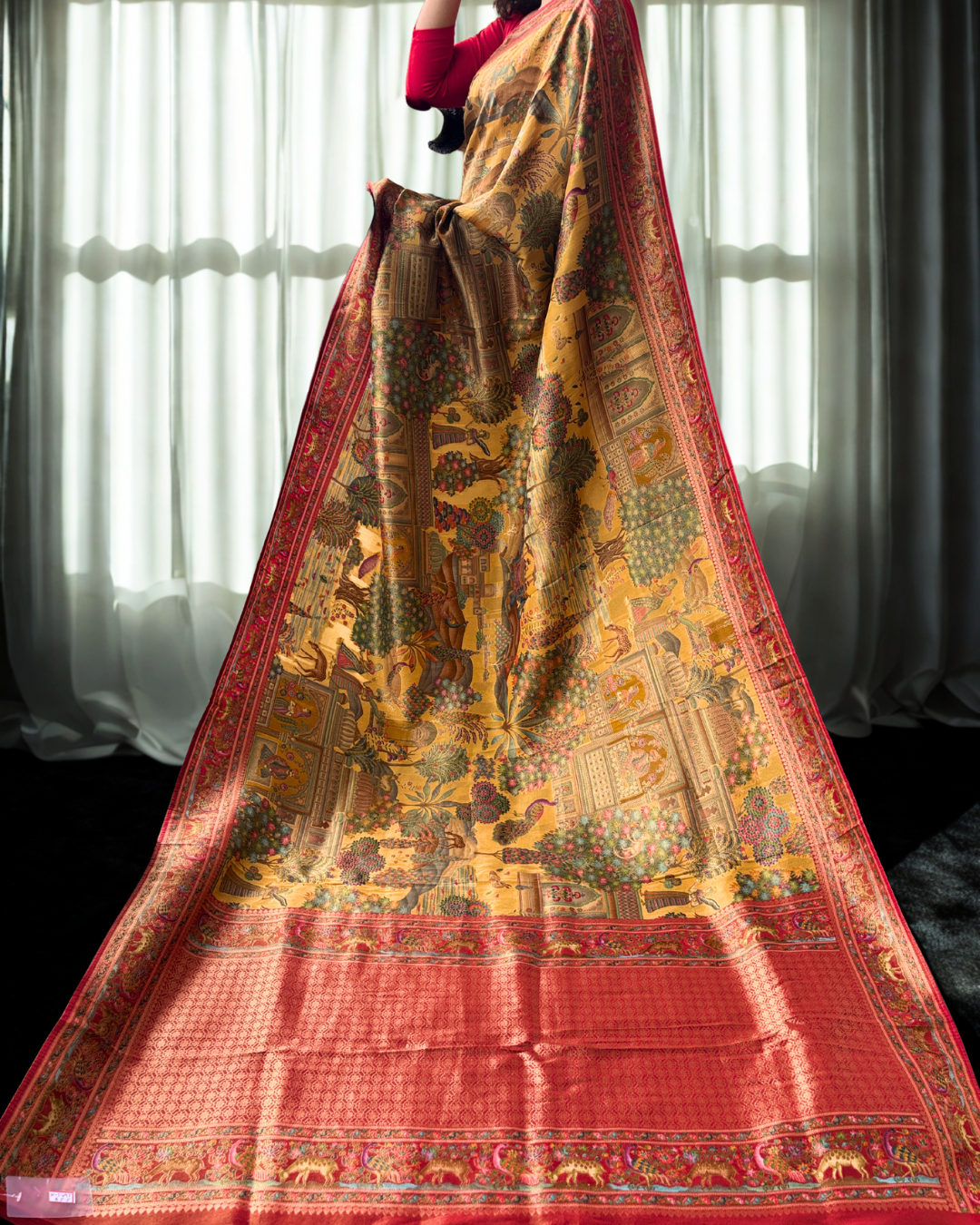 A regal drape that tells stories in threads — this Kanni silk khaddi saree is a handwoven masterpiece with intricate motifs sprawling across its full woven body. Reminiscent of royal courts and Mughal gardens, its opulent design radiates timeless luxury. With a golden yellow base glowing like dawn and a red border echoing festive grandeur, this saree is a heritage in motion — perfect for a queenly presence.