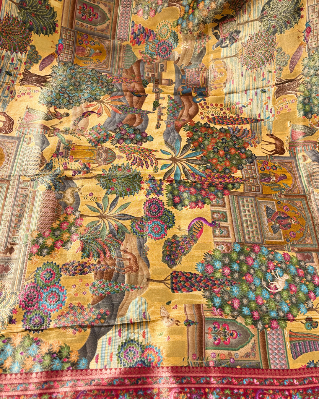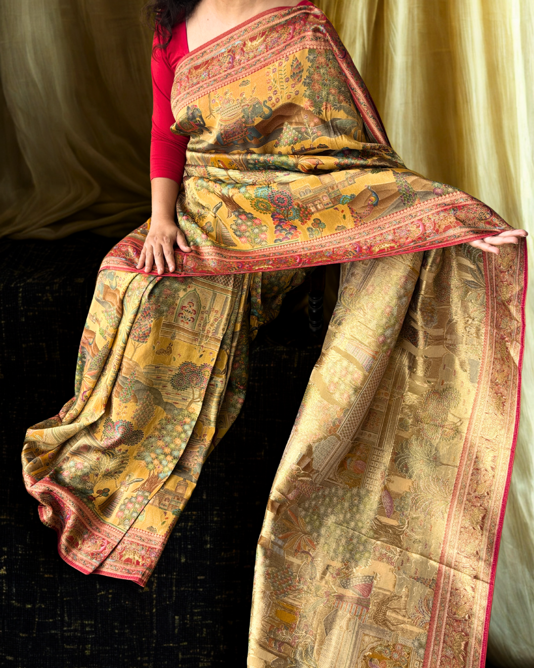 Origin: Kanni weaving tradition, inspired by Kashmiri craftsmanship & Mughal artistry