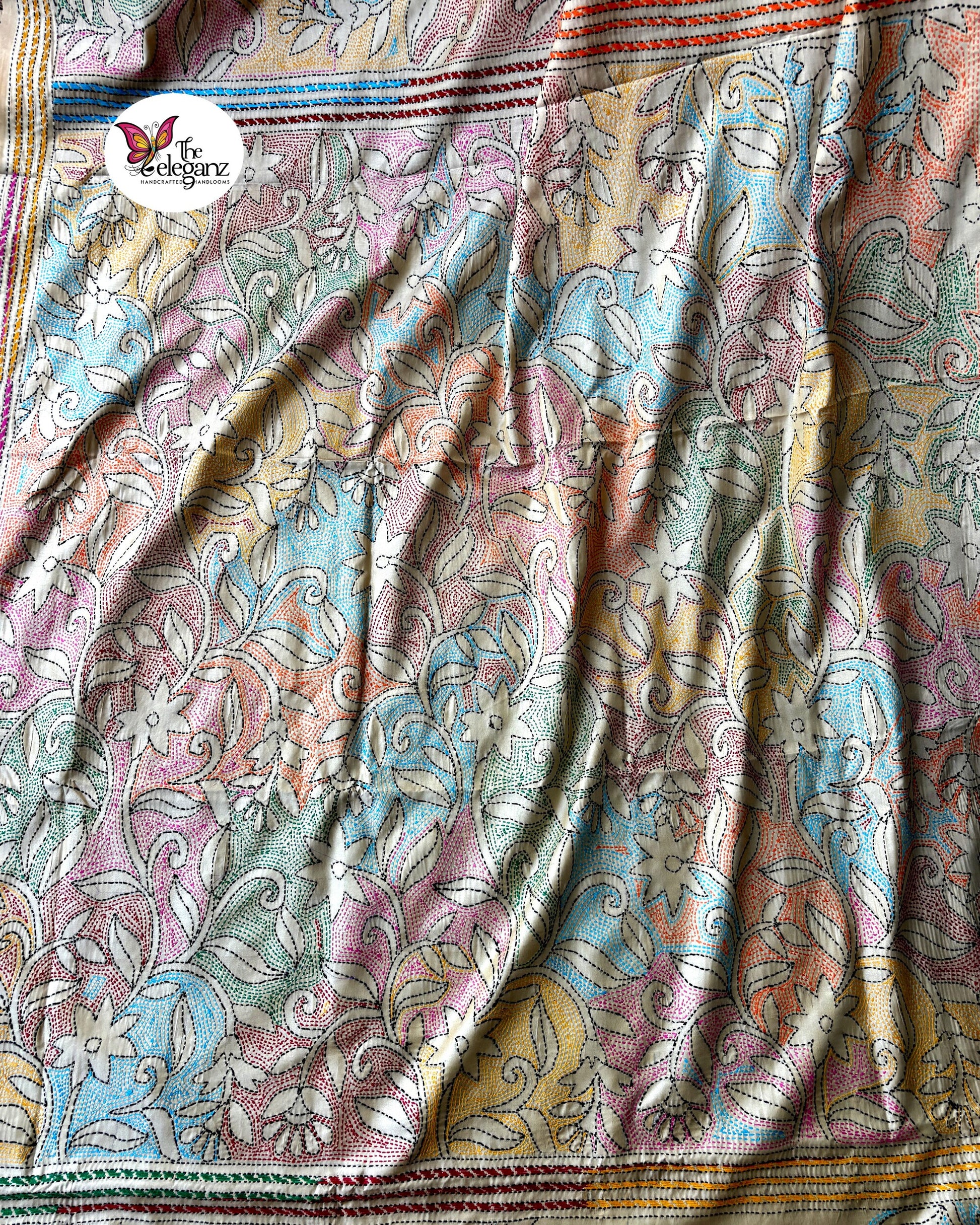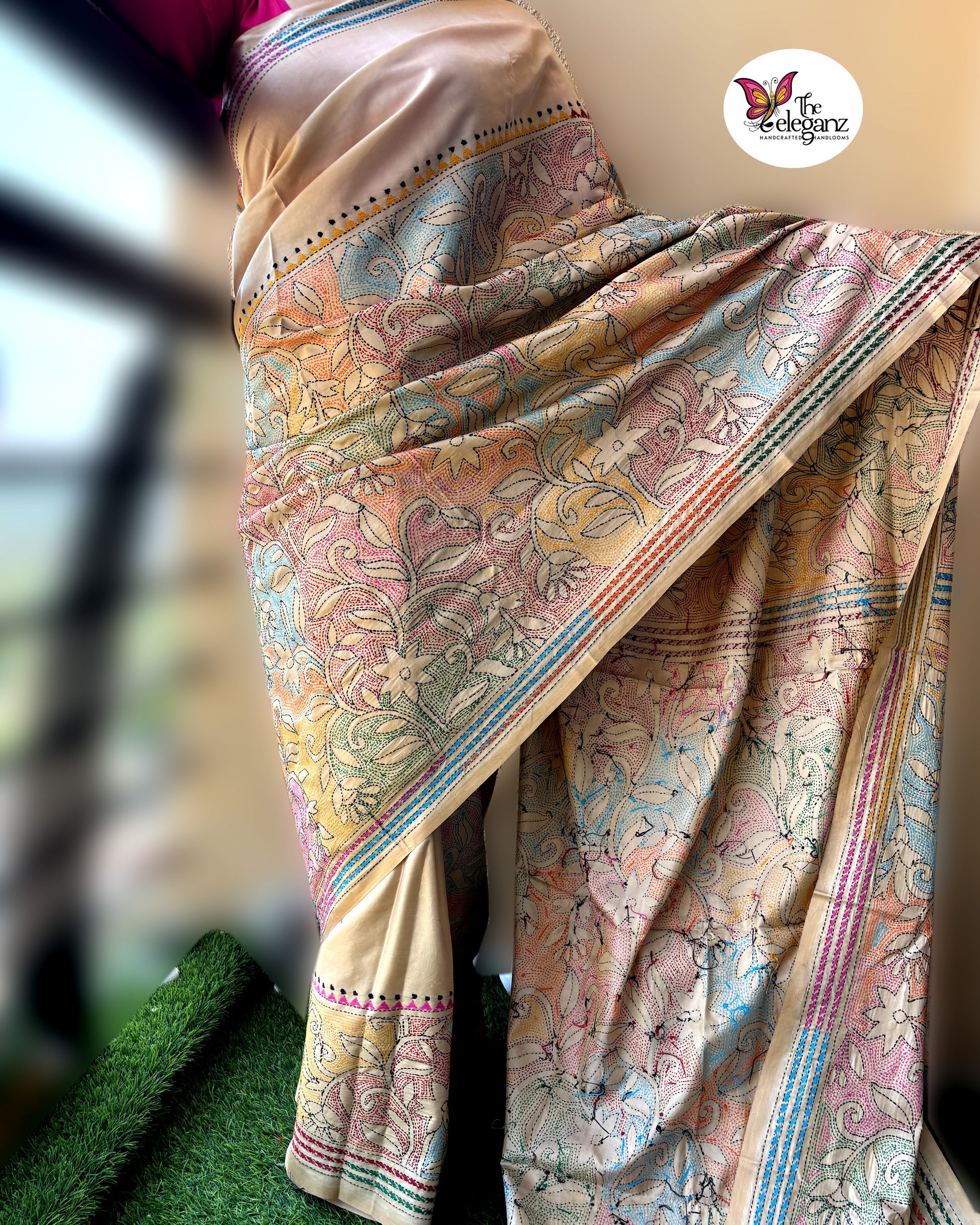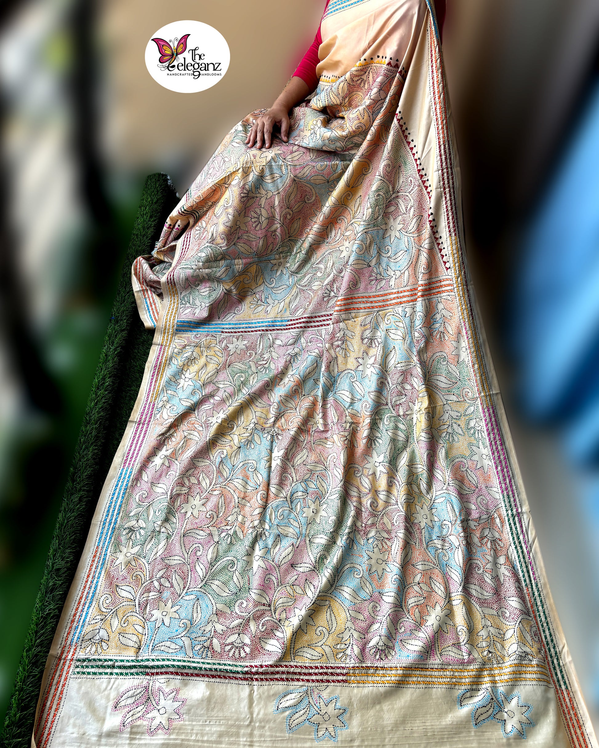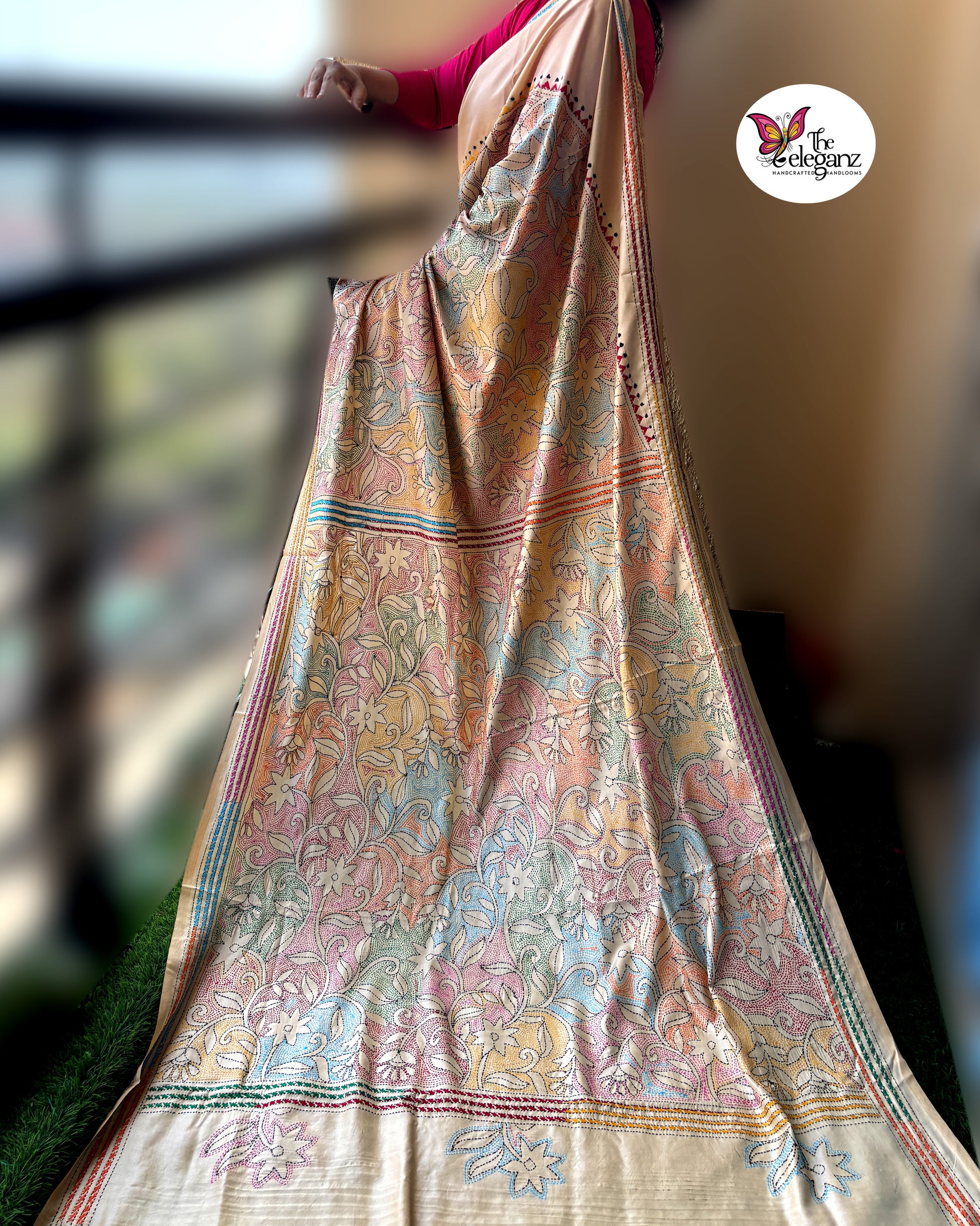 Pastel Tussar silk kissed with rainbow-hued stitches, a gentle floral dream that whispers elegance in every fold.