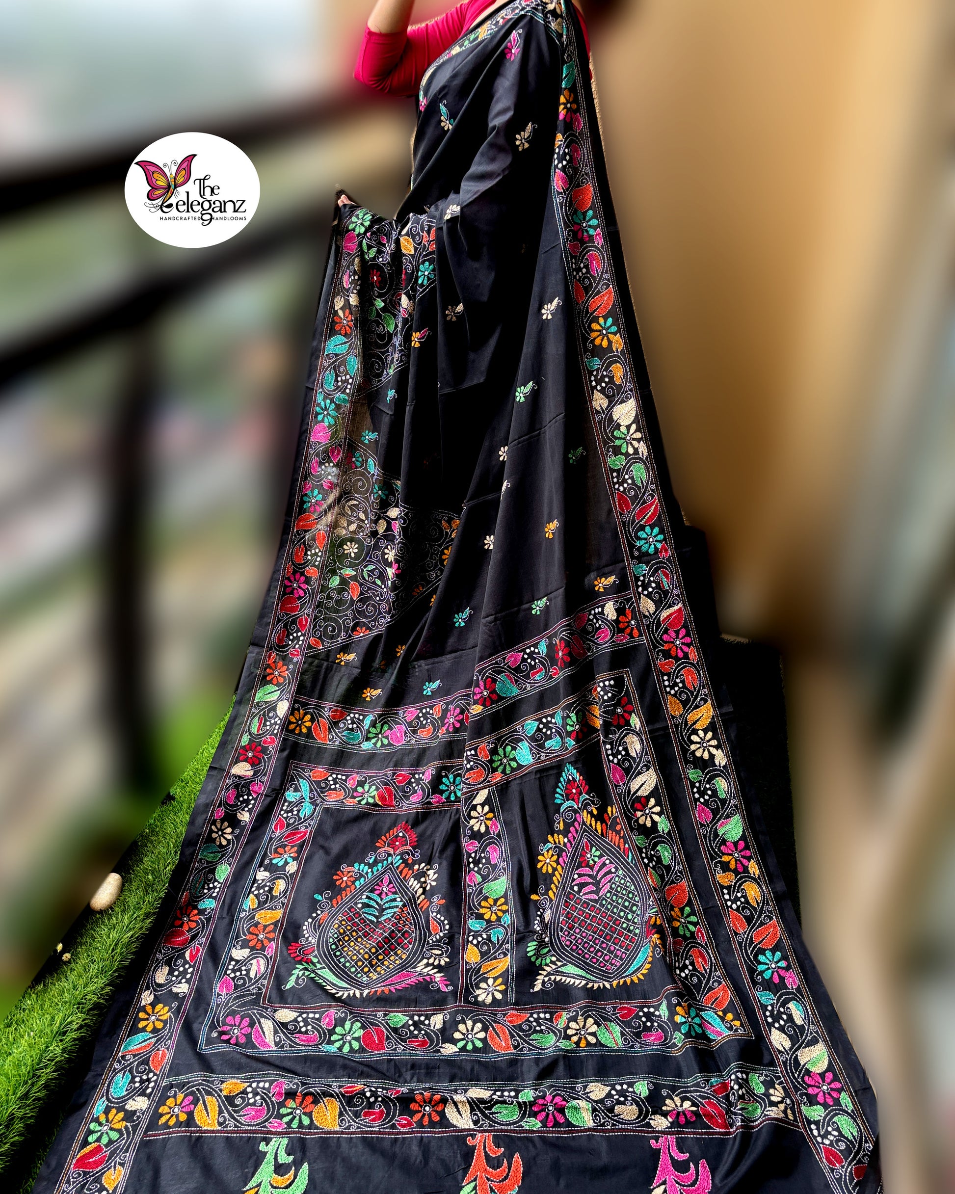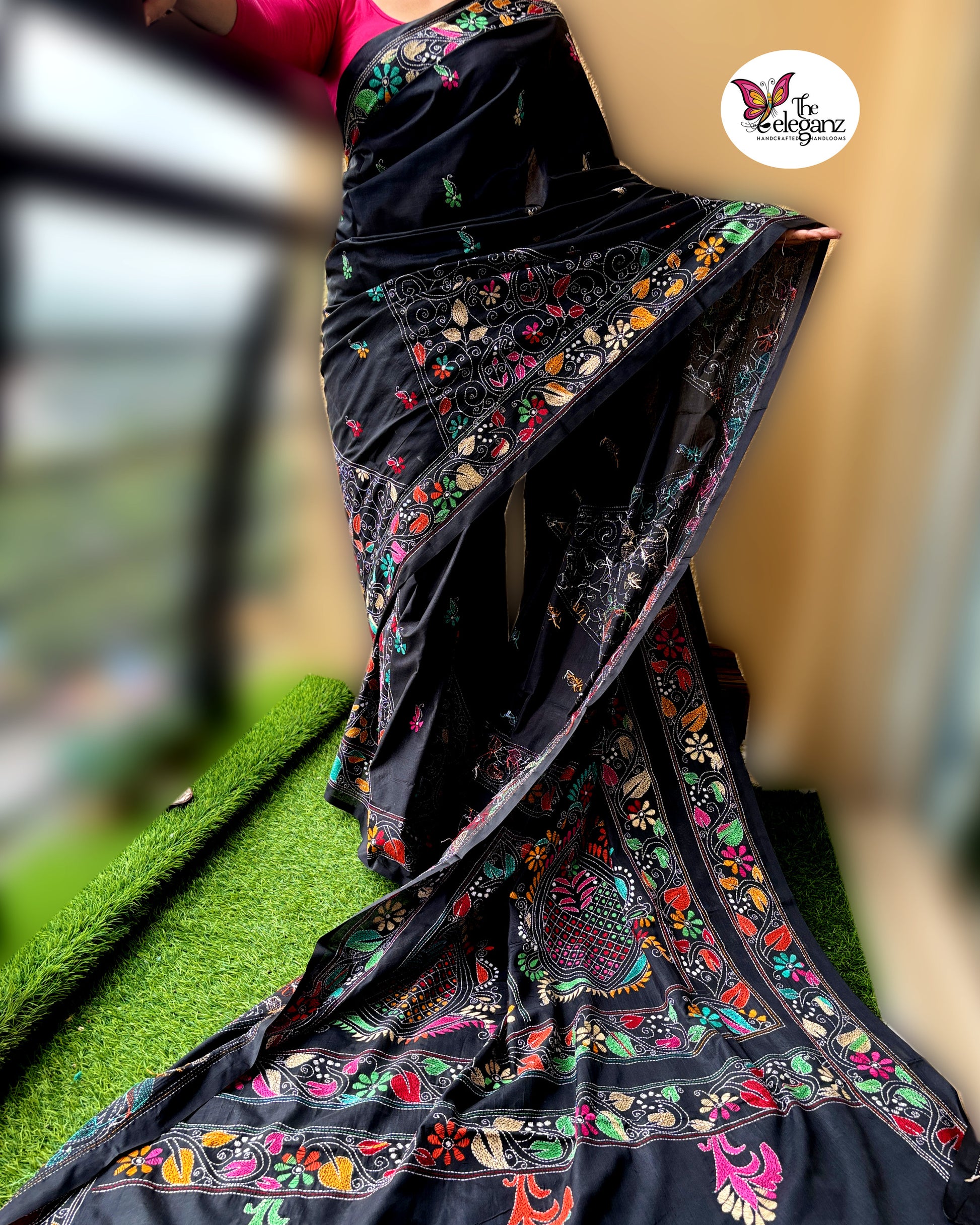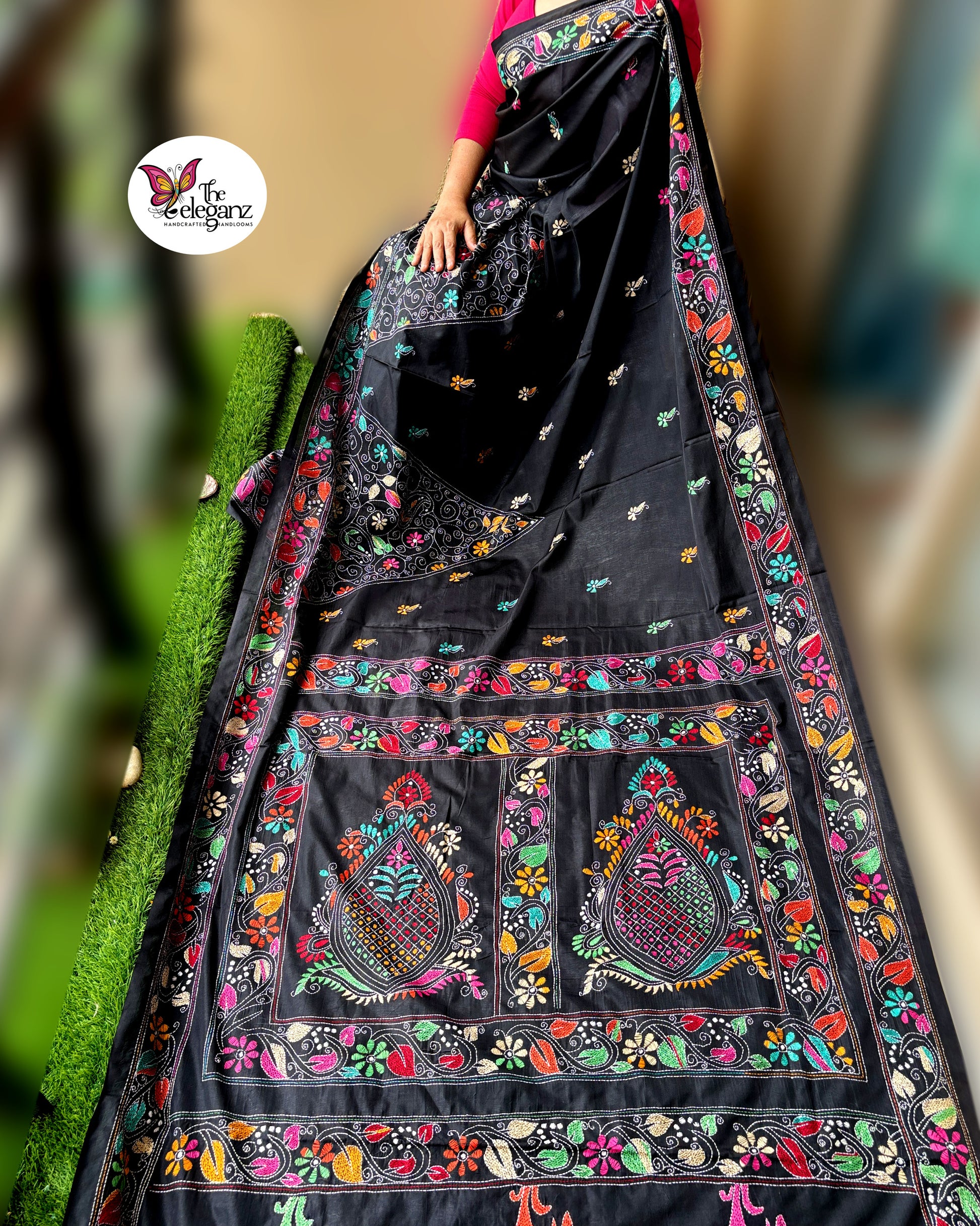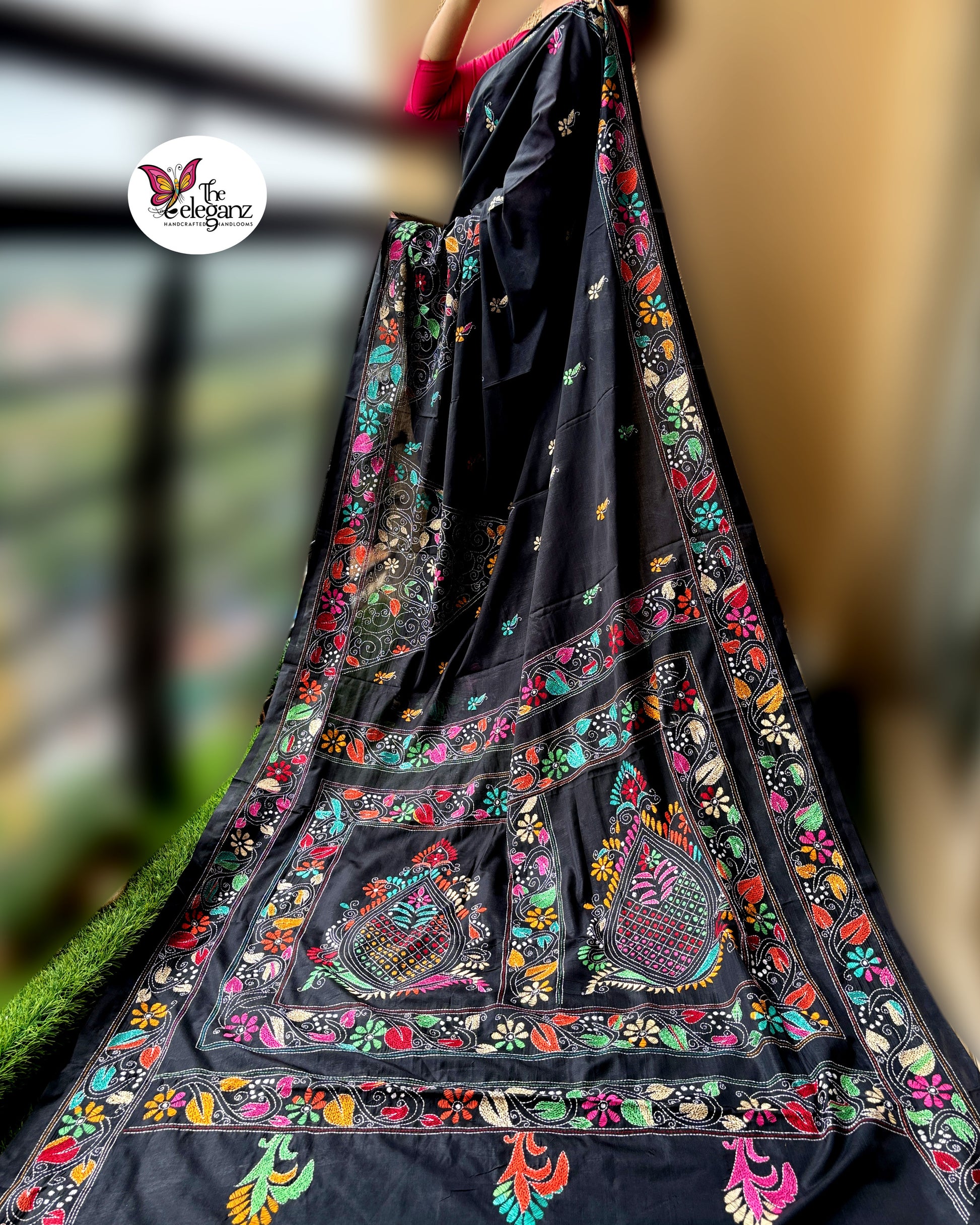 Work: Handcrafted Kantha stitch embroidery across the body, border, and pallu