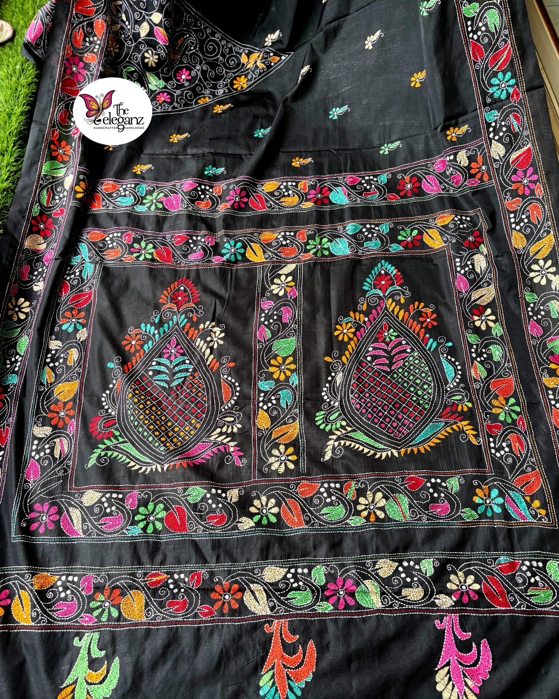 Tamraa is where darkness meets colour — a canvas of deep black that bursts into life with vivid hand-stitched florals and paisleys. Every Kantha thread gleams like twilight stars, turning simplicity into splendour. This saree celebrates the harmony of contrast — bold yet graceful, rich yet rooted in artisanal soul.
