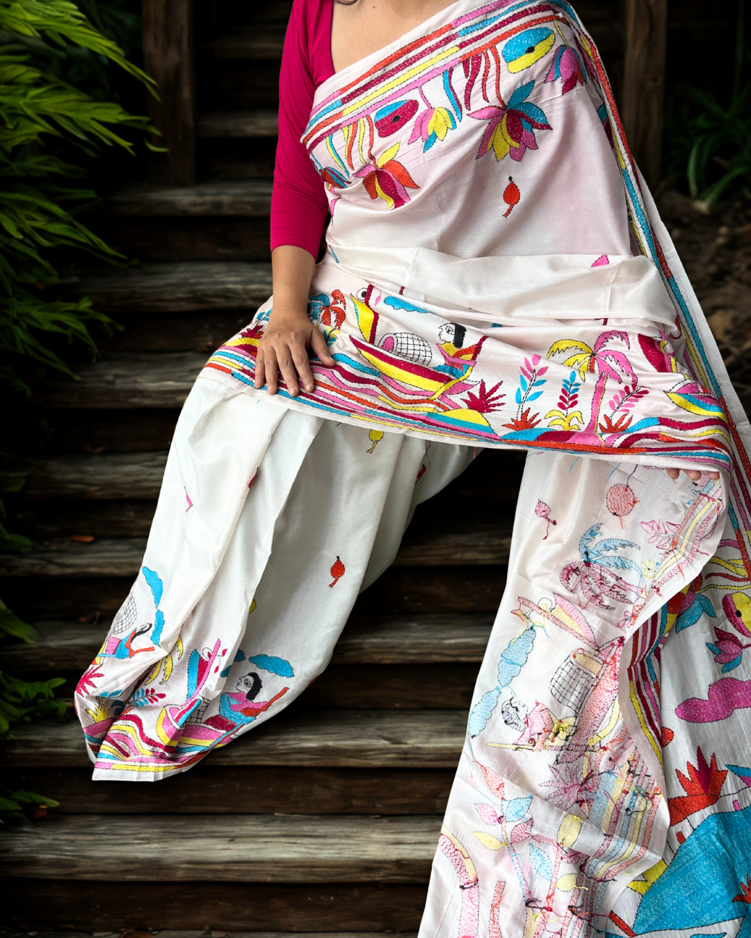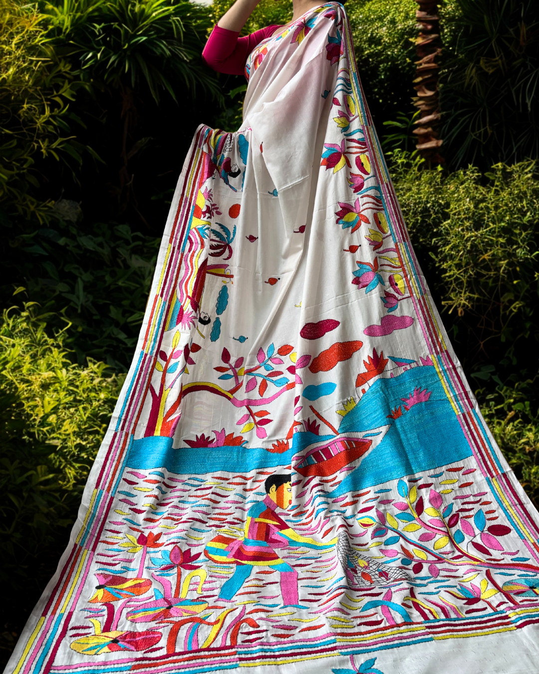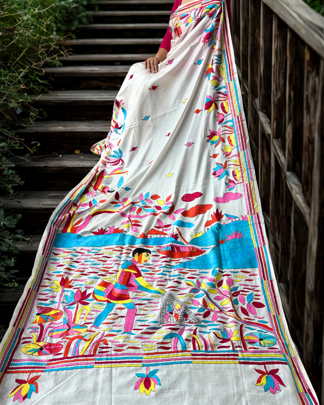 Upon the canvas of ivory, a story unfolds — a lone fisherman casting his net amidst rippling waters, stitched in vivid hues of Kantha. Each thread captures the rhythm of village life, where art, livelihood, and tradition flow as one. This saree is not just a drape but a narrative woven by hand, celebrating Bengal’s timeless storytelling heritage.
