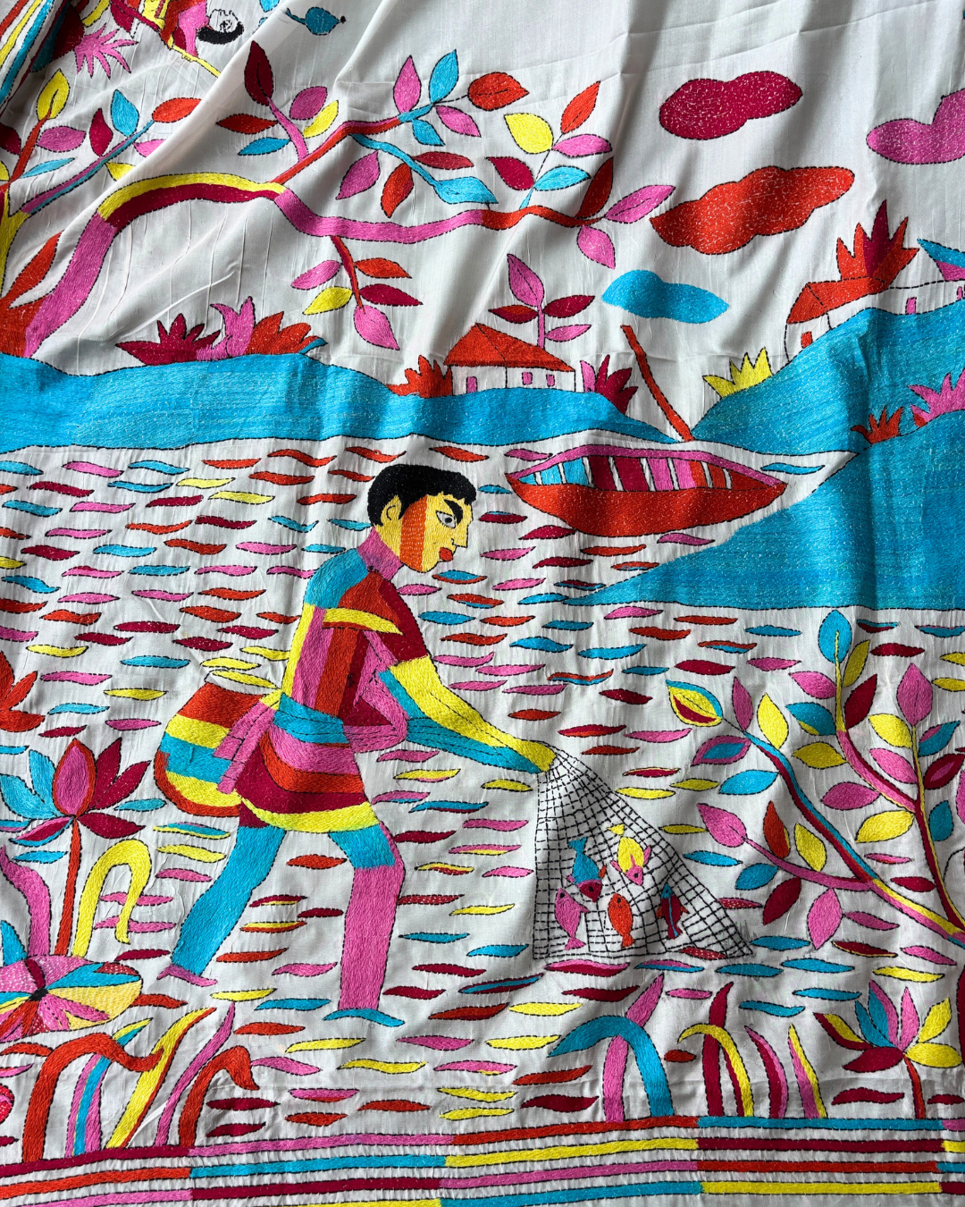 Work: Hand Kantha Stitch embroidery with narrative folk scene — fisherman, river, florals, and village motifs