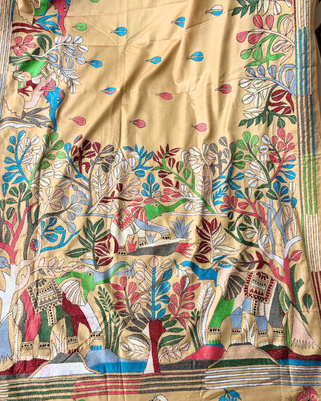 Colour: Beige base with multi-coloured Kantha stitches (red, green, blue, black, and ivory highlights)