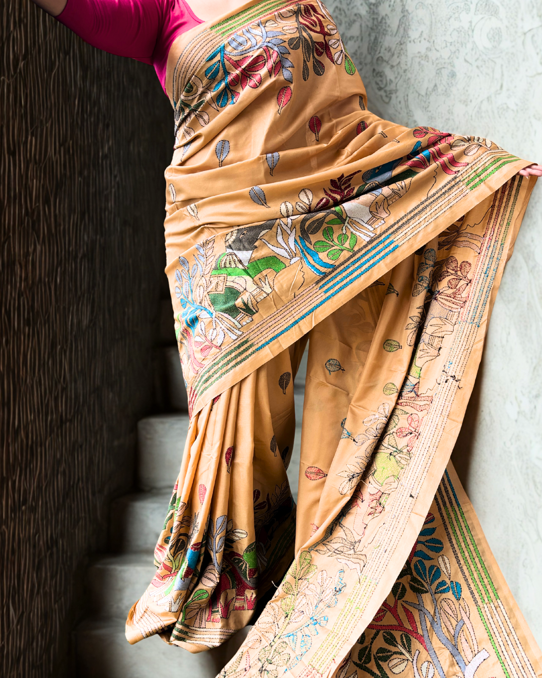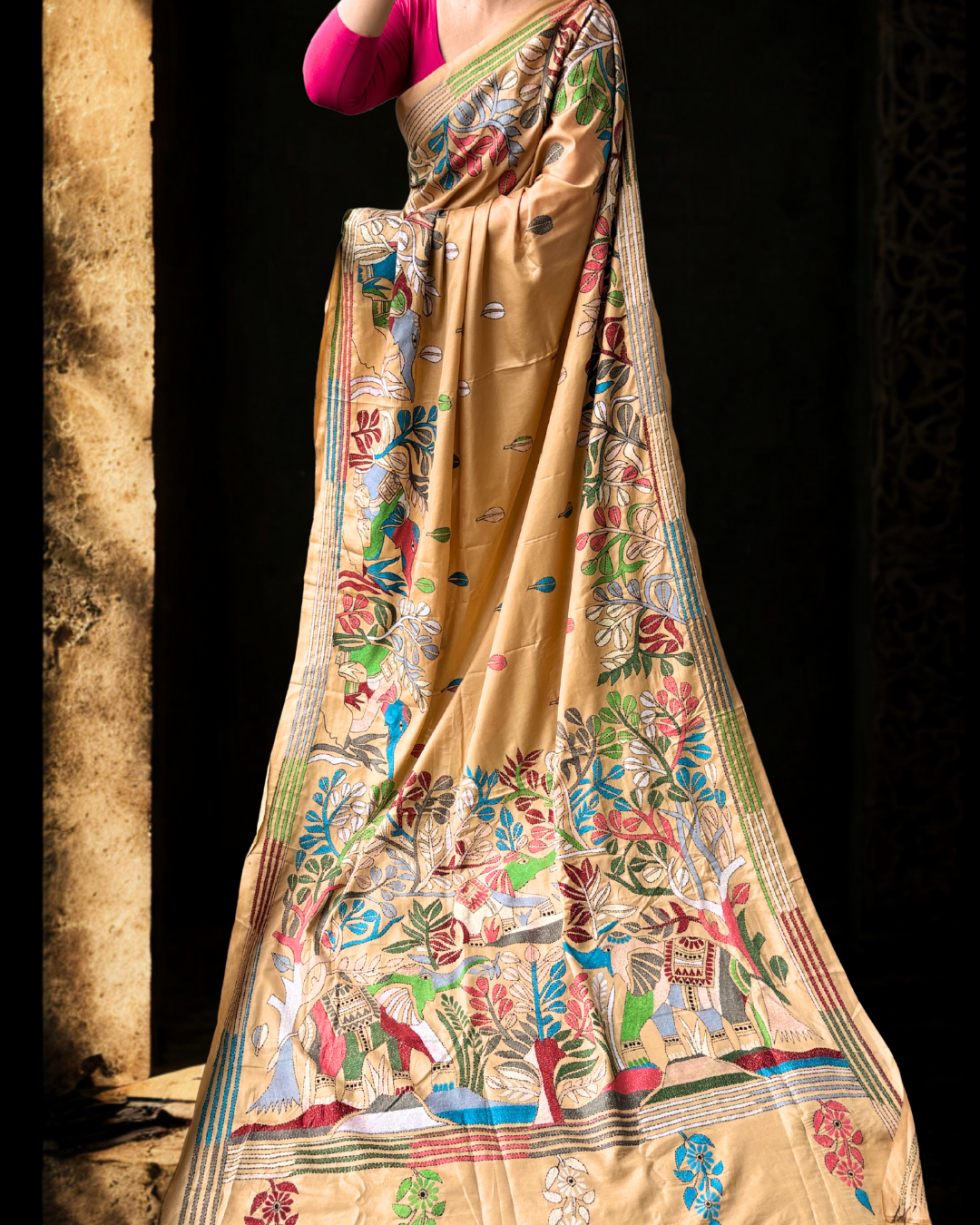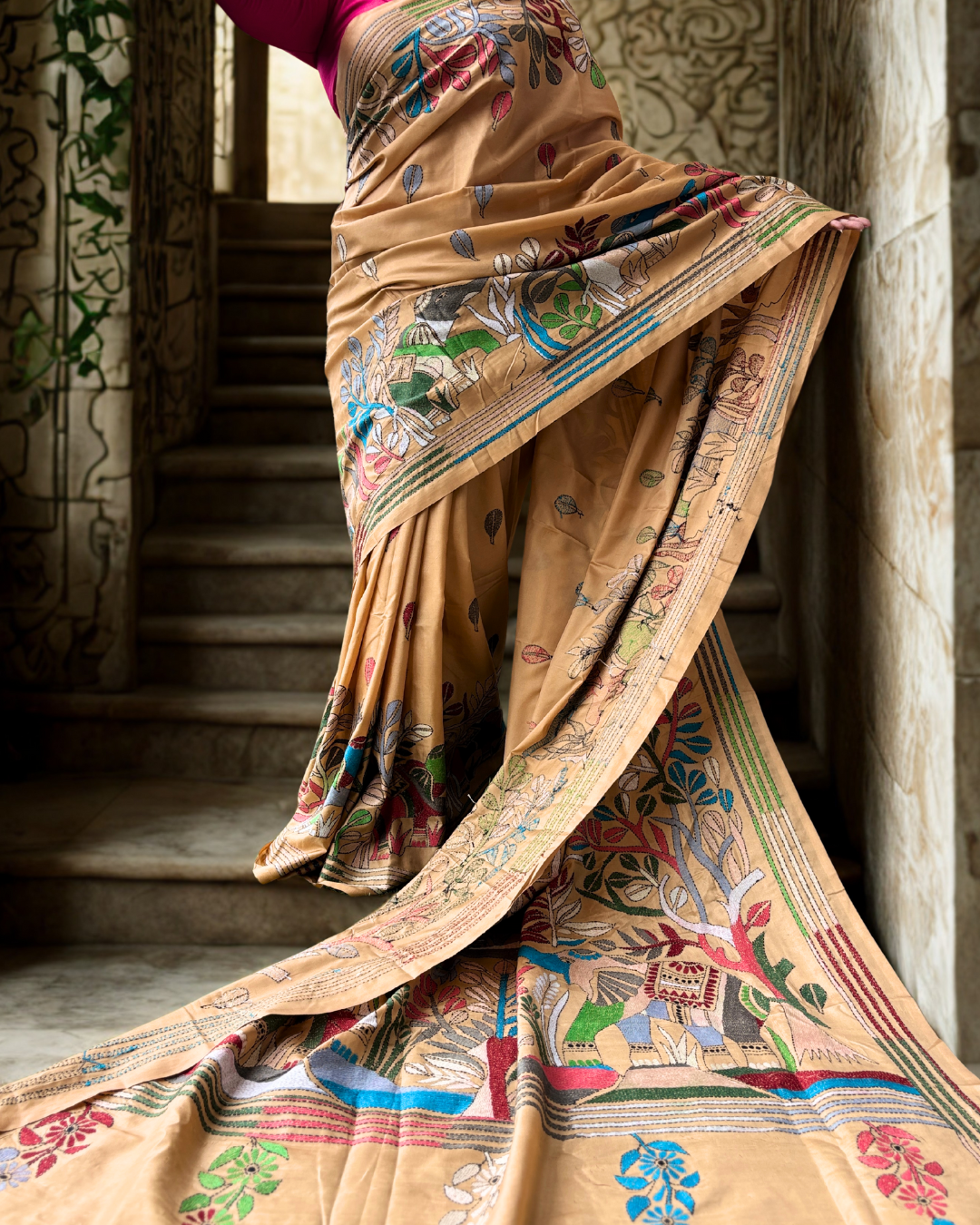 A canvas of nature, hand-embroidered in vibrant Kantha stitches, this saree tells stories of trees, homes, and elephants under the shade of the forest. Each thread whispers folklore of Bengal’s heritage, transforming fabric into a tapestry of living art. A drape that is not just worn, but experienced.