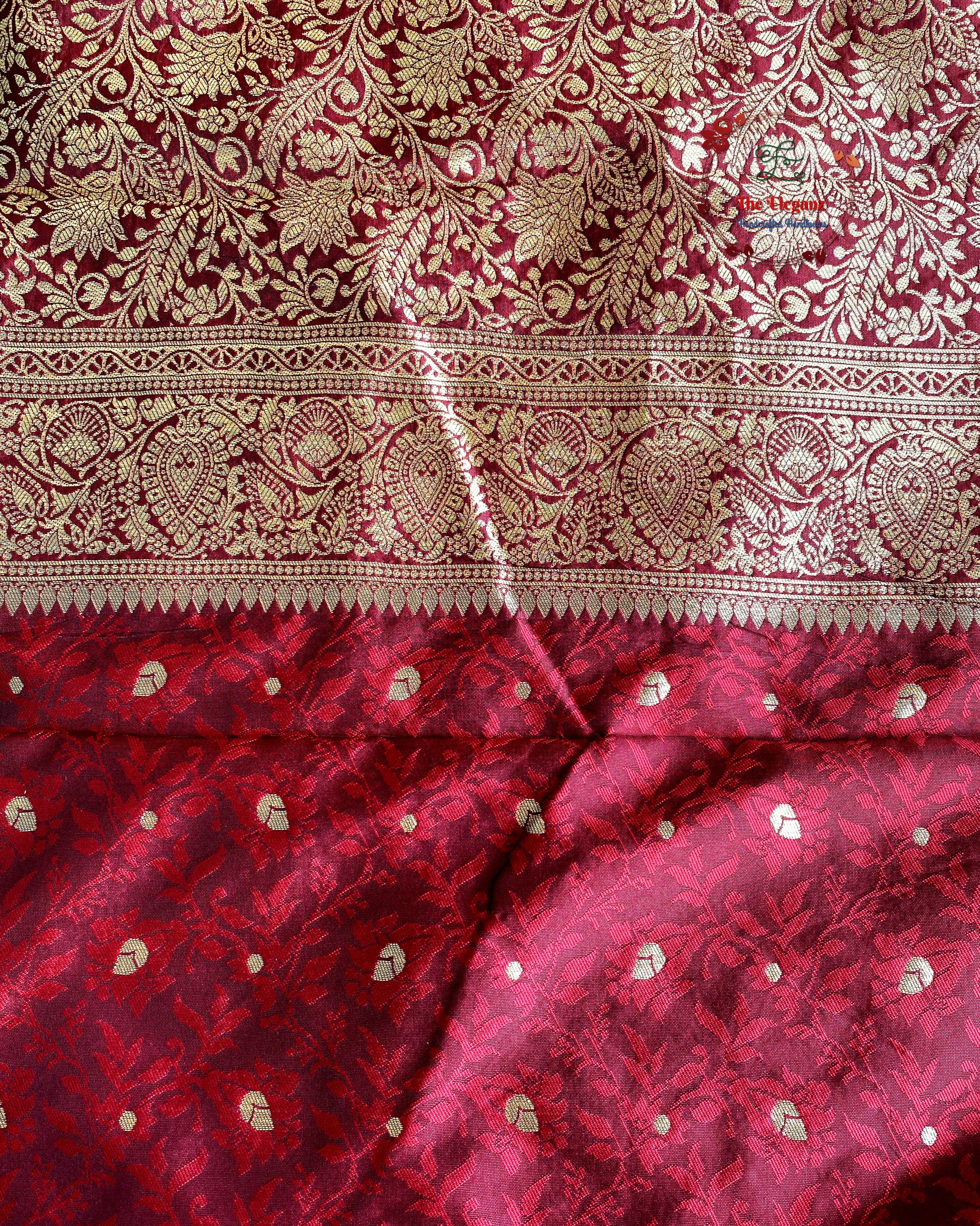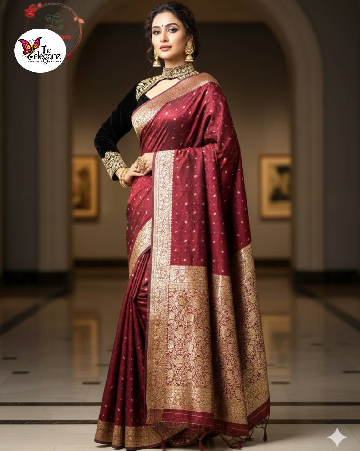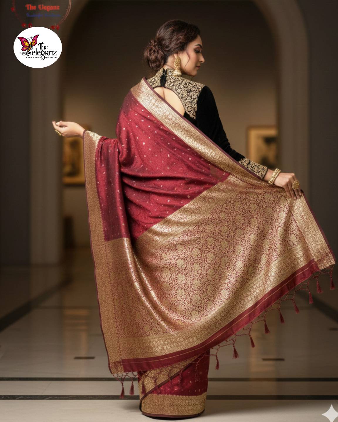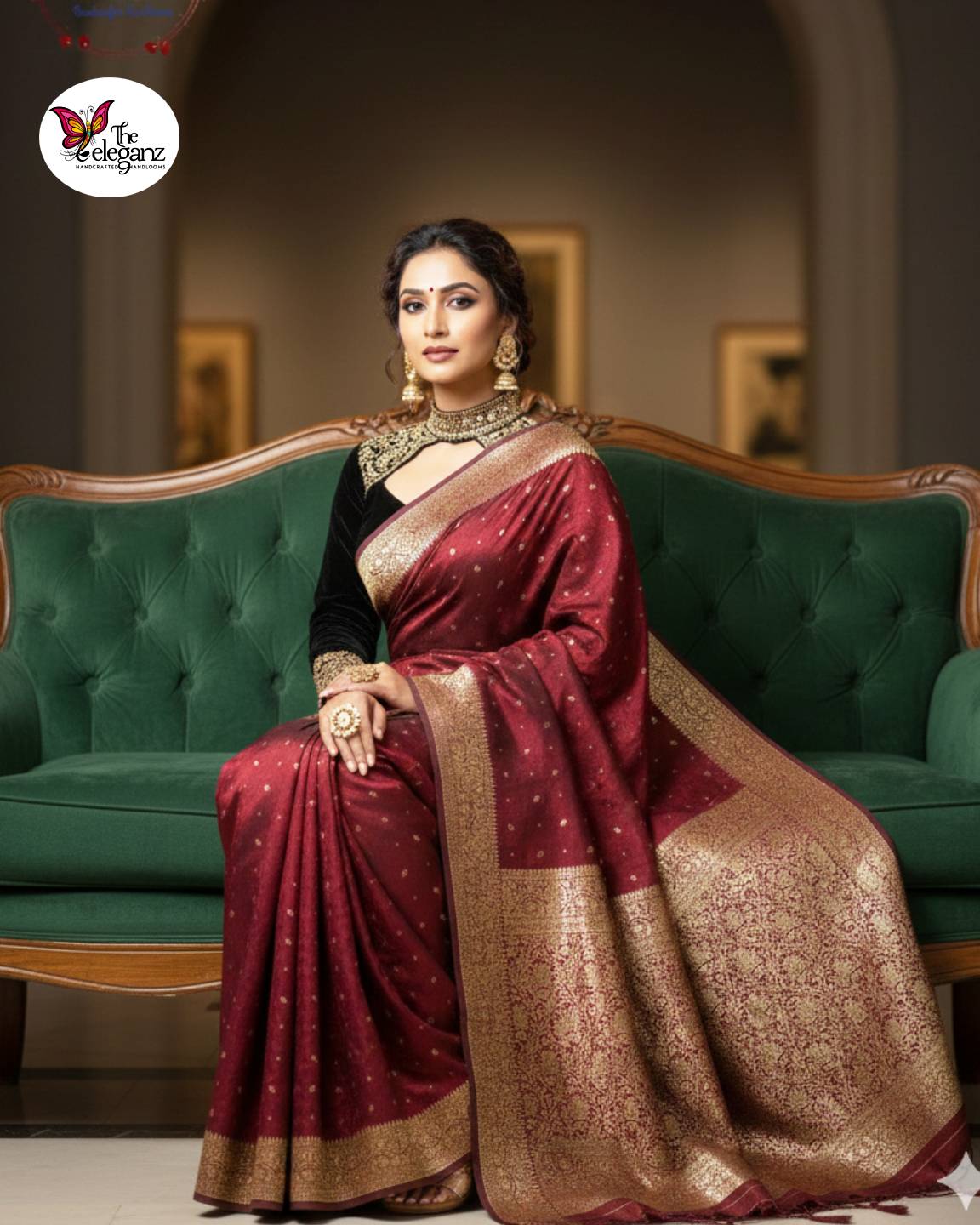 Wine Luxe is a statement semi-Pashmina soft silk saree designed for elegant evenings and grand celebrations. Drenched in a deep wine-maroon hue, this saree is elevated with delicate zari buttas and a richly detailed woven border that adds instant drama. The fabric feels soft yet structured, draping beautifully while holding its shape—perfect for weddings, receptions, festive nights, and special occasions where you want to look effortlessly powerful.